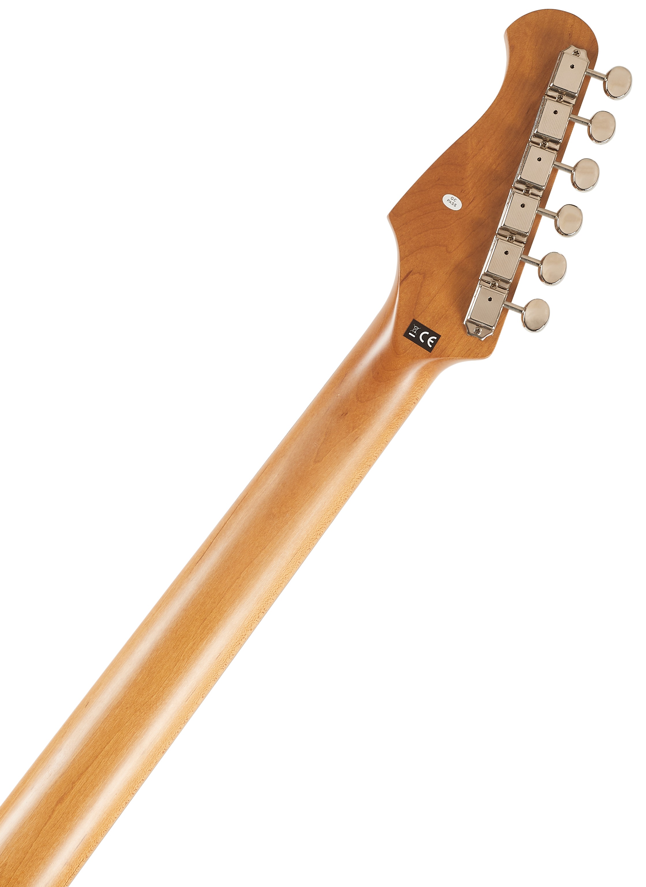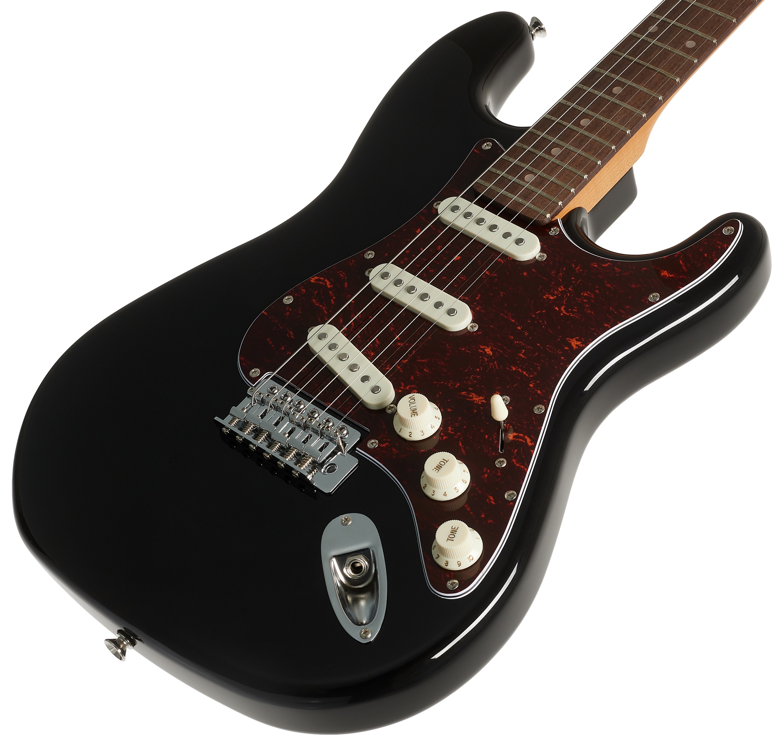 Elektrická gitara Elektrická gitara Blond STR-2 BK zo série Standard je ideálnou voľbou pre začínajúcich rockerov a rockerky. Ide o nástroj s tradičným tvarom ST a všetkými prvkami, ktoré si s týmto typom gitary spájate – od snímačov typu ST s jednou cievkou, cez synchronizované tremolo až po pickguard. Telo gitary je vyrobené z lipového dreva. Javorový krk je prilepený k figovému hmatníku osadenému dvadsiatimi dvoma pražcami. Vďaka tepelnej úprave krku (karamelizovaný javor) je drevo stabilnejšie a zároveň
