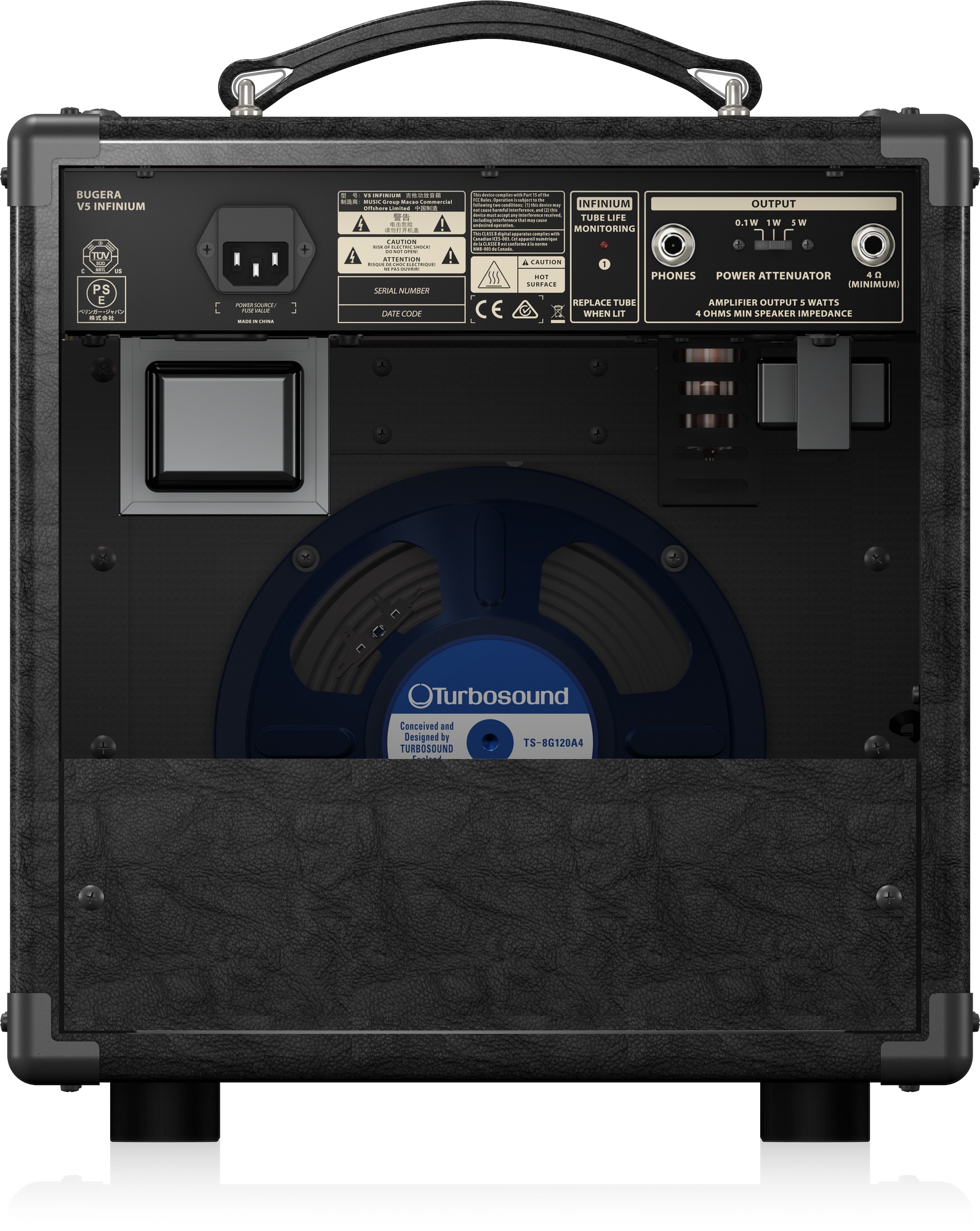 Gitarové lampové kombo Bugera V5 INFINIUM je kompaktné jednokanálové lampové gitarové kombo s prepínateľným výkonom (5, 1, 0,1 W) vhodné na domáce cvičenie alebo ako čistý zosilňovač na nahrávanie. Vintage dizajn komba podporuje aj vintage „zvuk“, kde vám poskytne ako krásne čistý zvuk, tak aj bluesový/rockový crunch. Kombo ponúka aj zabudovaný efekt reverb, výstup na slúchadlá a výstup na externý reproduktor s minimálnou impedanciou 4 ohmy. Použitie technológie INFINIUM Tube Life Multiplier predlžuje život