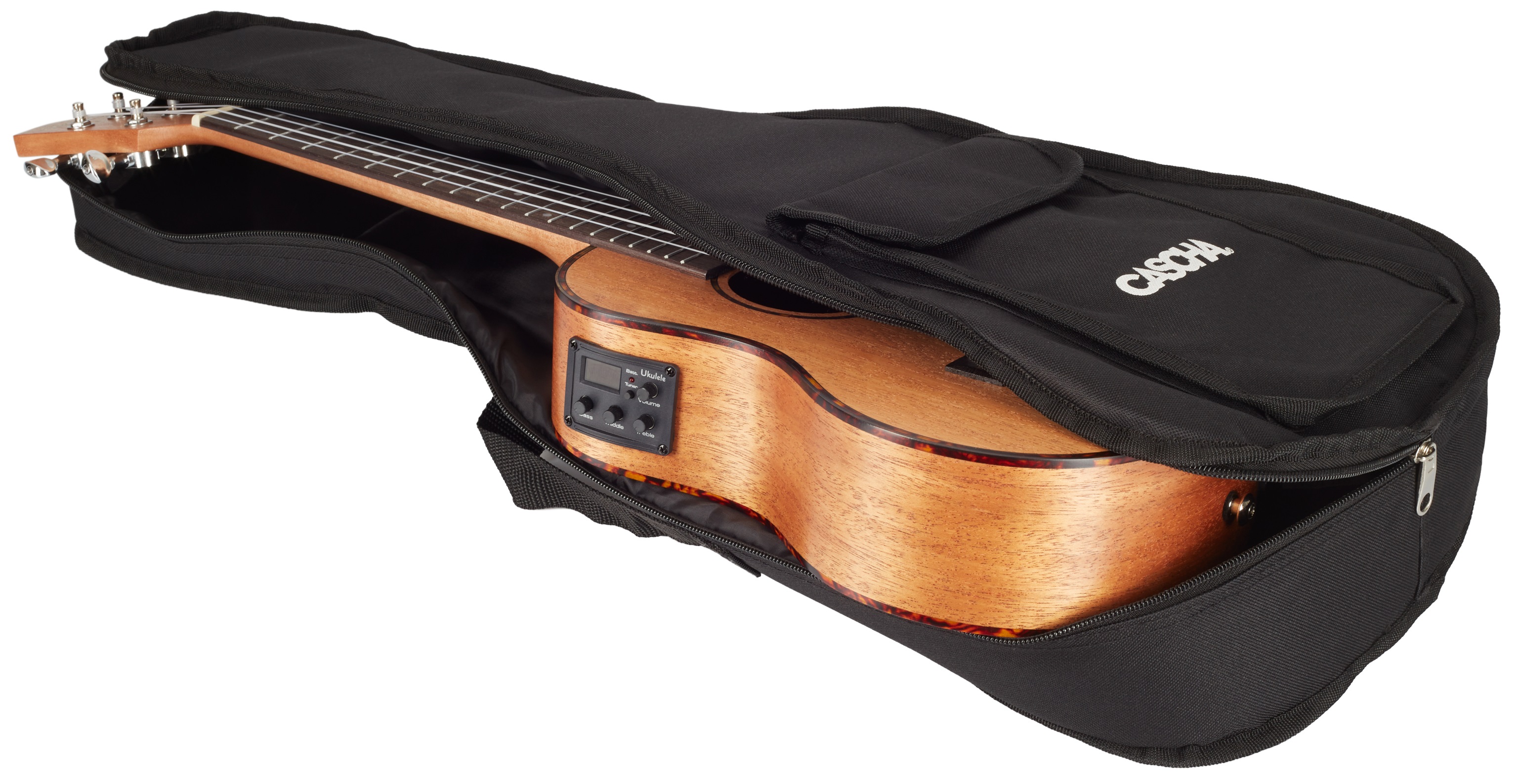 Elektroakustické ukulele Tenor ukulele Cascha Premium je cenovo dostupný nástroj, ktorý poteší deti aj dospelých. Spolu s ukulele dostanete praktické polstrované puzdro (hrúbka polstrovania 5 mm) a tri trsátka, takže môžete okamžite vyraziť za zábavou k vode, na skaly, k moru… kamkoľvek to len pôjde. Telo ukulele je vyrobené z mahagónu. Palisandrový hmatník je rozdelený šestnástimi pražcami (rovnaký materiál je použitý aj na hmatník). Struny sú osadené v pochrómovaných ladiacich mechanikách gitarového typ