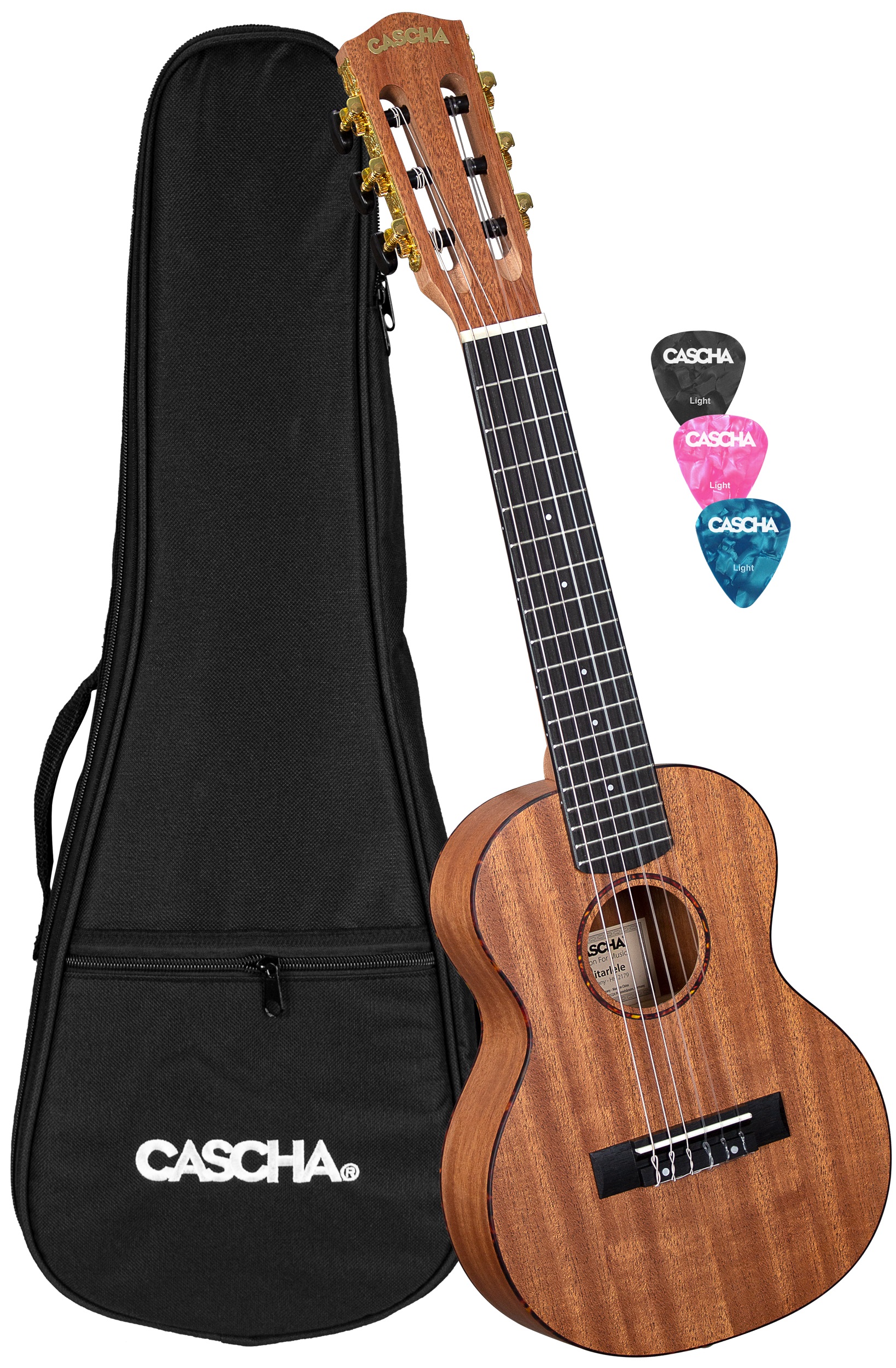 Akustické ukulele Gitarové ukulele Cascha HH 2179, známe aj ako guitalele, je hudobný nástroj, ktorý kombinuje kompaktný tvar ukulele s hernými vlastnosťami klasickej gitary. Určite poteší široké spektrum hudobníkov vrátane ortodoxných gitaristov, ktorí si gitaru užijú v lete pri vode alebo v zime pri nebudú sa musieť učiť nové hmatníky. Telo ukulele je vyrobené z laminovaného mahagónu. K mahagónovému krku je prilepený palisandrový hmatník s osemnástimi pražcami. Struny sú osadené ladiacimi mechanikami v kl