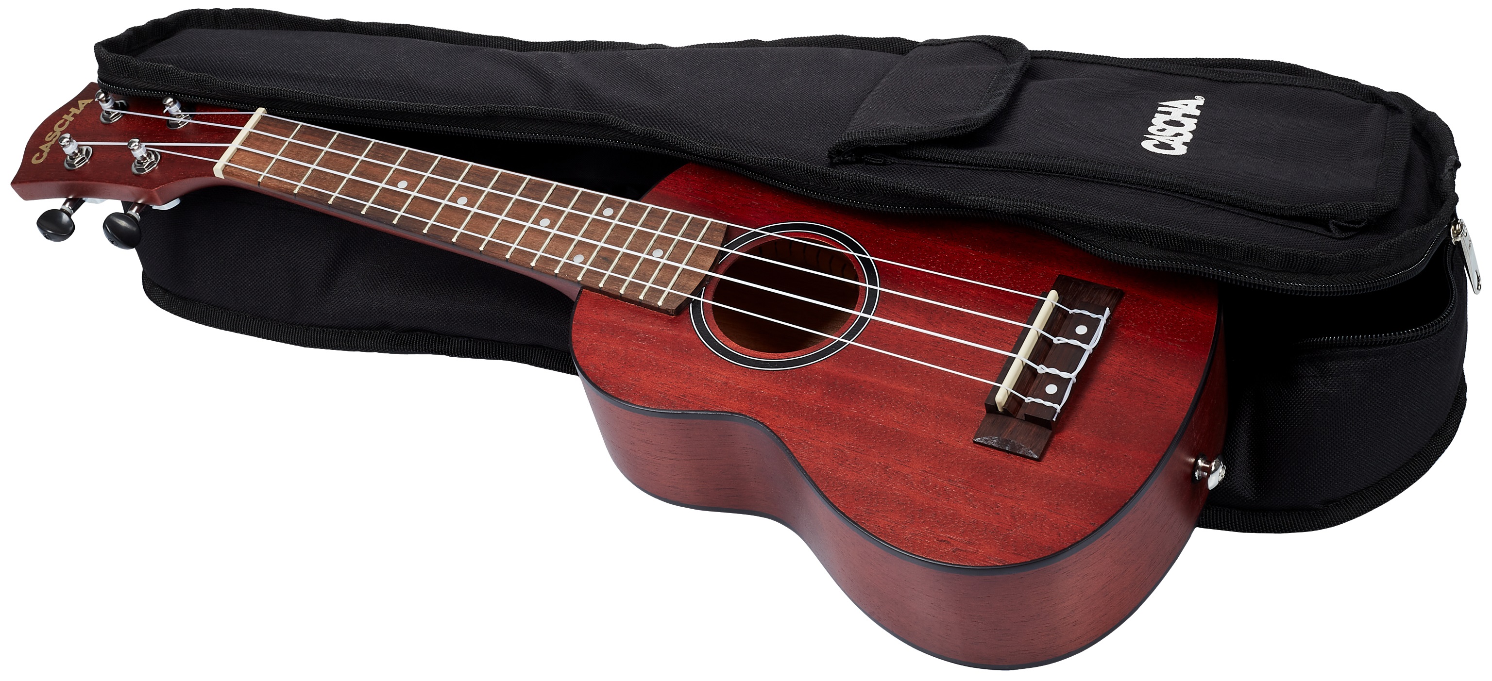 Akustické ukulele Sopránové ukulele Cascha Premium je cenovo dostupný nástroj, ktorý poteší deti aj dospelých. Spolu s ukulele dostanete praktické polstrované puzdro (hrúbka polstrovania 5 mm) a tri trsátka, takže môžete okamžite vyraziť za zábavou k vode, na skaly, k moru… kamkoľvek to len pôjde. Telo ukulele je vyrobené z mahagónu. Palisandrový hmatník je rozdelený šestnástimi pražcami (rovnaký materiál je použitý aj na hmatník). Struny sú osadené v pochrómovaných ladiacich mechanikách gitarového typu.