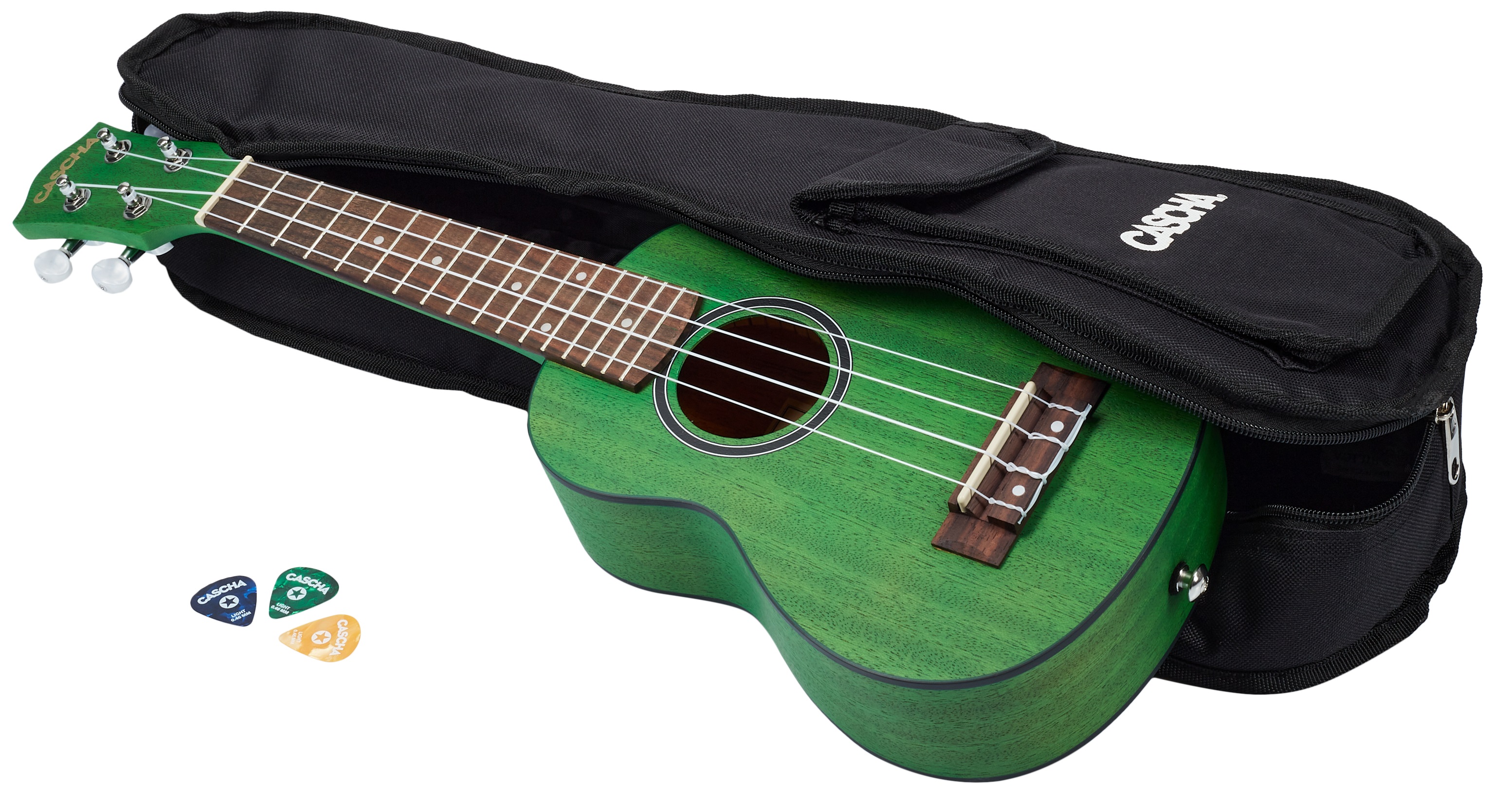 Akustické ukulele Sopránové ukulele Cascha Premium je cenovo dostupný nástroj, ktorý poteší deti aj dospelých. Spolu s ukulele dostanete praktické polstrované puzdro (hrúbka polstrovania 5 mm) a tri trsátka, takže môžete okamžite vyraziť za zábavou k vode, na skaly, k moru… kamkoľvek to len pôjde. Telo ukulele je vyrobené z mahagónu. Palisandrový hmatník je rozdelený šestnástimi pražcami (rovnaký materiál je použitý aj na hmatník). Struny sú osadené v pochrómovaných ladiacich mechanikách gitarového typu.