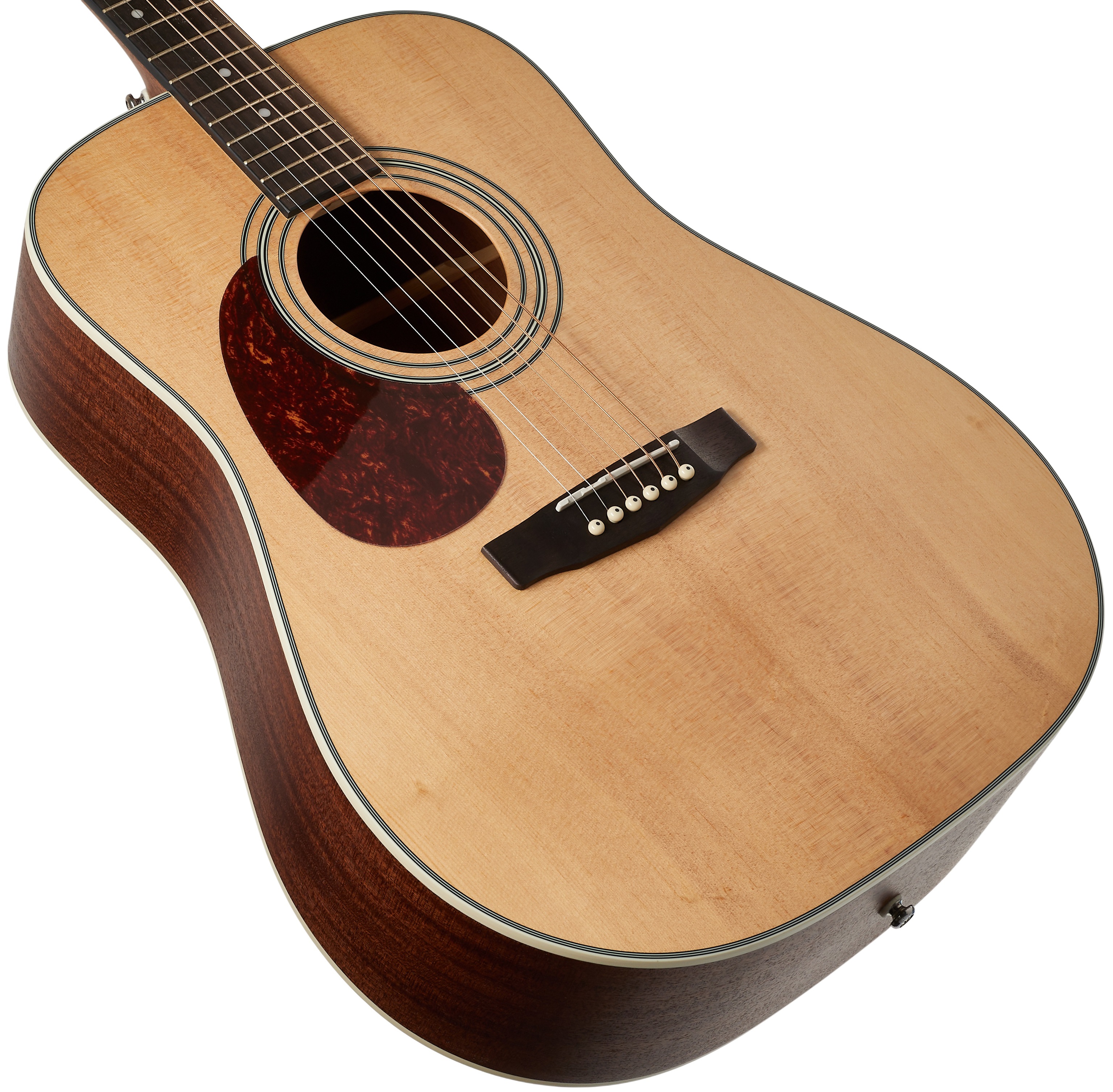 Ľavoruká akustická gitara Séria Earth od spoločnosti Cort je rad kvalitne spracovaných akustických gitár typu dreadnought v tradičnom aj vintage štýle. Vďaka polomasívnej konštrukcii tela a cenovej dostupnosti sú dobrou voľbou pre začiatočníkov aj skúsených hráčov. Predná doska ľavorukého modelu Earth 70 je vyrobená z masívneho smreka Sitka, zatiaľ čo zadná doska a luby sú z prelamovaného mahagónu. Táto osvedčená kombinácia drevín dodáva nástroju vyvážený zvuk s potrebným množstvom tónovej čistoty a tepla.
