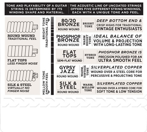 Kovové struny na akustickú gitaru Struny D’Addario Flat Tops vynikajú hladkým povrchom, vďaka čomu sú pri hraní tichšie, čo je obzvlášť užitočné pri nahrávaní, kde je počuť každý nežiaduci zvuk. Zvukovo ide o teplé struny s frekvenčne vyváženým tónom. Ich jadro je vyrobené z tradičnej uhlíkovej ocele, zatiaľ čo ovinutie je z fosforového bronzu. Hrúbka strún: .010/.014/.023/.030/.039/.047