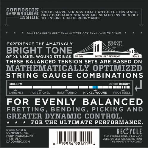 Struny na elektrickú gitaru Struny D’Addario XL pre elektrickú gitaru sú už dlhodobo bestsellerom vo svete gitarových strún a je nepravdepodobné, že by niekedy vyšli z módy. Sú osvedčeným zlatým štandardom, ktorý je populárny už od roku 1974, takže si môžete byť istí, že vás nesklamú. Základom je šesťhranné oceľové jadro, ktoré zaisťuje perfektnú intonáciu, dlhú životnosť a konzistentný pocit pri hre. Ovinuté struny sú potiahnuté niklovaným oceľovým drôtom, čo im dodáva frekvenčne vyvážený