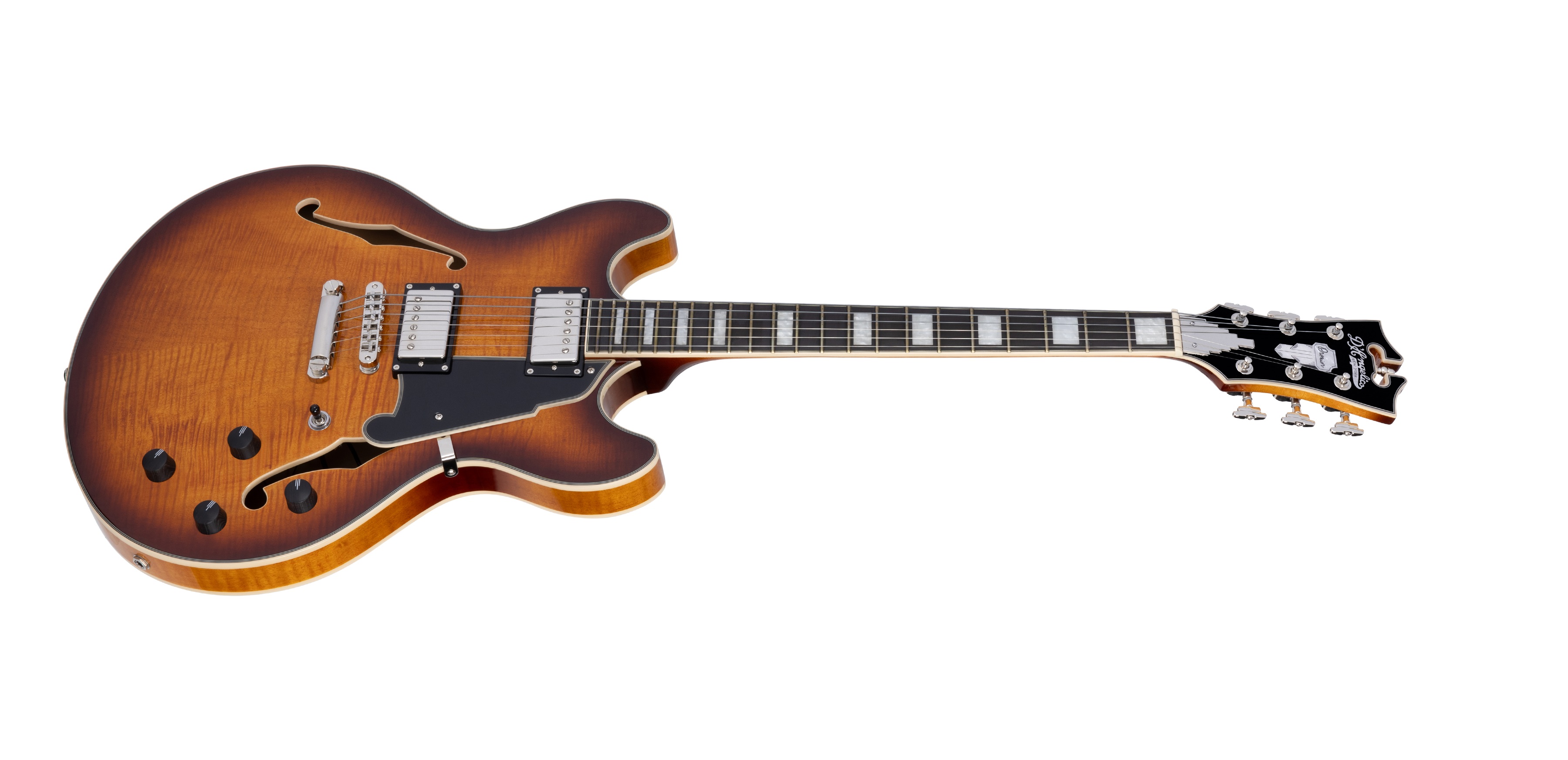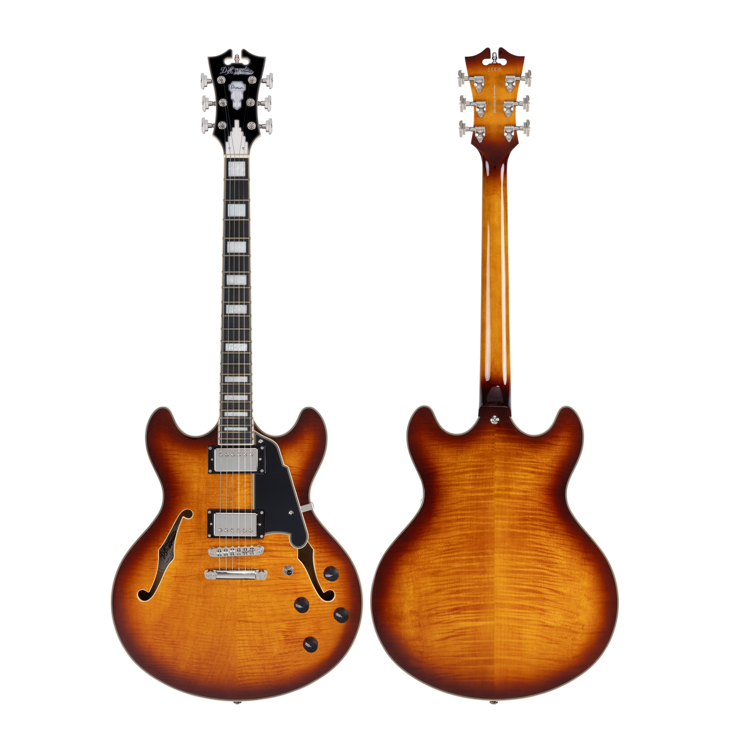 Semiakustická gitara Rad Premier predstavuje cenovo dostupnejšie nástroje v portfóliu značky D’Angelico, ktoré však spĺňajú všetky požiadavky na kvalitu remeselného spracovania spojené s touto značkou. Polodutý model DC je odpoveďou spoločnosti na rastúci dopyt po gitarách s dvoma výrezmi. Polodutá konštrukcia modelu PREMIER DC Dark Iced Tea Burst je vyrobená z laminovaného fládrovaného javora a centrálneho bloku. K javorovému krku je prilepený pau ferro hmatník osadený dvadsiatimi dvoma pražcami veľkosti M