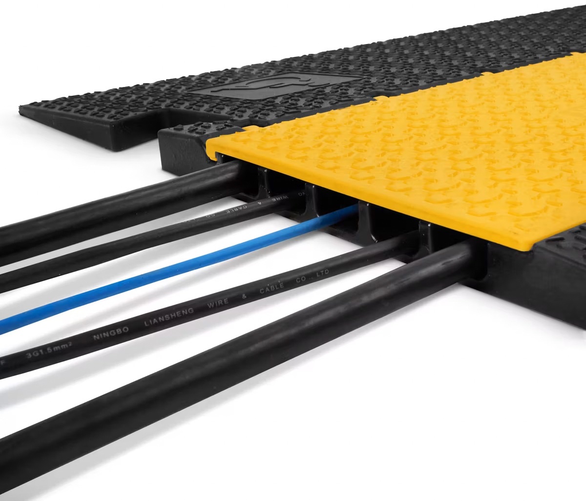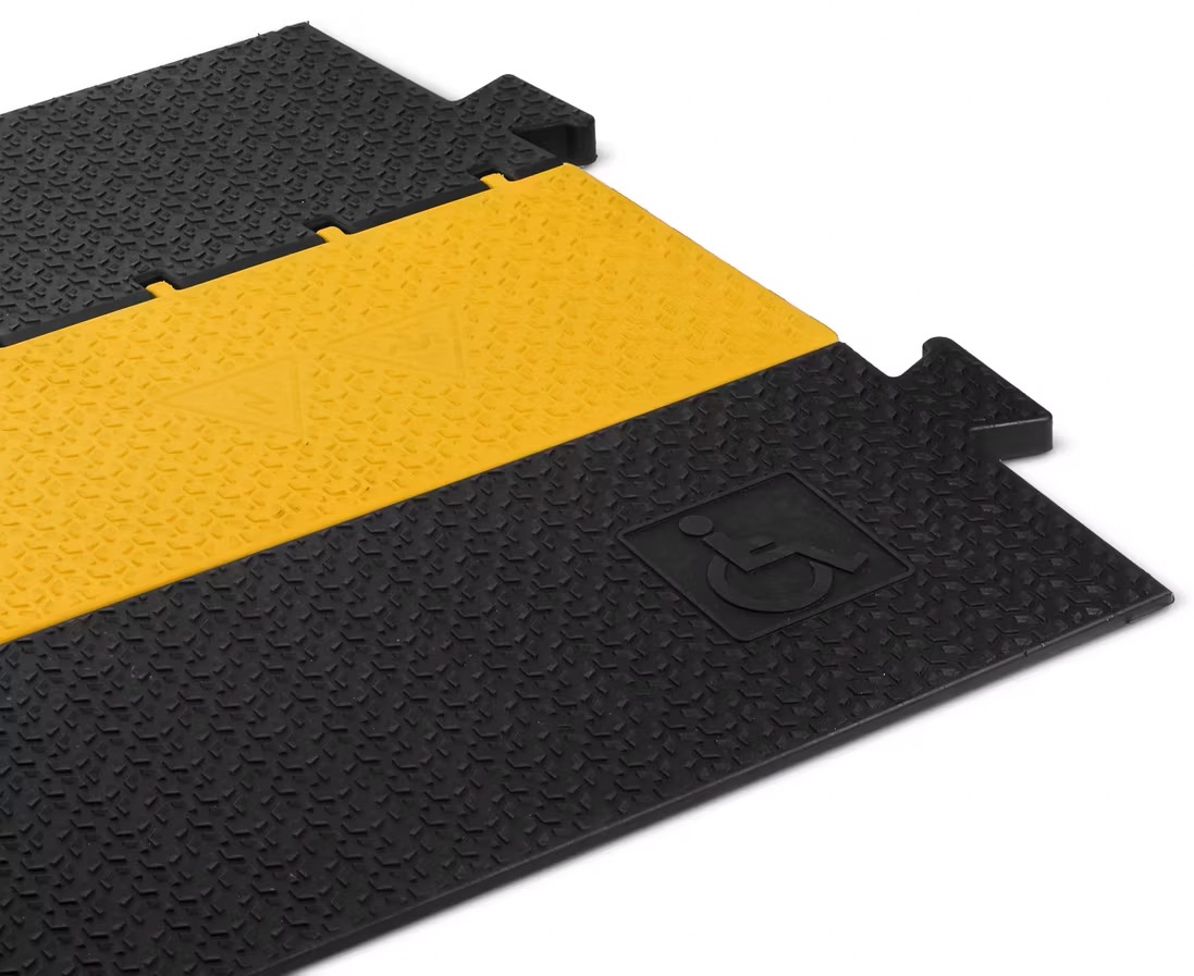 Káblový prejazd Káblový priechod Defender SLIM 5 chráni káble pred mechanickým poškodením a zabezpečuje ich bezpečné usporiadanie a vedenie v oblastiach s vysokou hustotou premávky. Jeho odolná konštrukcia z recyklovaného polyuretánu a protišmykový povrch 3D LaserGrip zabezpečujú ľahký prechod vozidiel a minimalizujú riziko zakopnutia alebo pošmyknutia. Prechod má päť káblových kanálov s rozmermi 34 x 20 mm a nosnosťou až 5 ton. Vďaka tomu je ideálny na použitie na festival