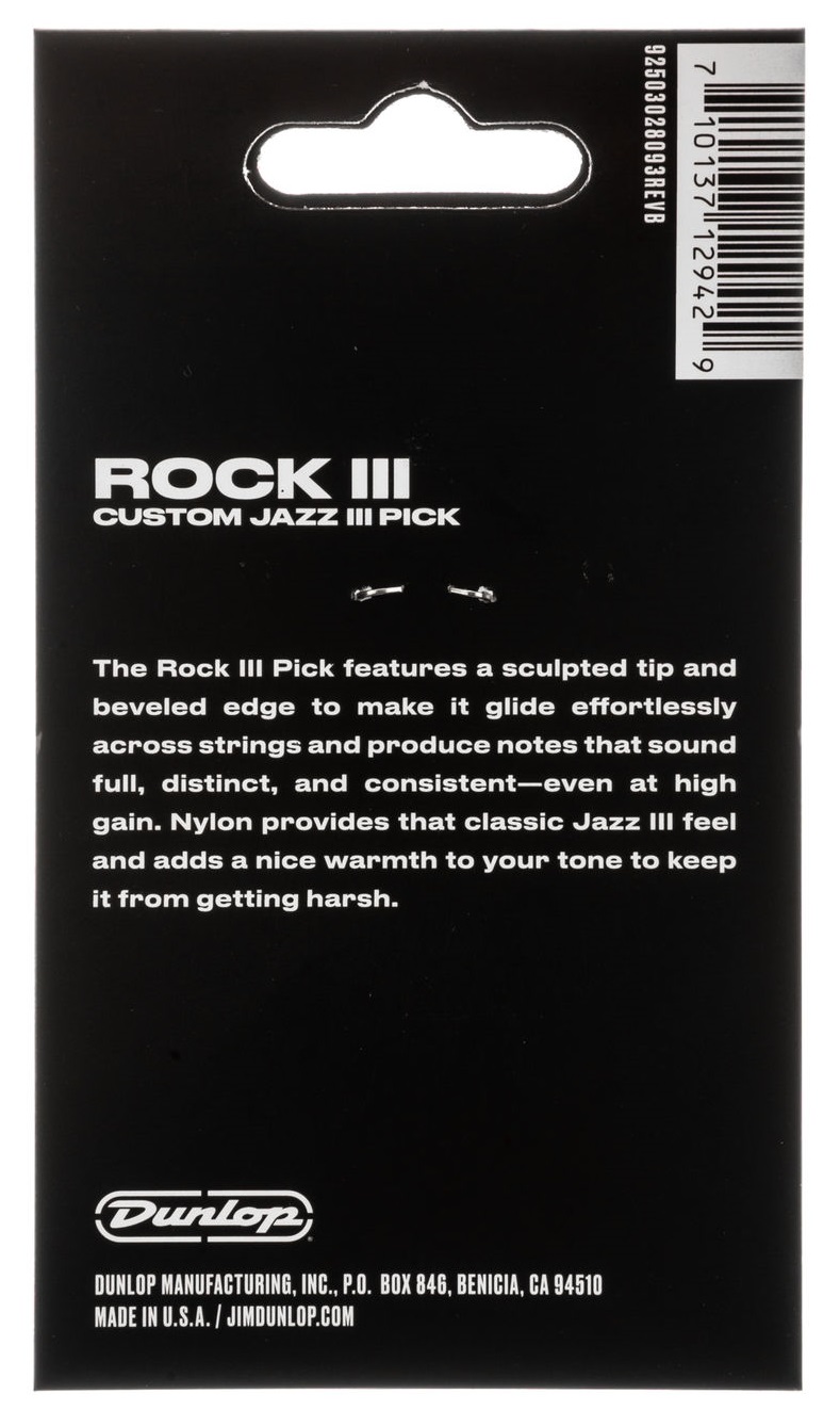 Brnkátka Tento nový snímač Rock III vychádza z obľúbeného tvaru Jazz III, ale vďaka tvarovanej špičke poskytuje čitateľnejší a konzistentnejší zvuk aj pri výraznejšom skreslení. Navyše vďaka zaobleným okrajom ponúka lepší sklz po strunách, takže sa nemusíte obávať ich odporu pri rýchlej hre. Strunník je vyrobený z nylonu, ktorý mu dodáva teplý zvuk a pohodlný pocit pri hraní. Strunníky Dunlop snáď netreba predstavovať. Táto kalifornská spoločnosť vyrába git