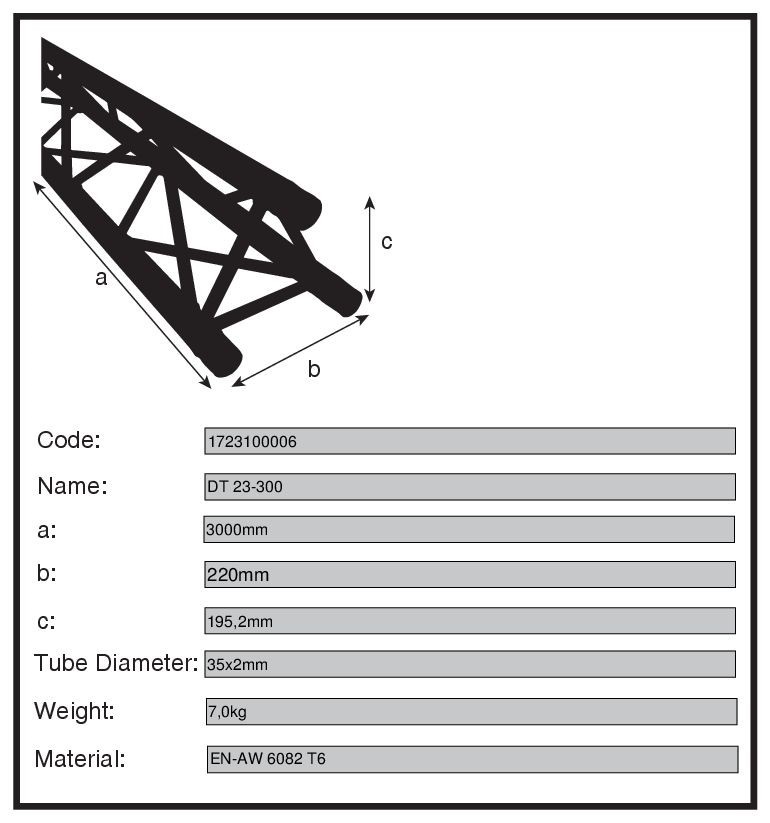 Stavebná konštrukcia DuraTruss DT 23-250 je robustná trojbodová hliníková konštrukcia s dĺžkou 250 cm, ktorá sa používa na stavbu mimoriadne stabilných a bezpečných mobilných pódií. Vďaka inovatívnemu systému spojovania zaručuje bleskovú montáž a demontáž, čo je ideálne pre časté používanie. Hlavné rúrky konštrukcie sú vyrobené z robustného 35 mm hliníka s hrúbkou steny 2 mm, čo zaručuje ideálny pomer pevnosti a nízkej hmotnosti. Spojovacie rúrky majú priemer 8 mm. Vďaka tomu je systém niel