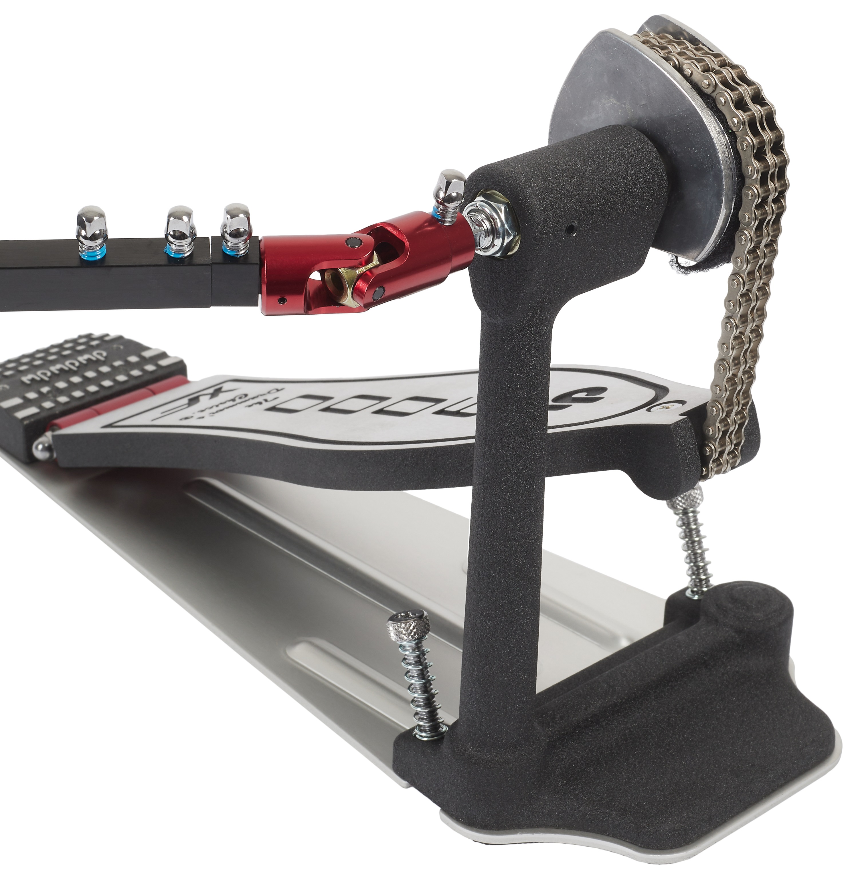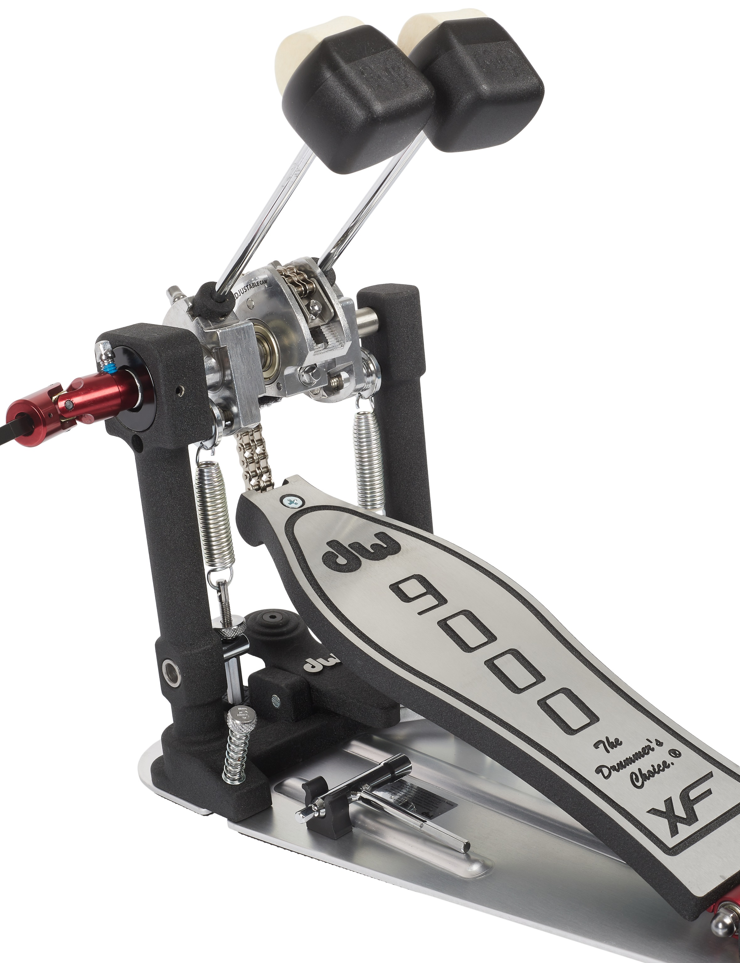Double pedál k basovému bubnu DW 9002 XF Tento pedál pre dvojitý basový bubon používa dvojitý reťazový prevod, ale možno ho nahradiť prevodom s nylonovým remeňom. Je vyrobená z hliníka a ocele, jej šľahač umožňuje prácu s plsteným alebo plastovým povrchom a samozrejme sa dá nastaviť podľa vašich potrieb. Jedinečné je použitie nastaviteľného prevodu, ktorým môžete reagovať na priebeh prenosu energie z pedálu na beater. Model XF je vybavený 1-palcovým predĺžením pedálu, vďaka čomu sa na ňom hrá pohodlnejšie a