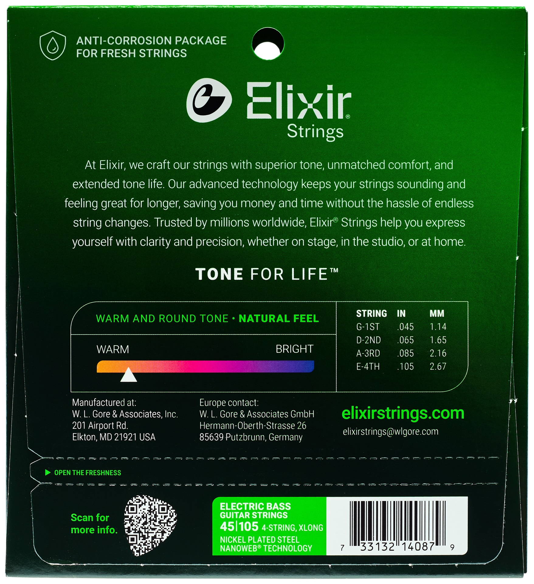 Struny na basgitaru Struny Elixir sú známe svojou extrémne dlhou životnosťou, ktorej sa len veľmi ťažko vyrovnajú. Vďaka špeciálnemu poťahu sú odolné voči korózii, vlhkosti, špine a potu, takže si dlho zachovávajú čistý a prenikavý tón. V tejto sade nájdete basové struny s extra dlhou stupnicou vinuté poniklovanou oceľou, vďaka čomu majú teplý a zaoblený zvuk. Sú potiahnuté ochrannou vrstvou Nanoweb, vďaka ktorej sú mimoriadne odolné a hladšie ako bežné struny, čo znižuje h