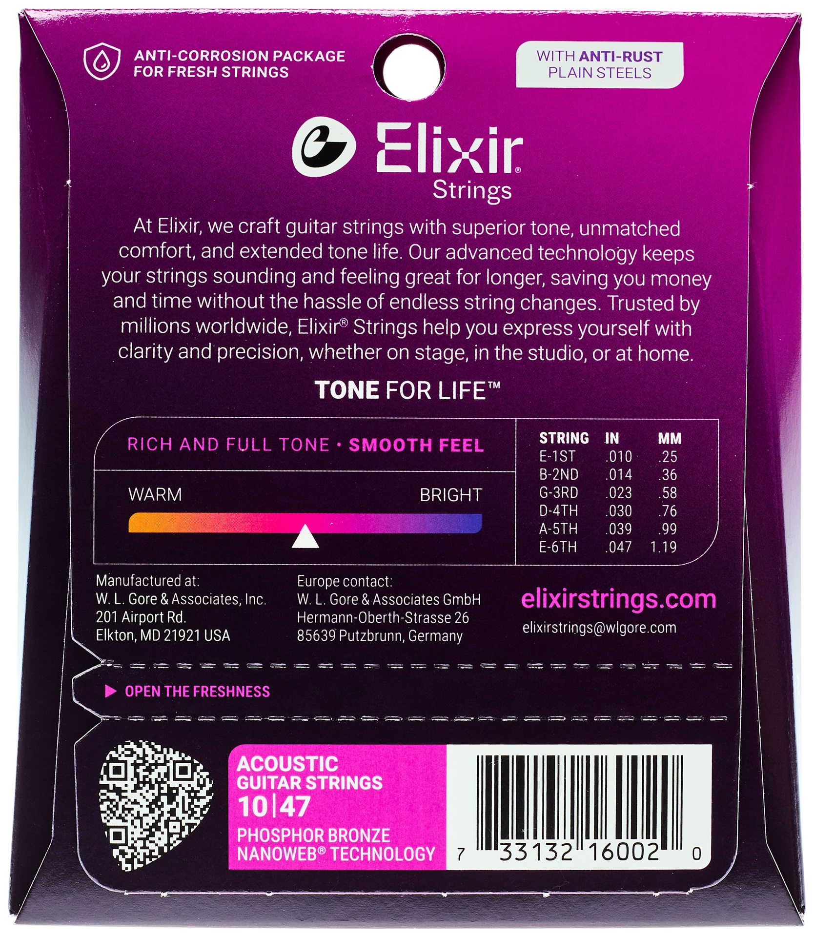 Kovové struny na akustickú gitaru Struny Elixir sú známe svojou mimoriadne dlhou životnosťou, ktorej je veľmi ťažké konkurovať. Vďaka špeciálnemu povlaku sú odolné voči korózii, vlhkosti, nečistotám a potu, takže si dlho zachovávajú jasný a prenikavý tón. Po zvukovej stránke ide o veľmi silné, zvonivé a rezonujúce struny, ktoré vyniknú na akomkoľvek pódiu alebo nahrávke. Struny s označením Phosphor Bronze majú vinutie vyrobené z fosforového bronzu, ktorý im dodáva trochu tepla a farby – výs