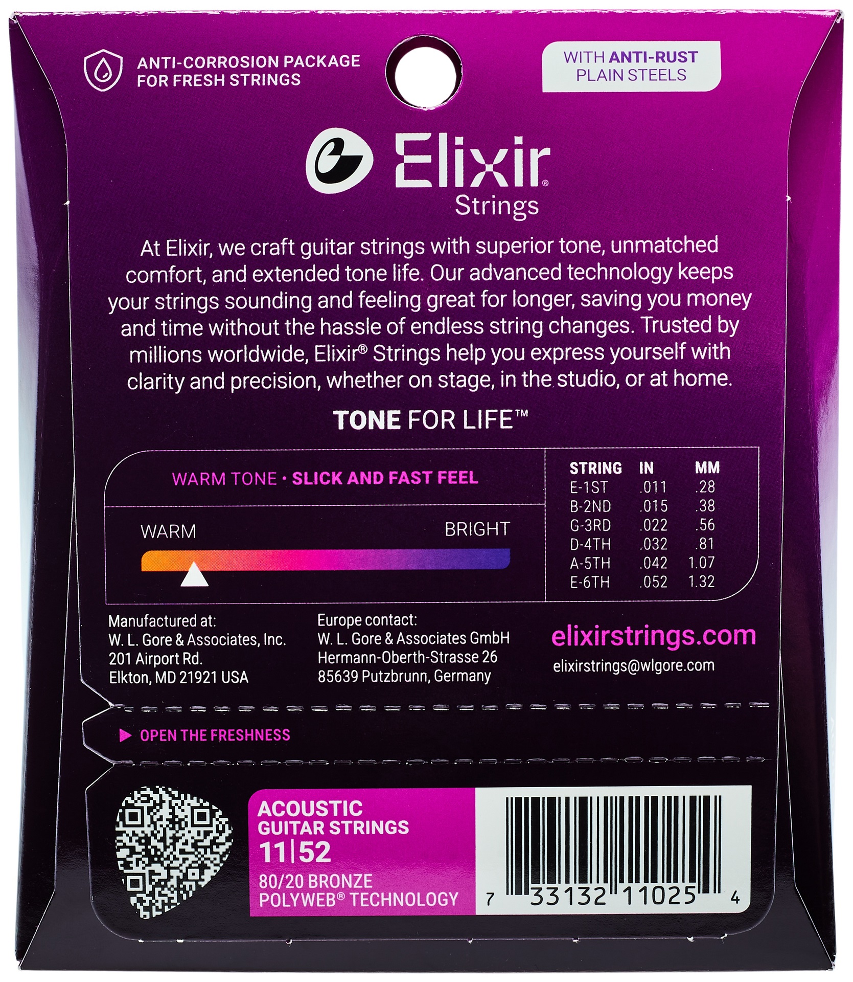 Kovové struny na akustickú gitaru Struny Elixir sú známe svojou mimoriadne dlhou životnosťou, ktorej je veľmi ťažké konkurovať. Vďaka špeciálnemu povlaku sú odolné voči korózii, vlhkosti, nečistotám a potu, takže si dlho zachovávajú jasný a prenikavý tón. Zvukovo ide o veľmi silné a rezonujúce struny, ktoré vyniknú na akomkoľvek pódiu alebo nahrávke. Struny s označením 80/20 Bronze majú vinutie vyrobené z bronzovej zliatiny (80/20), ktorá im dodáva prenikavý a zvonivý charakter. Táto sada s