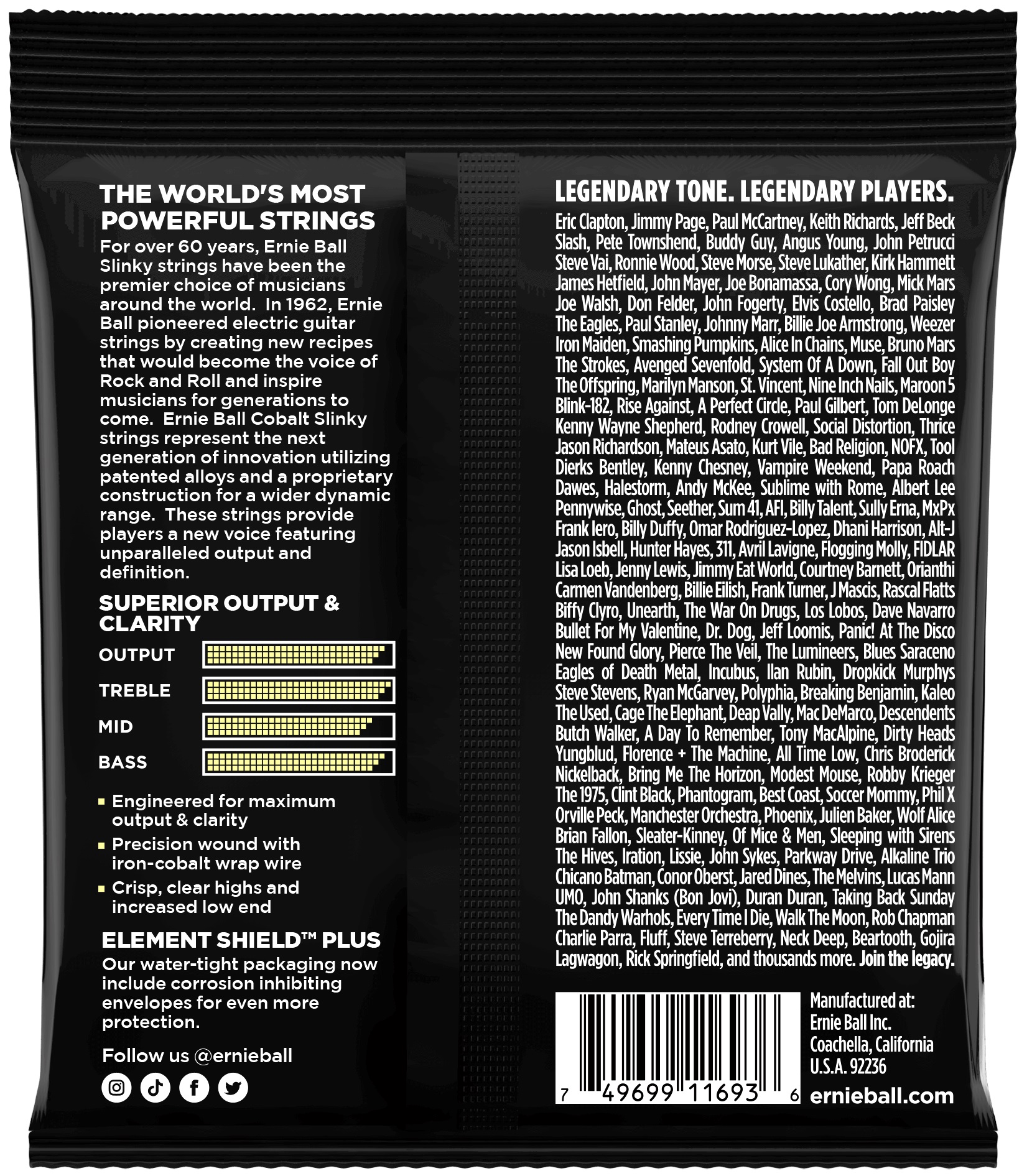 Struny na elektrickú gitaru Struny Ernie Ball Cobalt Slinky pre elektrickú gitaru boli vyvinuté s cieľom maximalizovať hlasitosť a čistotu zvuku, pričom sa pri ich výrobe použili najnovšie materiály a výrobné technológie. Vyznačujú sa širokým dynamickým rozsahom, veľkým počtom vyšších harmonických, silnejšími basmi a čistými, prenikavými výškami. Ich čaro spočíva v použití kobaltu, ktorý lepšie spolupracuje s magnetickým poľom snímačov a ponúka presné snímanie zvuku. Kobalt