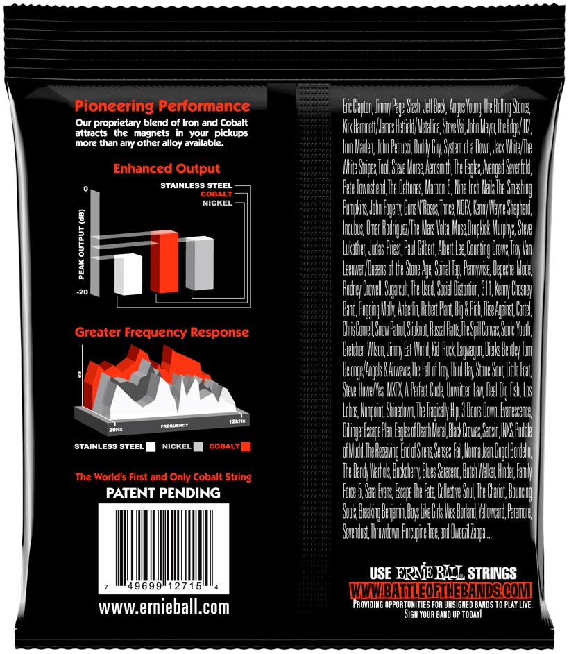 Struny na elektrickú gitaru Struny Ernie Ball Cobalt Slinky pre elektrickú gitaru boli vyvinuté s cieľom maximalizovať hlasitosť a čistotu zvuku, pričom sa pri ich výrobe používajú najnovšie materiály a výrobné technológie. Vyznačujú sa širokým dynamickým rozsahom, veľkým množstvom vyšších harmonických, silnejšími basmi a čistými, prenikavými výškami. Ich čaro spočíva v použití kobaltu, ktorý lepšie spolupracuje s magnetickým poľom snímačov a ponúka presné snímanie zvuku. K
