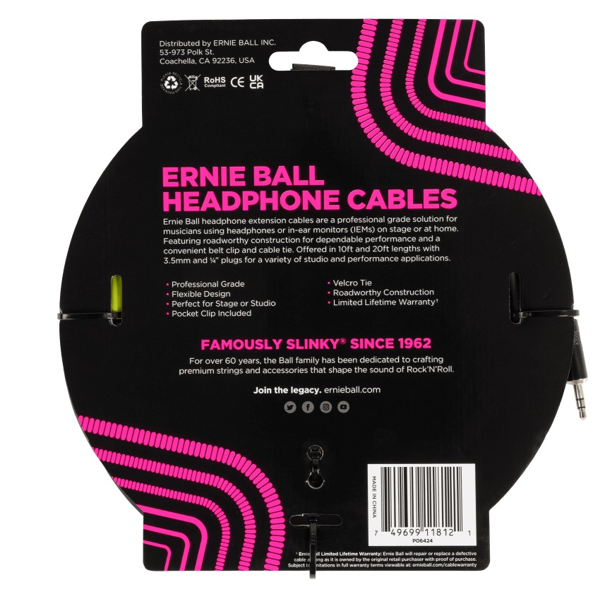 Ernie Ball Headphone Extension Cable 3.5mm to 3.5mm 10′ Black