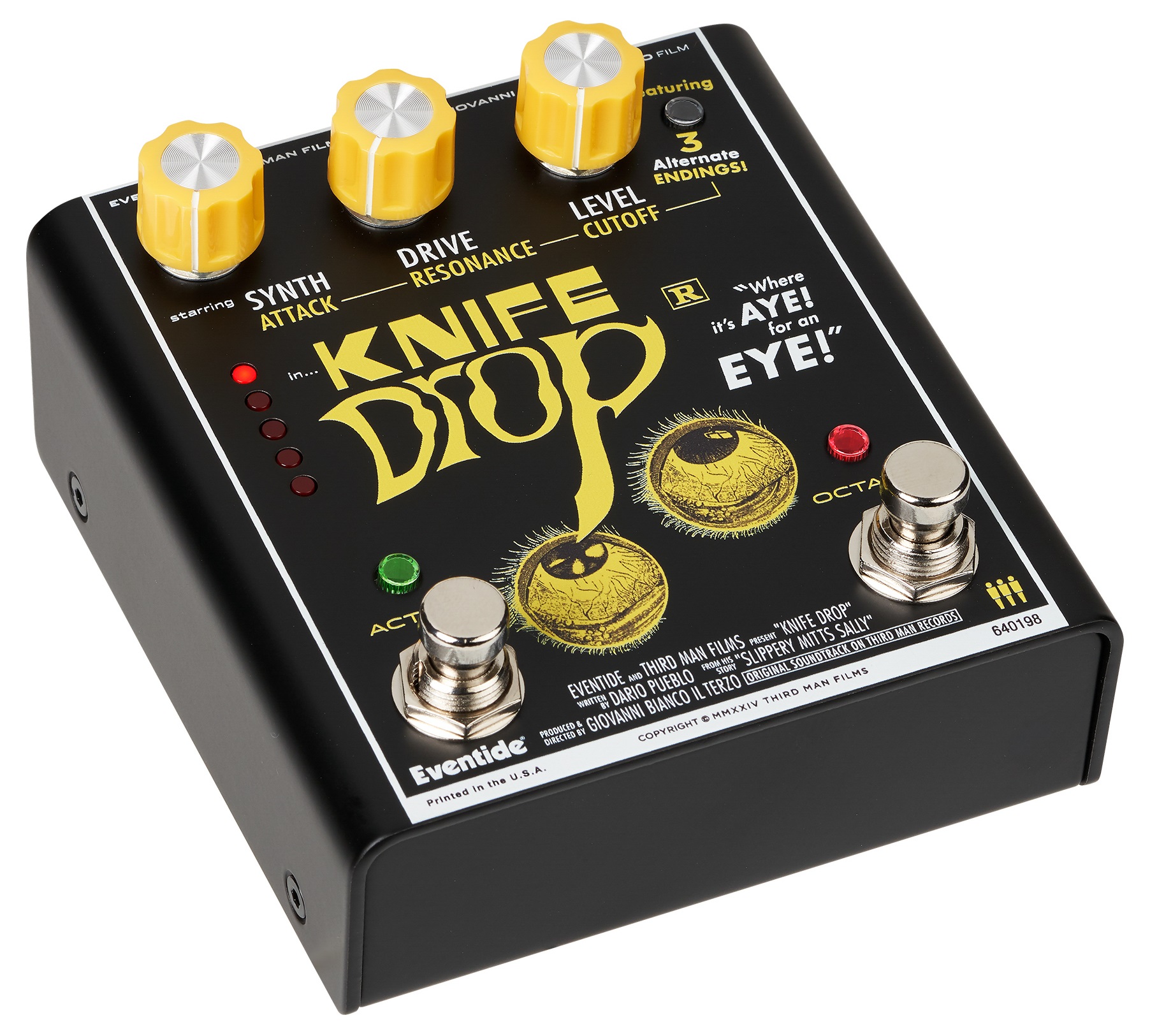 Gitarový efekt Pedálový efekt Knife Drop je výsledkom spolupráce spoločností Eventide, Third Man Hardware a známeho gitaristu Jacka Whitea. Ide o zmes oktávového fuzzu a analógového monofónneho syntetizátora, ktorej zvuk by sa dal opísať ako hororový maniakálny chaos… Čo iné by ste čakali od Jacka Whitea? Tri základné ovládacie prvky vám umožňujú: po prvé, zmiešať vstupný signál s monofónnym syntetizátorom (Synth), po druhé, ovládať mieru