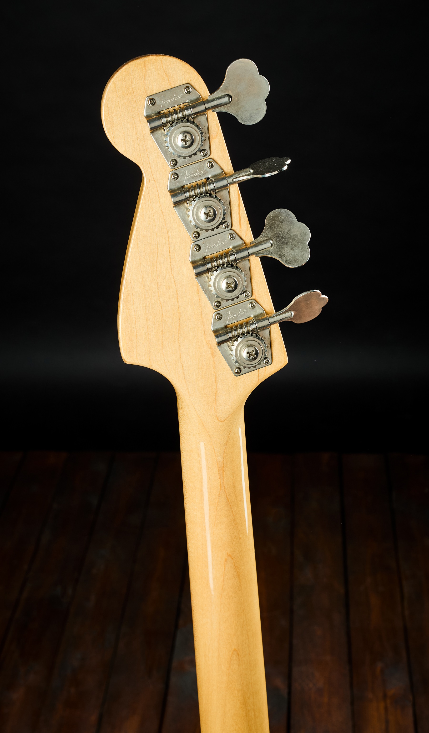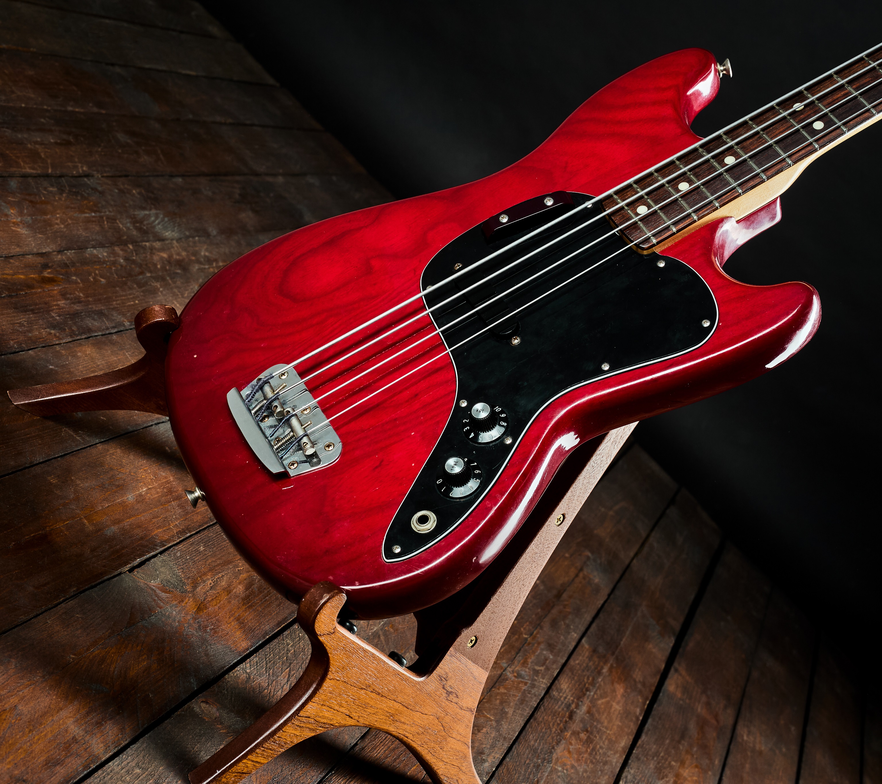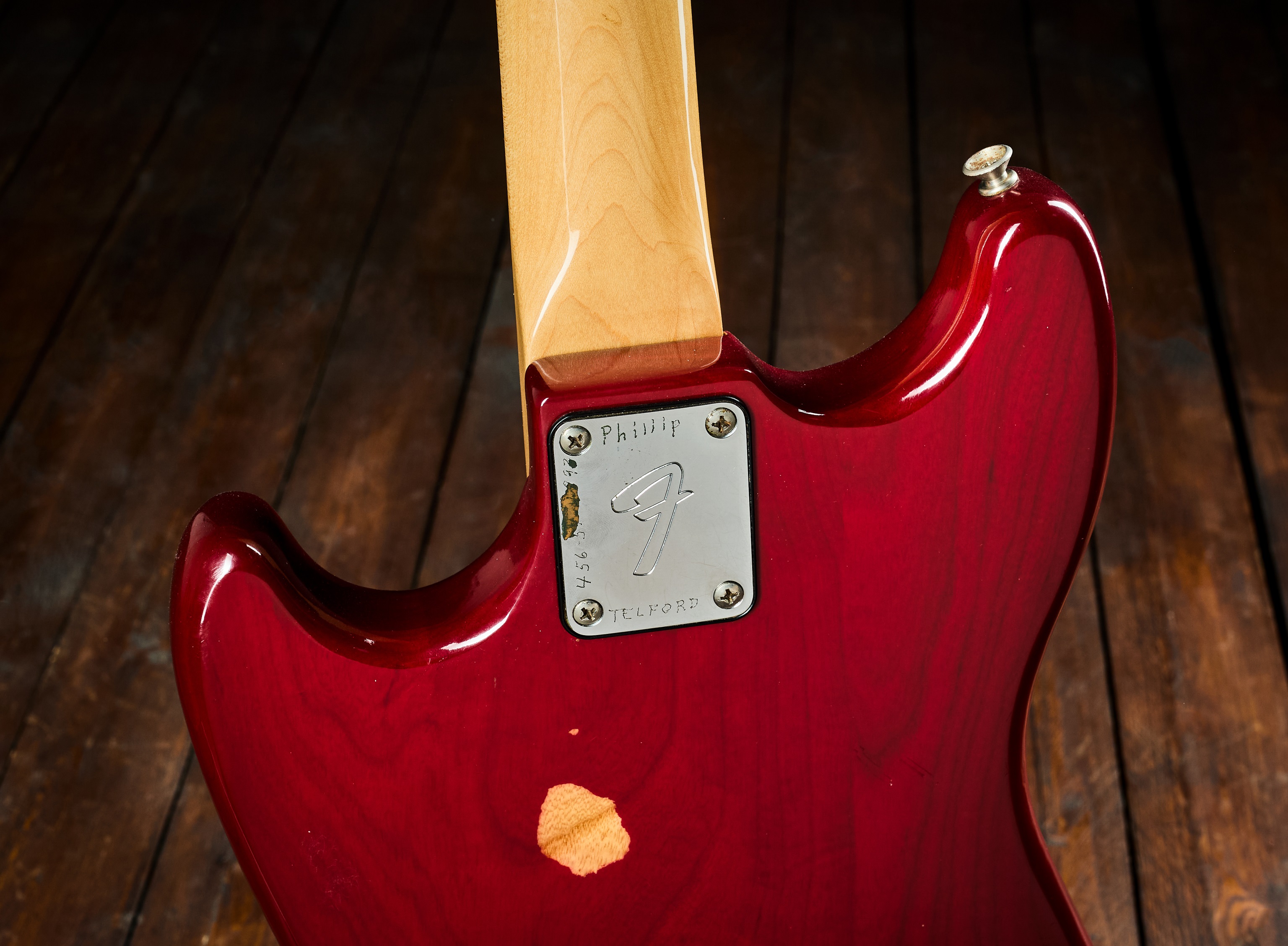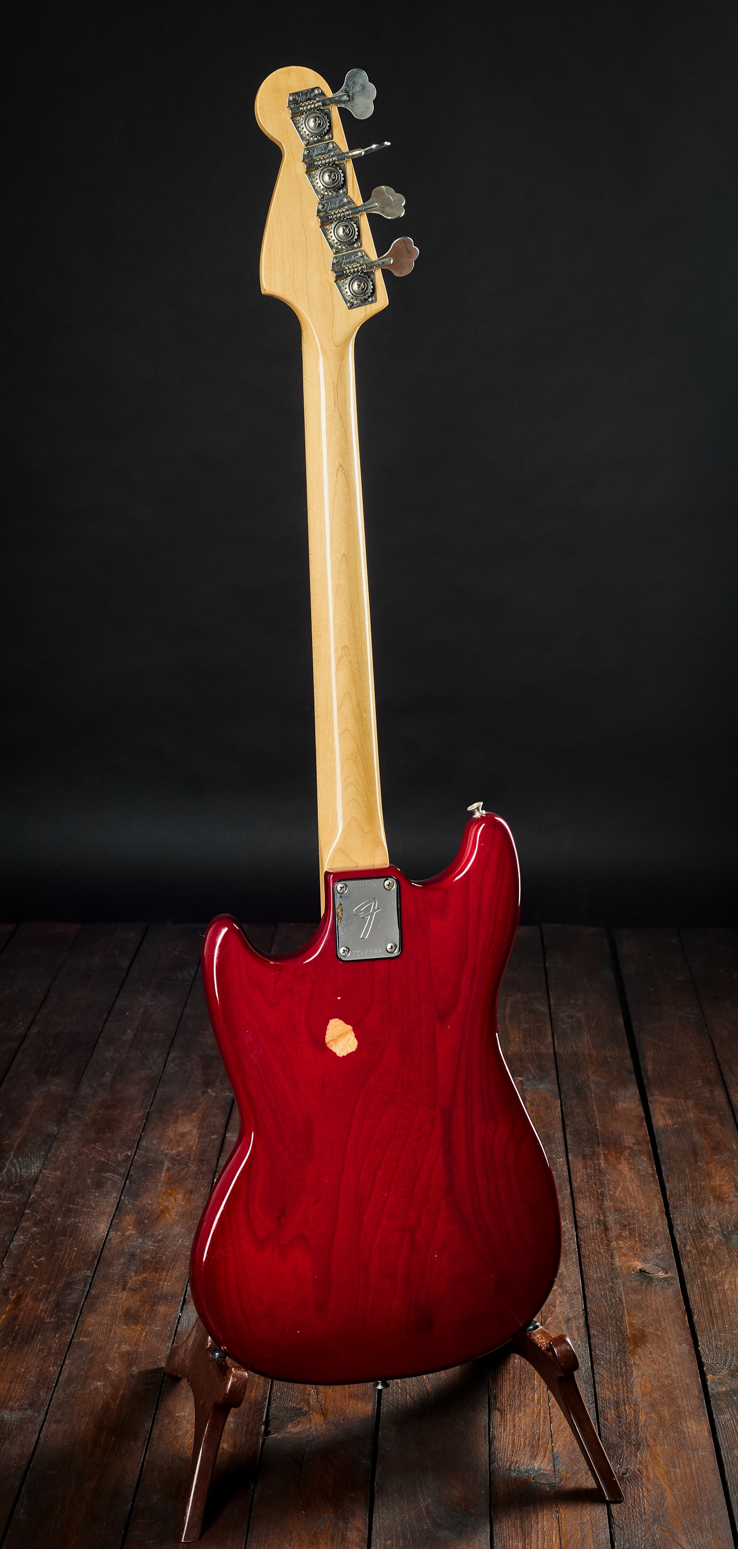 Elektrická basgitara Vintage Musicmaster Bass vyrobený v pôvodnej továrni vo Fullertone v roku 1980. Unikátny kus s telom z jaseňa (!). Na výrobu Musicmaster sa používalo topoľové drevo, menej často sa používal jaseň alebo jelša. Táto basgitara s krátkou 30″ menzúrou má telo z jasene s originálnym transparentným povrchom v odtieni Wine Red. Všetko vyzerá originálne. Snímač je datovaný rokom 1978, potenciometre sú z roku 1978. Meno predchádzajúceho majiteľa je vygravírované na spojovacej doske krku a zadná č