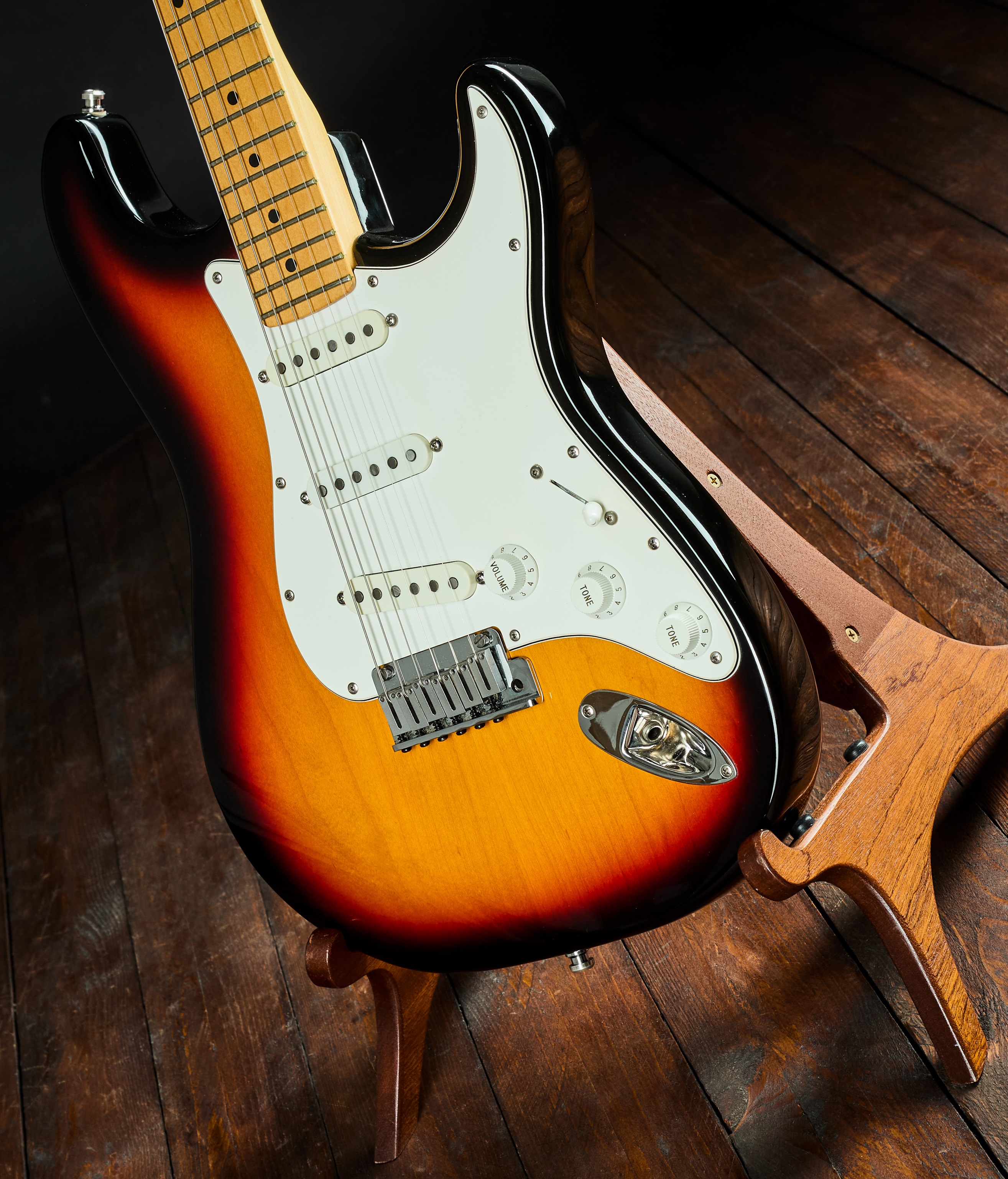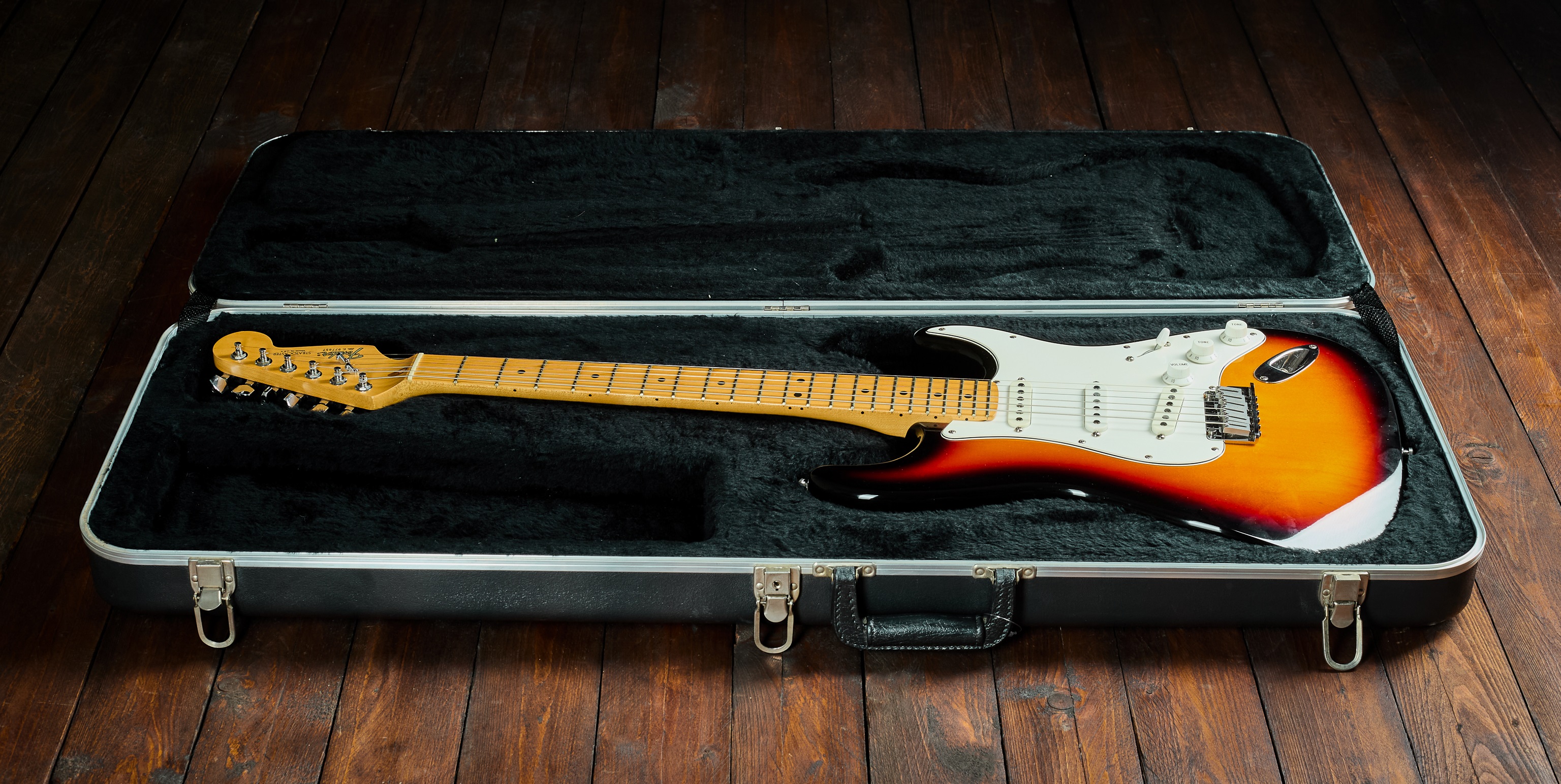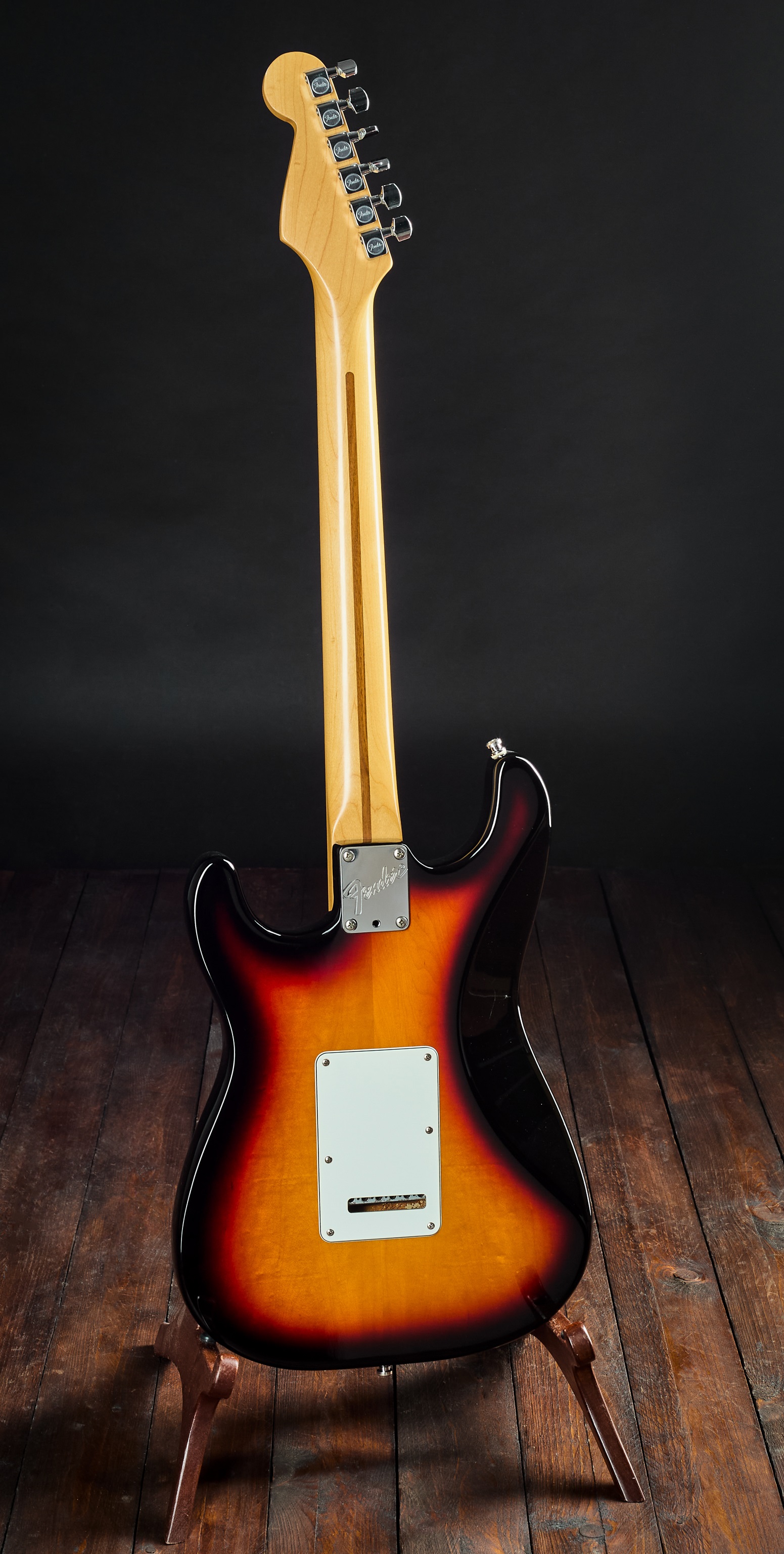Elektrická gitara Stratocaster z počiatkov výroby v súčasnej kalifornskej továrni spoločnosti Fender v roku 1989. Teraz je to zberateľský nástroj. Vynikajúci nástroj s jemnými modernými prvkami, ako je päťpolohový prepínač, masívne klávesy a tremolo uchytené na dvoch veľkých skrutkách (pivotoch) alebo holubičí chvost s nastavením hlavy. Telo je jelšové, lakované v trojfarebnom sunburste; krk je javorový. Všetko je pôvodné, vo výbornom stave. Nástroj sa dodáva s originálnym plastovým kufrom Fender. Predáva s