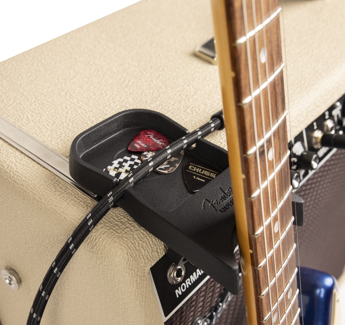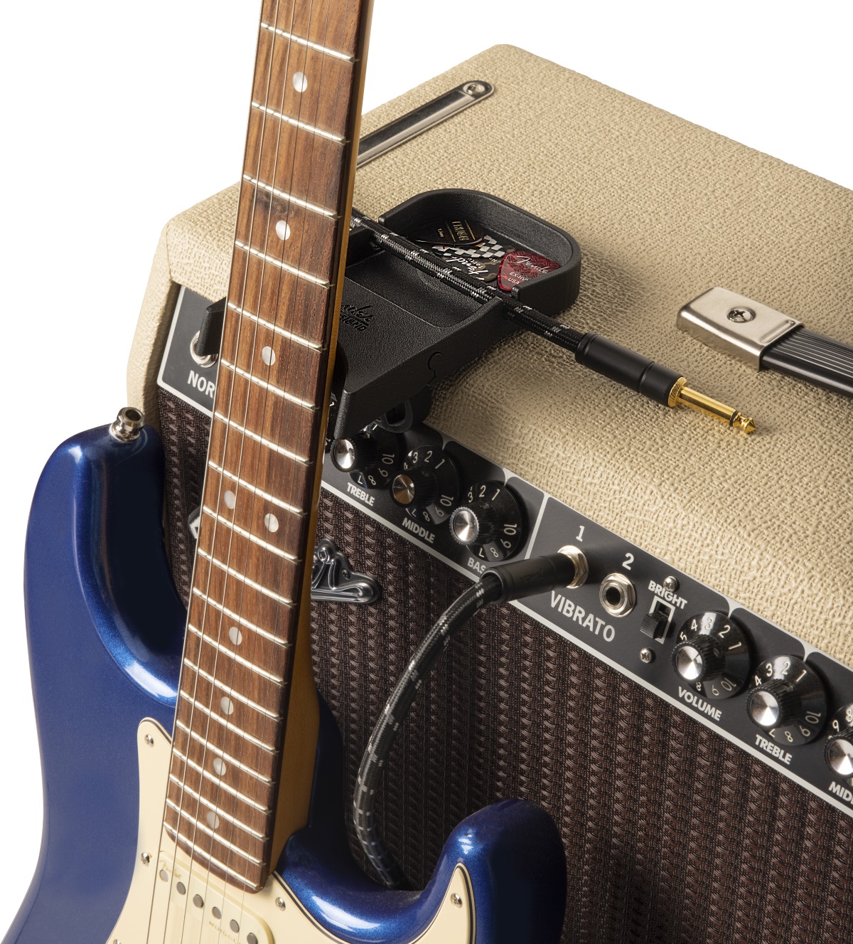 Gitarový stojan Tento praktický nástroj umožňuje vytvoriť miesto na pohodlné a bezpečné položenie nástroja prakticky na akomkoľvek rovnom povrchu. Stojan je vyrobený zo špeciálnej gumy, ktorá sa dokáže pevne „prichytiť“ k takmer akémukoľvek materiálu vrátane tolexu, ktorý často nájdete na komboch a zosilňovačoch. Okrem toho je táto pomôcka vybavená priestorom na odkladanie trsátok a iného drobného príslušenstva alebo dvojicou drážok na pripevnenie káblov.