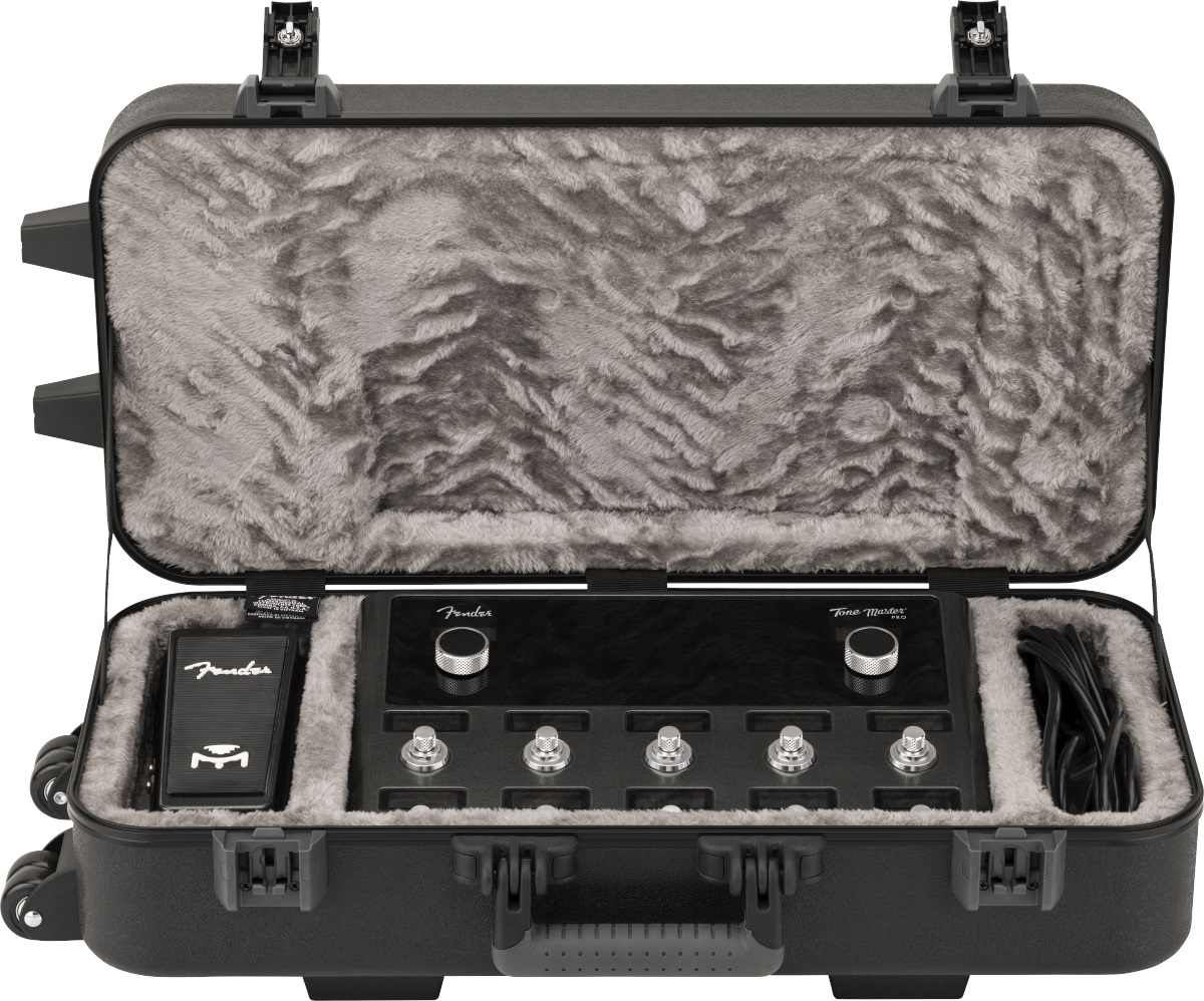 Transportný case Prepravné puzdro z odolného materiálu ABS pre gitarové multiefekty Fender Tone Master Pro. Kufrík je vybavený polstrovanými vnútornými priehradkami na uloženie dvoch expression pedálov, vreckami na uloženie káblov a iného drobného príslušenstva a teleskopickou rukoväťou a kolieskami na jednoduchú prepravu.