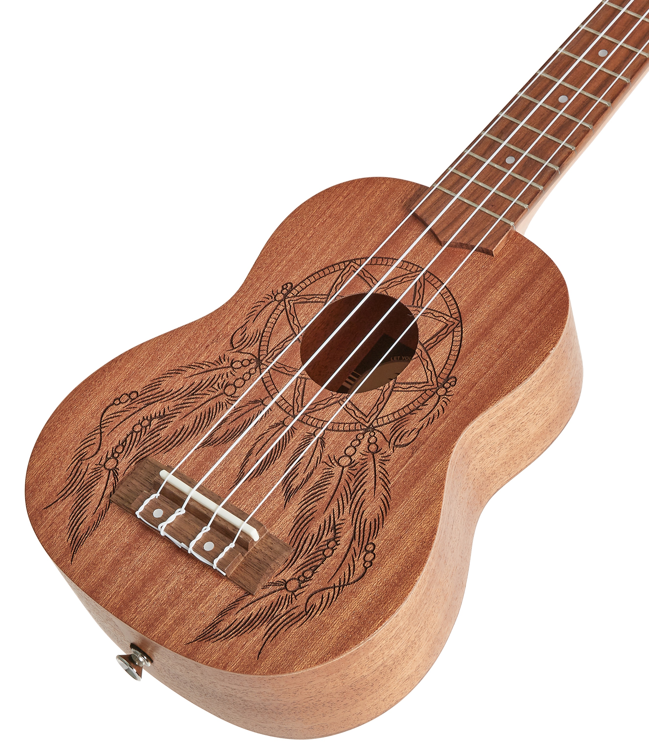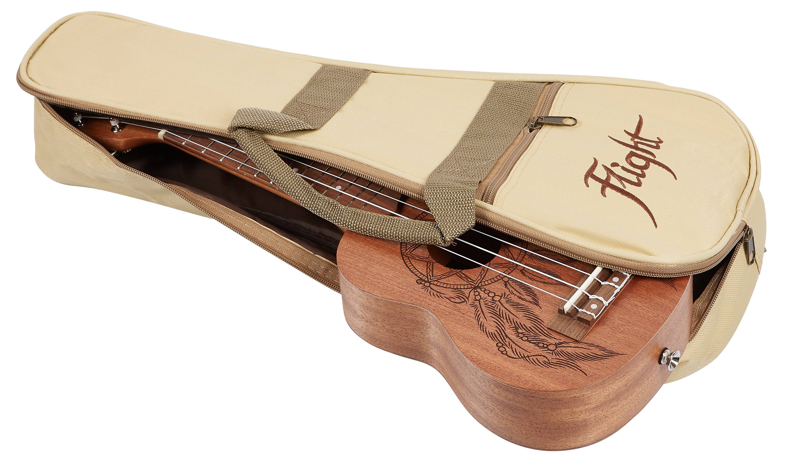Akustické ukulele Modelová rada Natural Series od spoločnosti Flight ponúka cenovo dostupné modely ukulele s tradičným prírodným/konštrukčným drevom vhodné pre začínajúcich hráčov na ukulele. Telo sopránového ukulele NUS 350 Dreamcatcher je vyrobené z laminovaného sapele, dreva botanicky príbuzného mahagónu/pravého mahagónu (preto sa často označuje ako sapele mahagón). Krk a hmatník sú vyrobené z afrického okoumé a orechového dreva, čo je tiež pomerne často používaná kombinácia drevín. Struny sú ukotvené pr