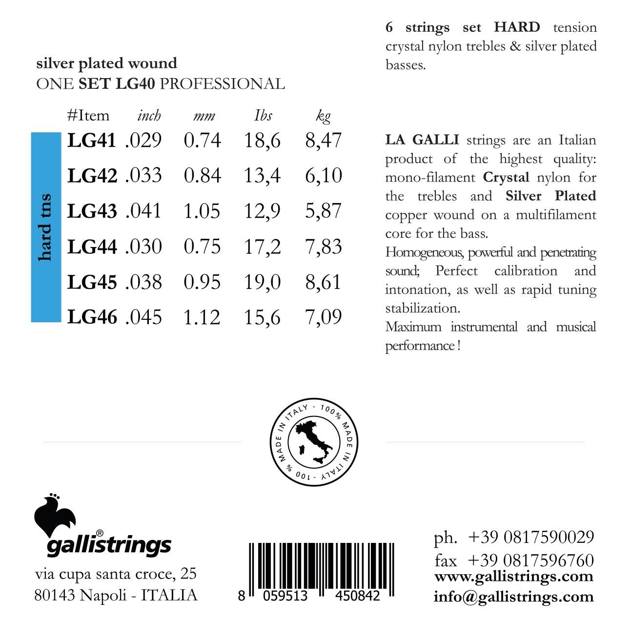 Nylonové struny na klasickú gitaru Struny na klasickú gitaru La Galli boli vyrobené v Taliansku a ponúkajú prvotriednu kvalitu materiálov a prvotriedne spracovanie. Zatiaľ čo výškové struny sú vyrobené z číreho nylonu, basové struny sú vinuté postriebrenou meďou. Výsledkom je vyvážený, silný a prenikavý zvuk. Poteší aj presná intonácia.