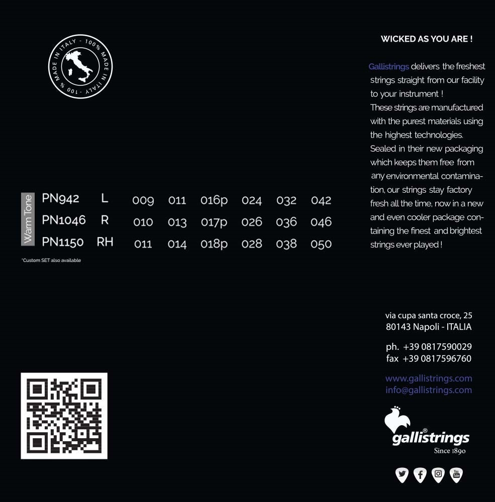 Struny na elektrickú gitaru Struny Galli PN Pure Nickel pre elektrickú gitaru produkujú výnimočne teplý, zaoblený tón s vintage charakterom, ktorý je ideálny pre blues, klasický rock, rockabilly a podobné žánre. Majú šesťhranné oceľové jadro a vinutie z čistého niklu, čo okrem príjemného zvuku zaisťuje pohodlný pocit pri hre a flexibilitu. Ideálne pre jemné bluesové ohyby a rockové balady. Balenie obsahuje jednu sadu strún, dve náhradné struny E a H a ako bonus zdarma trsátko. Hrúbka strún: