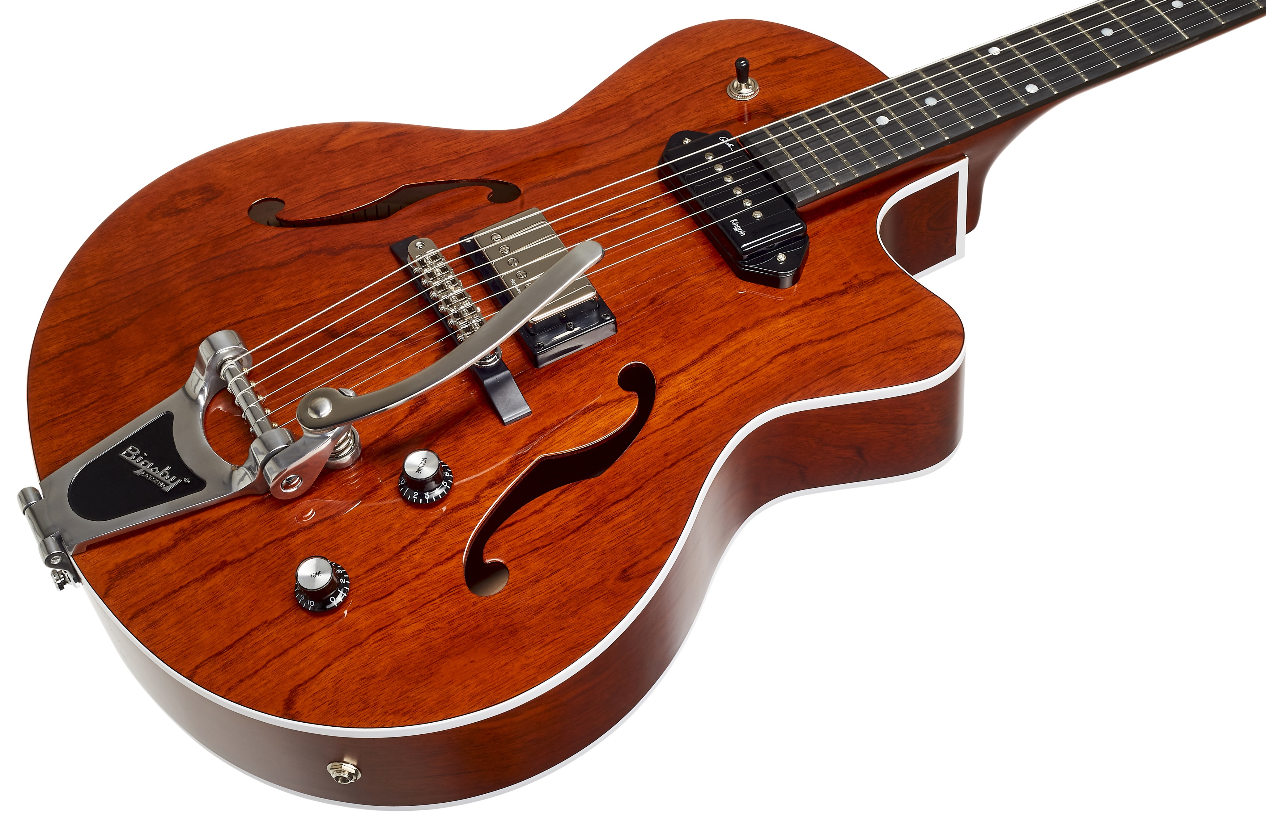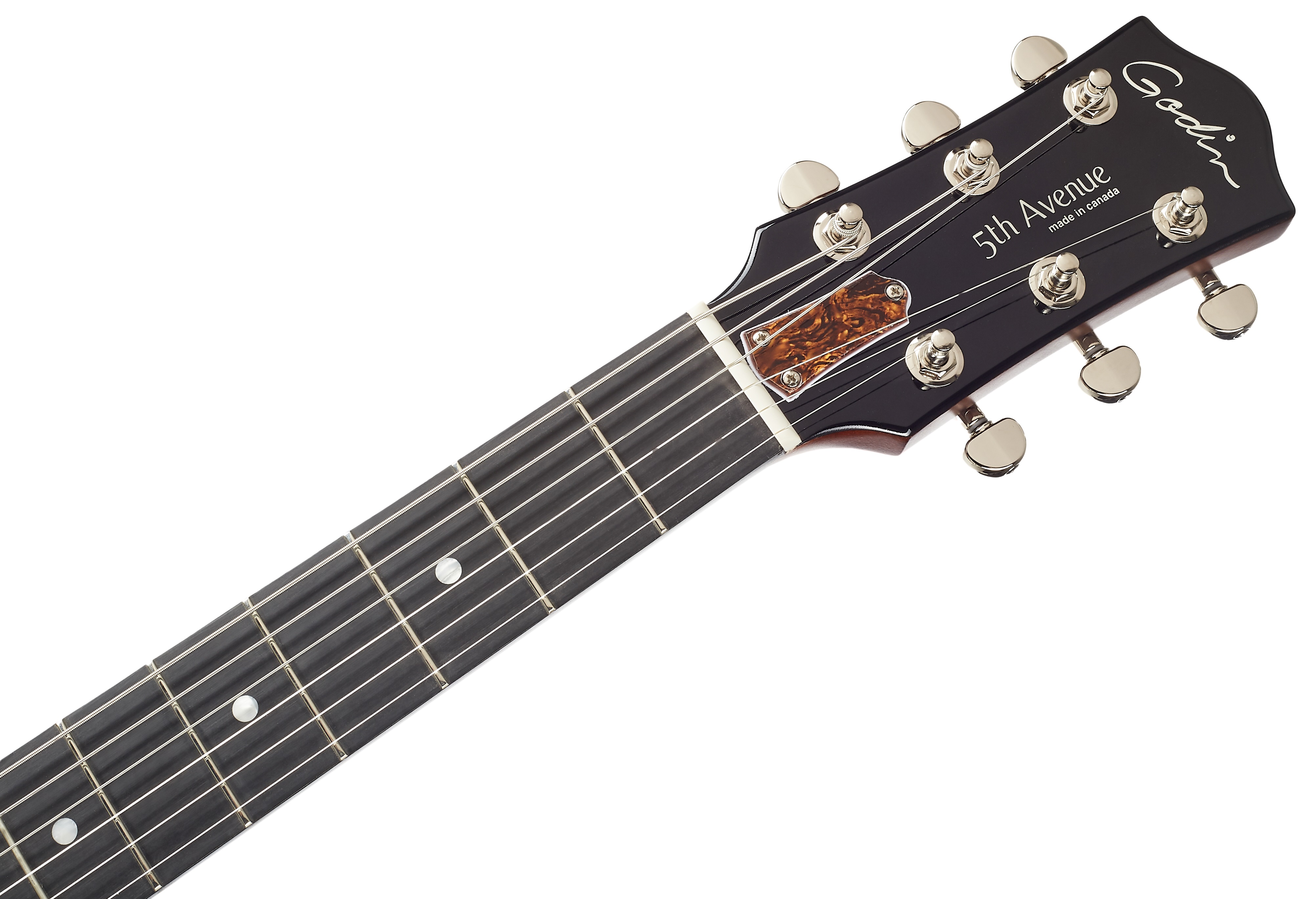 Semiakustická gitara Séria 5th Avenue kanadskej značky Godin ponúka elektrické gitary s dutým telom, ktoré kombinujú vintage estetiku gitár s dutým telom z 50. rokov s hrateľnosťou súčasných nástrojov. Telo modelu 5th Avenue Uptown Custom Havana Brown je vyrobené z laminovaného kanadského plochého čerešňového dreva. Krk zo strieborného javora je vybavený kompozitným hmatníkom Richlite s 21 pražcami. Polohové značky uľahčujú orientáciu na hmatníku. Kombináci