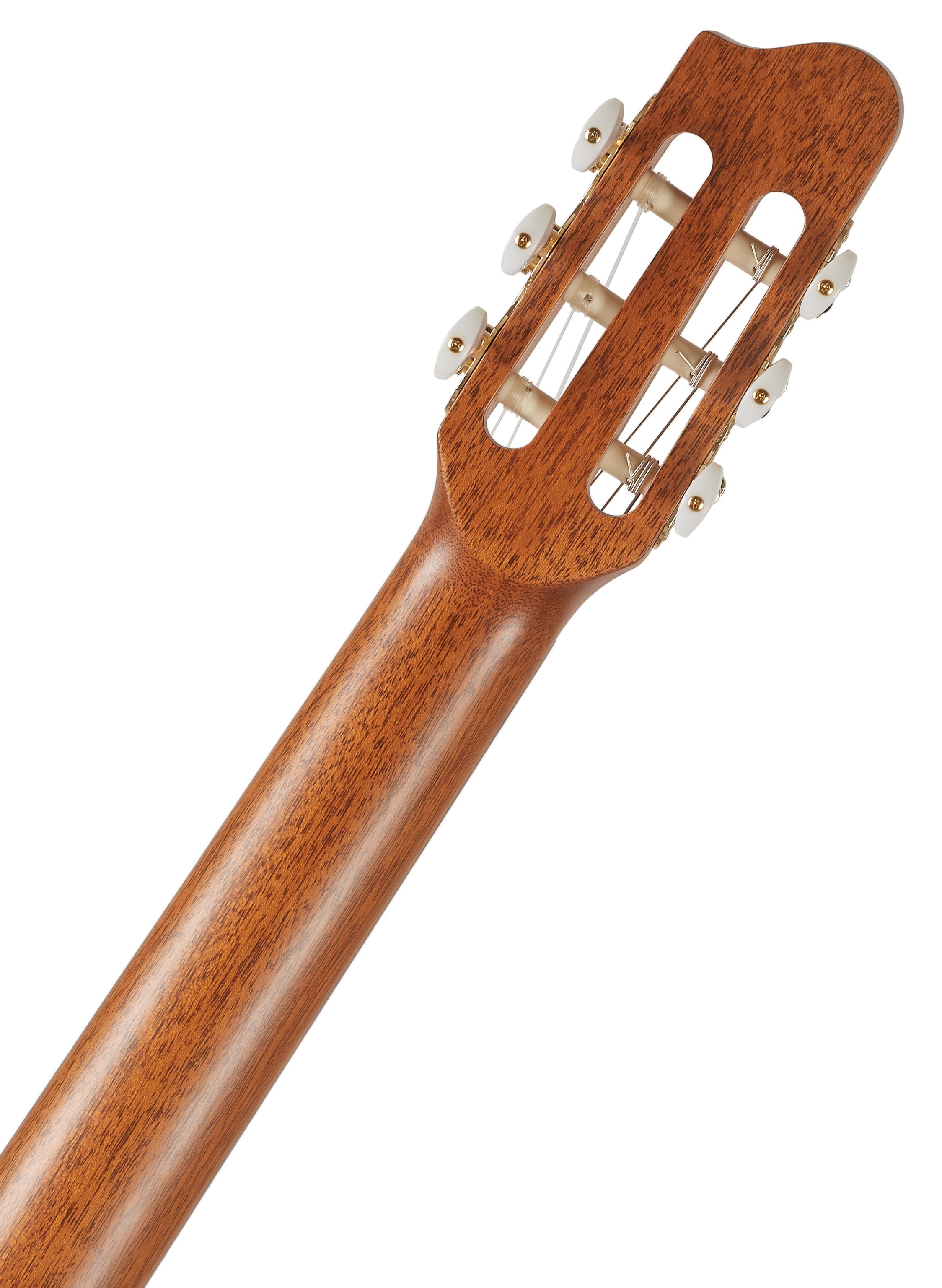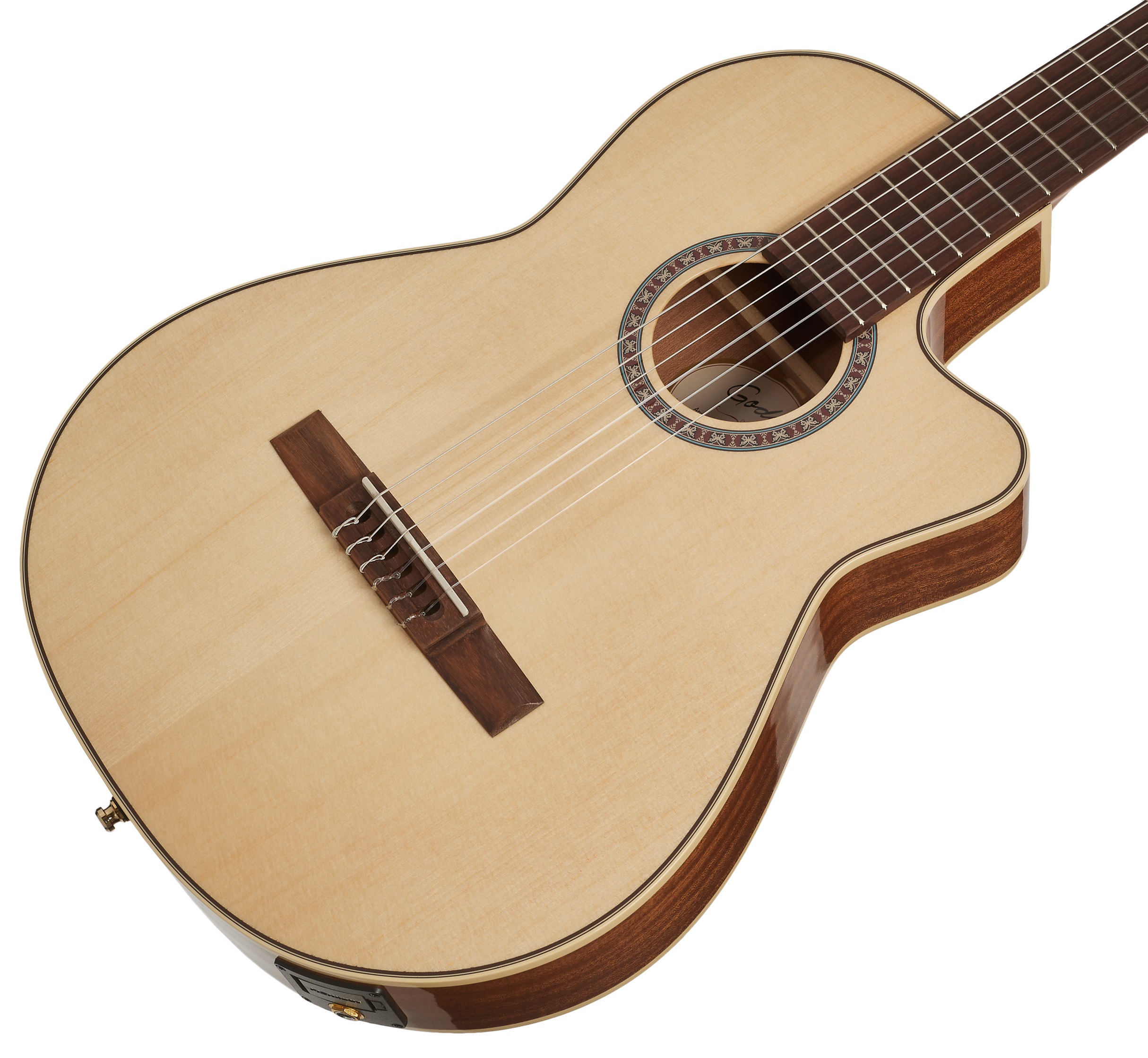 Klasická elektroakustická gitara Klasické elektroakustické gitary Arena od kanadského výrobcu Godin ponúkajú moderný vzhľad a vlastnosti, ktoré určite potešia široké spektrum hudobníkov. Arena Mahogany CW Clasica II je nástroj s tenkým telom a celomasívnou konštrukciou pozostávajúcou z tlakovo testovanej smrekovej rezonančnej dosky a mahagónovej zadnej dosky a lubov. K mahagónovému krku s dvojcestnou výstuhou je prilepený palisandrový hmatník s devätnástimi pražcami. Dobrému ladeniu v najvyšších polohách hm