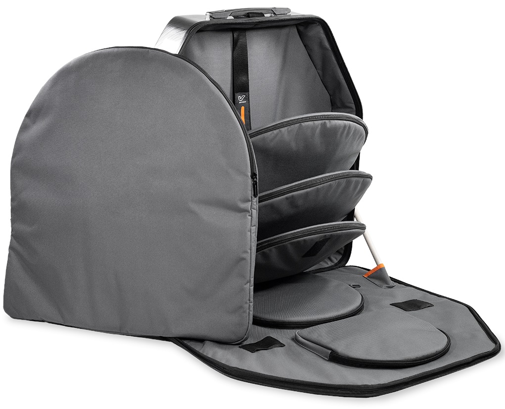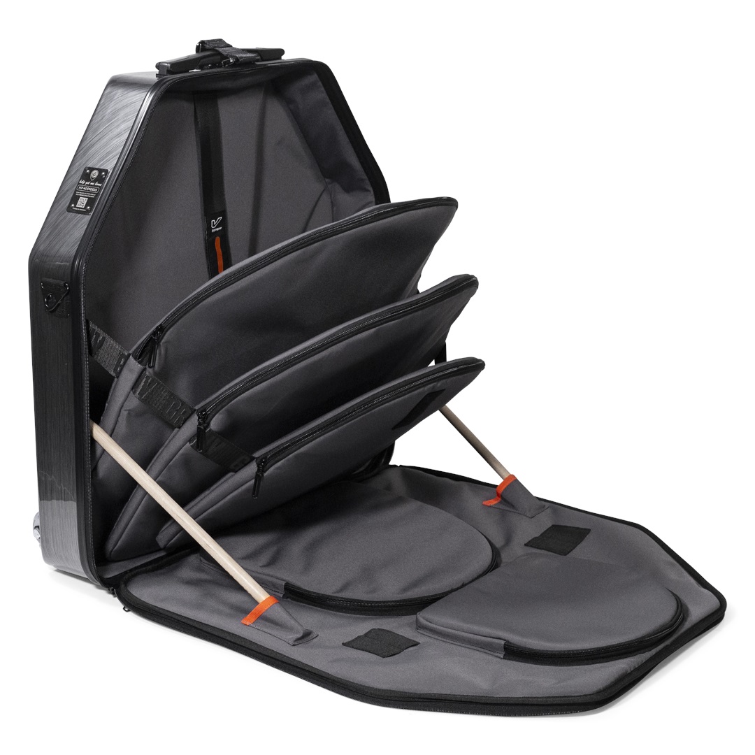 Pevný obal na činely Táto nová séria kufrov od Gruvgear s revolučným dizajnom určite uľahčí život mnohým bubeníkom. Hybridné kufre Veloc kombinujú odolnosť tvrdých kufrov a zároveň si zachovávajú nízku hmotnosť. Sú vyrobené z vodoodolnej tkaniny 1680D a majú pevnú bočnú stranu z ABS/polykarbonátu. Ich výhodou je, že sa dajú pomocou magnetického systému ľahko pripevniť k transportnému vozíku, takže môžete bezpečne a pohodlne prepravovať celú sadu vrátane hardvéru naraz. Vďaka ich špeciálnemu patentovanému di