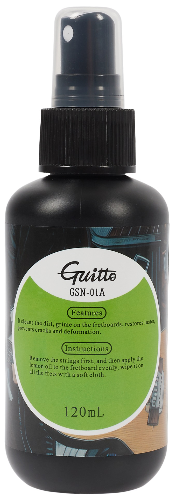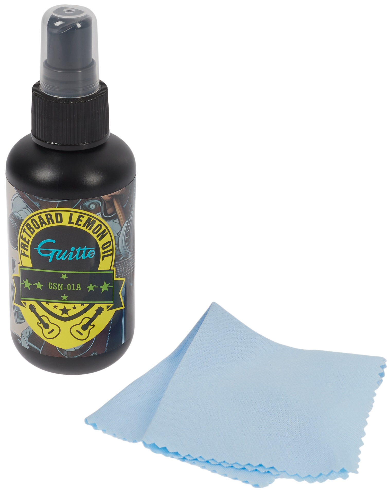 Gitarová kozmetika Citrónový olej je prírodný produkt na čistenie gitarových hmatníkov a nelakovaných drevených povrchov od vosku, mastnoty a nečistôt. Slúži aj ako prevencia proti vysychaniu dreva. Odstráňte struny, naneste olej na hmatník a nechajte pôsobiť dve minúty. Potom drevo utrite mäkkou handričkou.