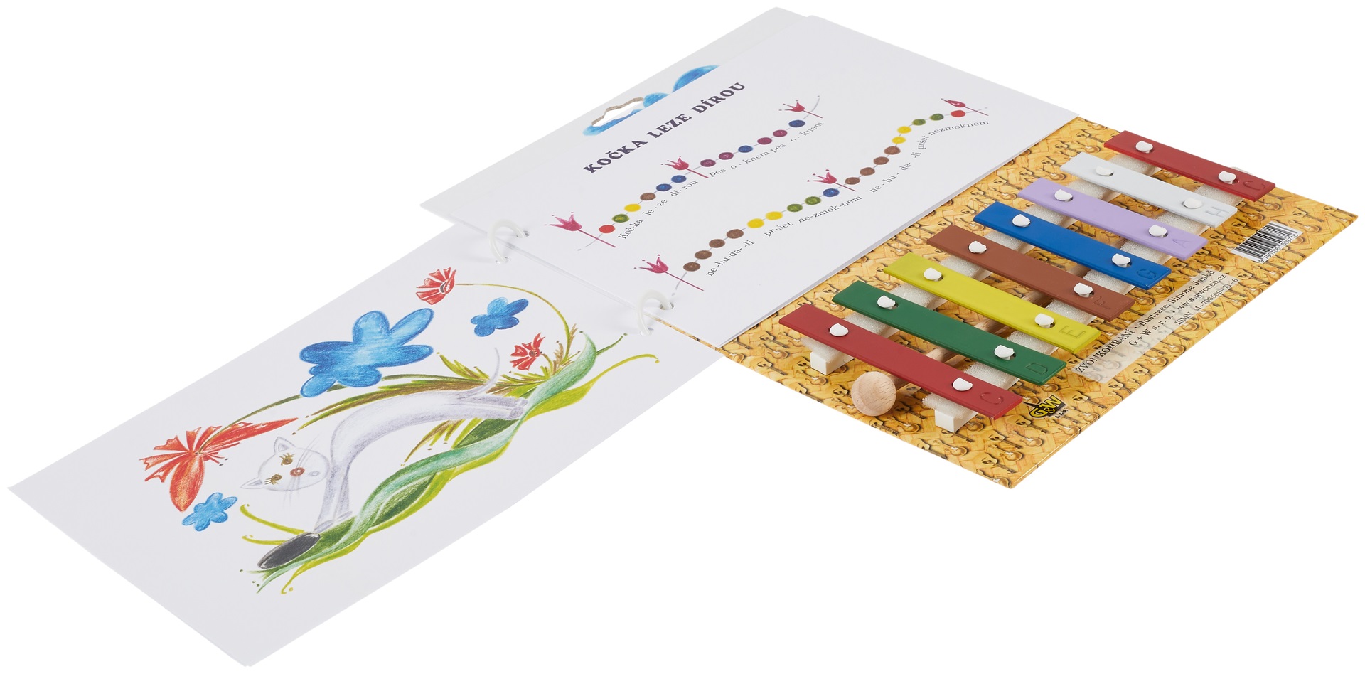 Zvonkohra Detský gong + palička Farebný spevník ľudových piesní vhodný pre deti od 3 do 7 rokov Spevník obsahuje piesne: – Keď som pásol husi – Zelená tráva – Pes skočil cez ovos – Malé ryby – Mačka prelieza dierou