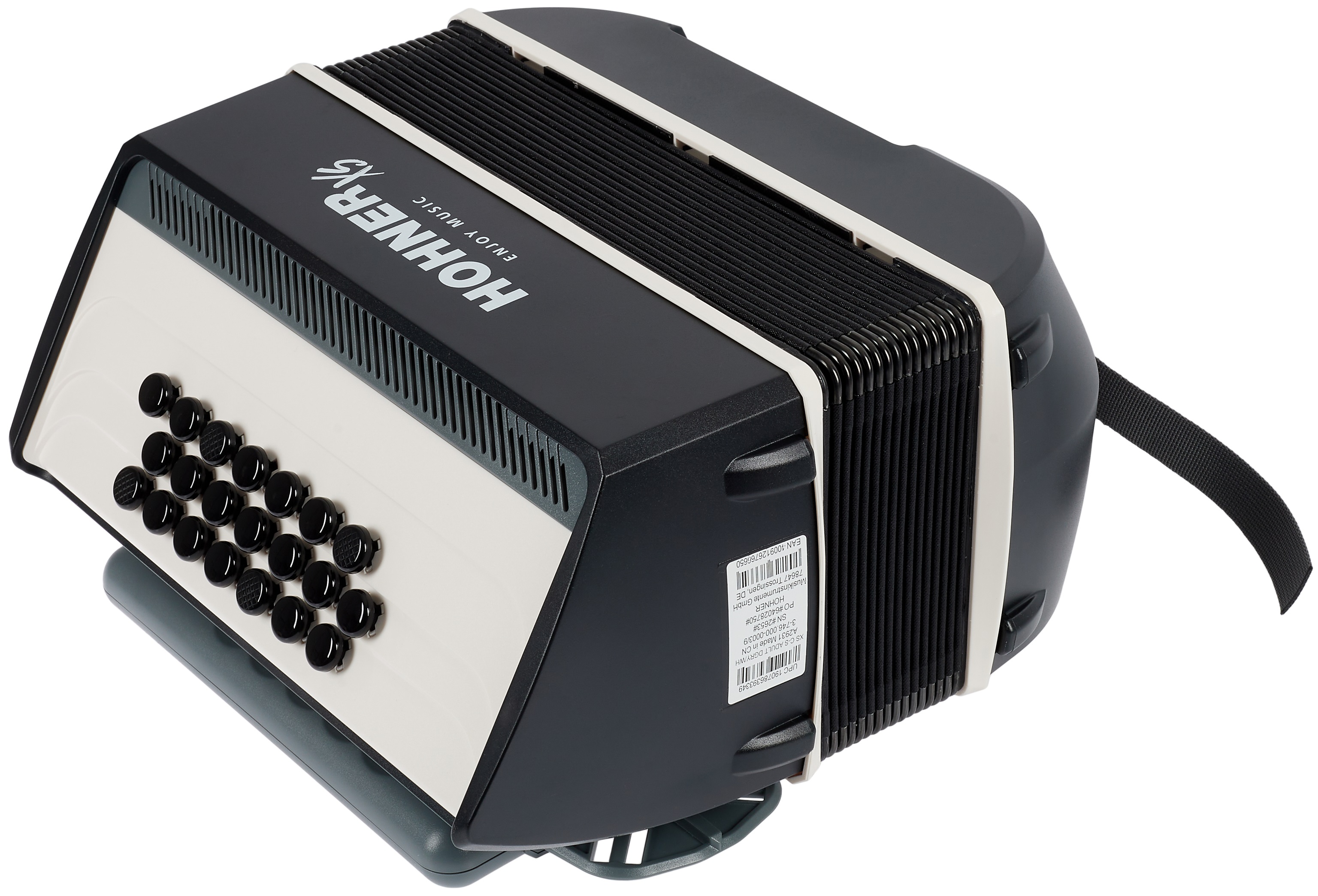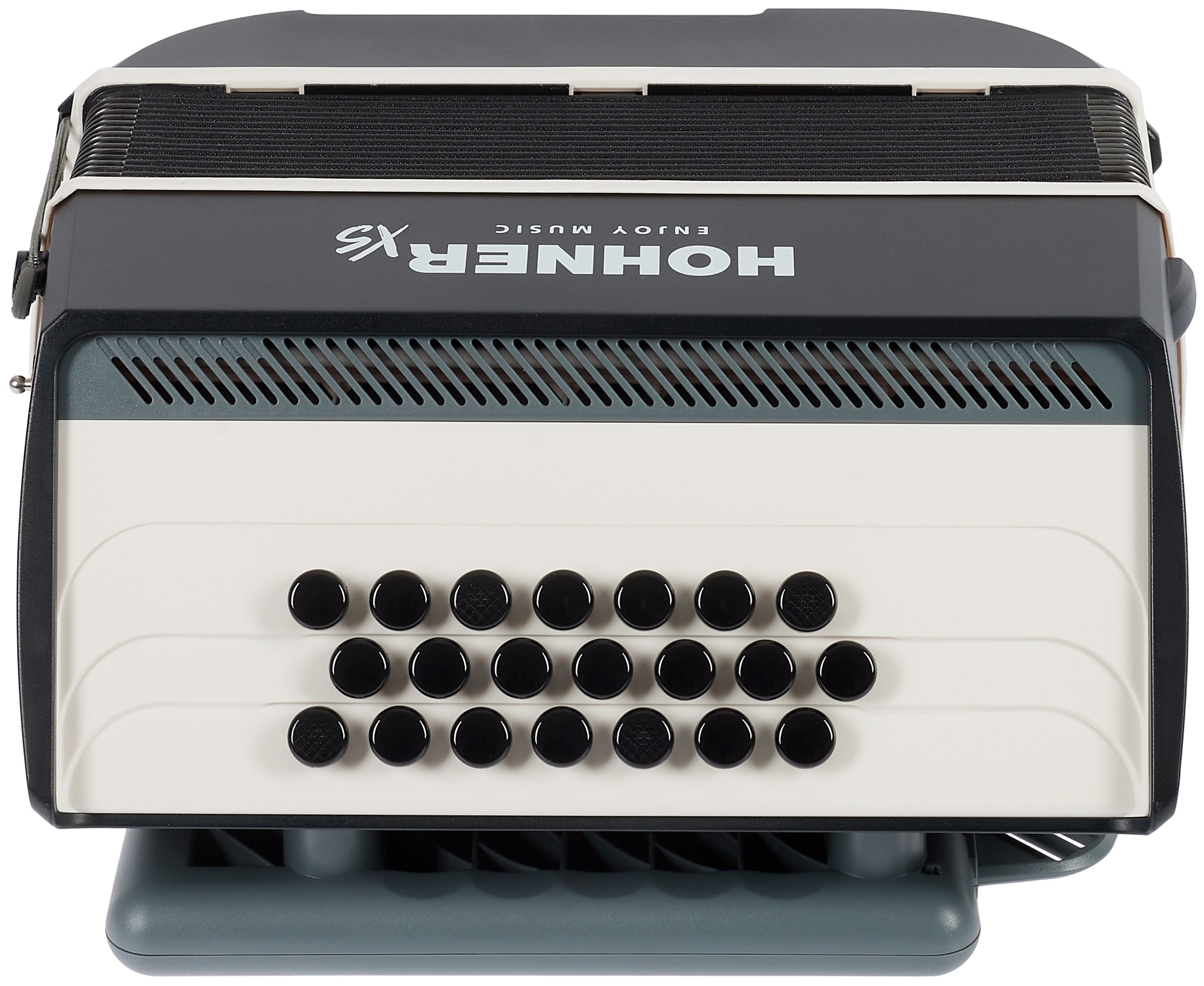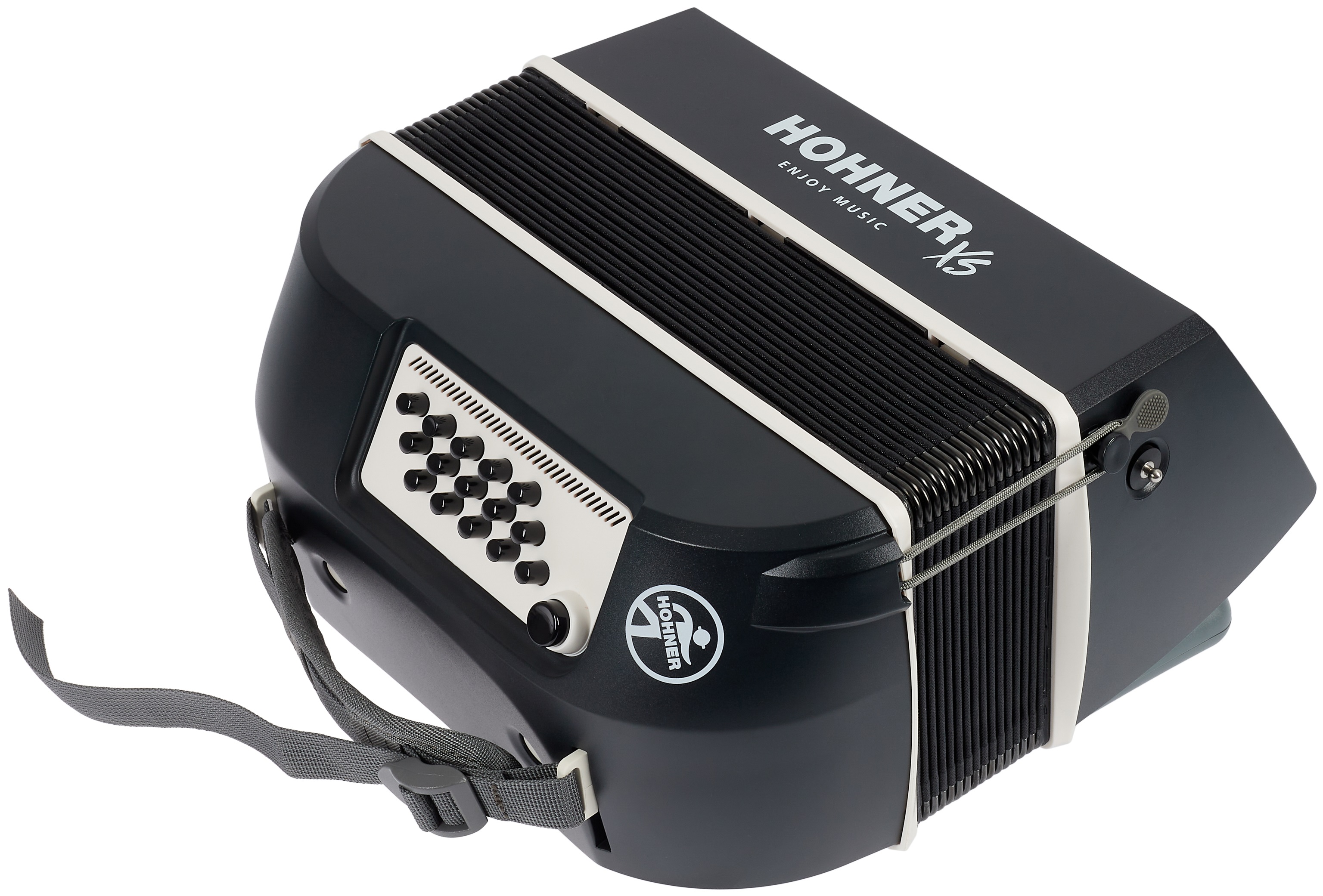 Diatonický akordeón Hohner XS Adult C-Stepped je kompaktný gombíkový akordeón so systémom klávesov C vhodný pre začínajúcich akordeonistov všetkých vekových kategórií. Vďaka kompaktnému tvaru, nízkej hmotnosti a praktickému systému uchytenia Click and Play poslúži aj skúseným akordeonistom ako cestovný nástroj. Nástroj má ergonomický dizajn pre maximálne pohodlie pri hraní, konštrukciu z odolného plastu, 21 klávesov, 15 basov a rozsah od h do g2. Akordeón sa dodáva v gig bagu. Špecifikácie: – Rozmery: 28,5