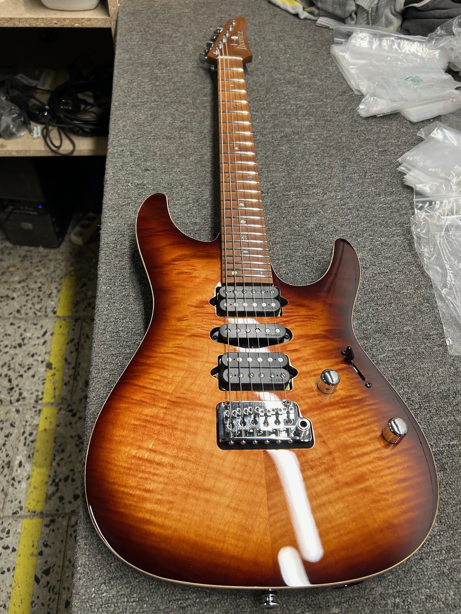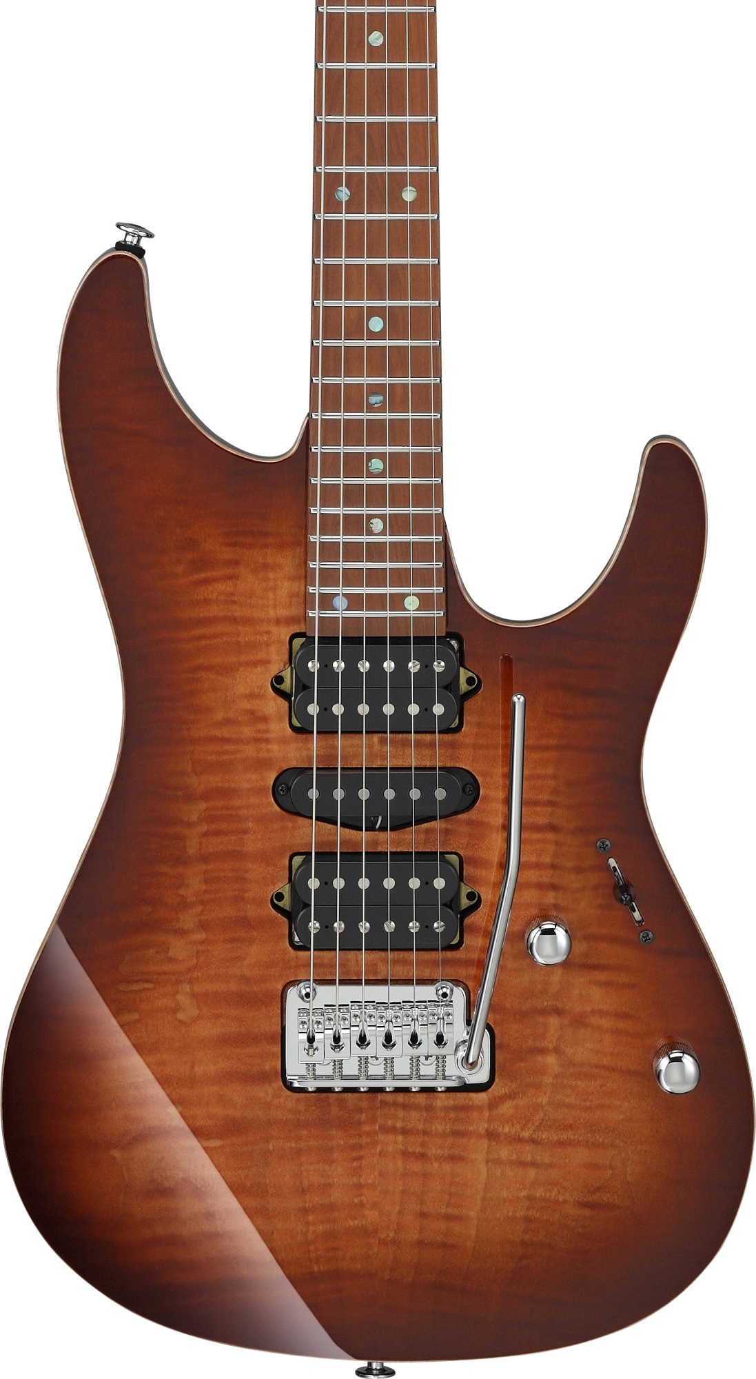 Elektrická gitara Elektrické gitary série AZ sú vítaným doplnkom katalógu Ibanez. Majú zaoblenejší krk a vyvážené asymetrické telo modelov Super ST. Telo elektrickej gitary AZ2407FR Brownish Sphalerite je vyrobené z lipového dreva a zdobí ho 4 mm hrubá vrchná doska z plamenného javora. Javorový krk a hmatník nástroja prešli pred montážou tepelnou úpravou (S-TECH), ktorá zlepšuje ich stabilitu, odolnosť voči vode a teplotným výkyvom a zároveň dodáva gitare v