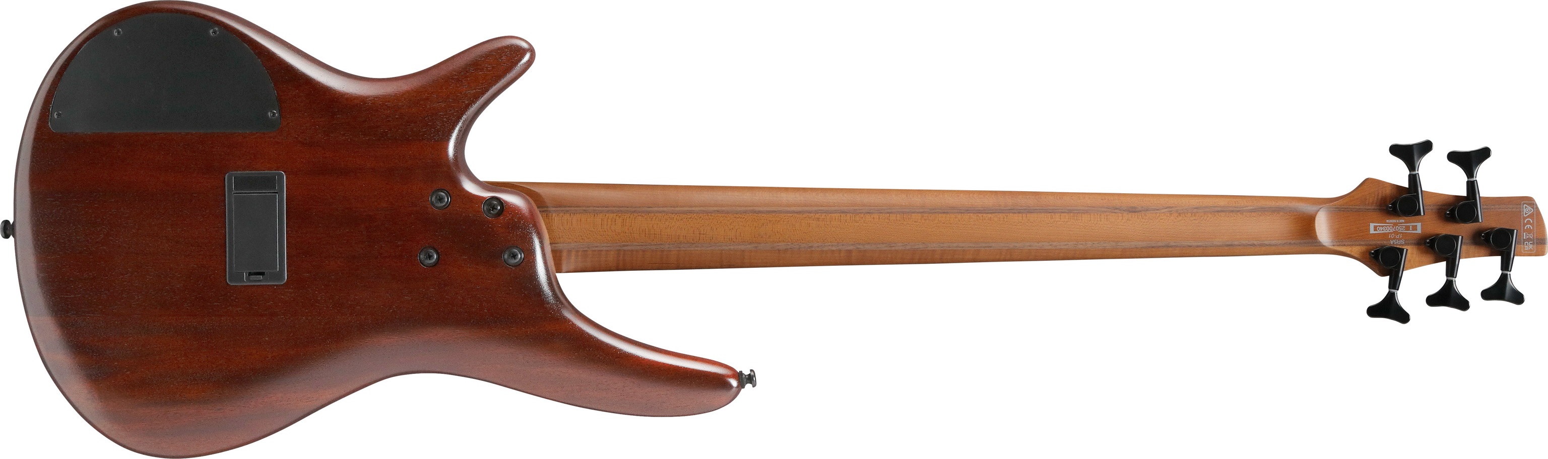 Elektrická basgitara Od 80. rokov ponúka séria SR japonskej značky Ibanez basgitaristom moderné nástroje s hladkými, rýchlymi krkmi, ľahkými telami a perfektne vyladenou elektronikou. To platí aj pre päťstrunovú basovú gitaru Ibanez SR505A-MHL s telom z okoumé, rýchlym, pevným krkom vyrobeným z piatich kusov praženého javora a orecha a palisandrovým hmatníkom s dvadsiatimi štyrmi stredne veľkými pražcami. Oválne značky polohy z abalone uľah