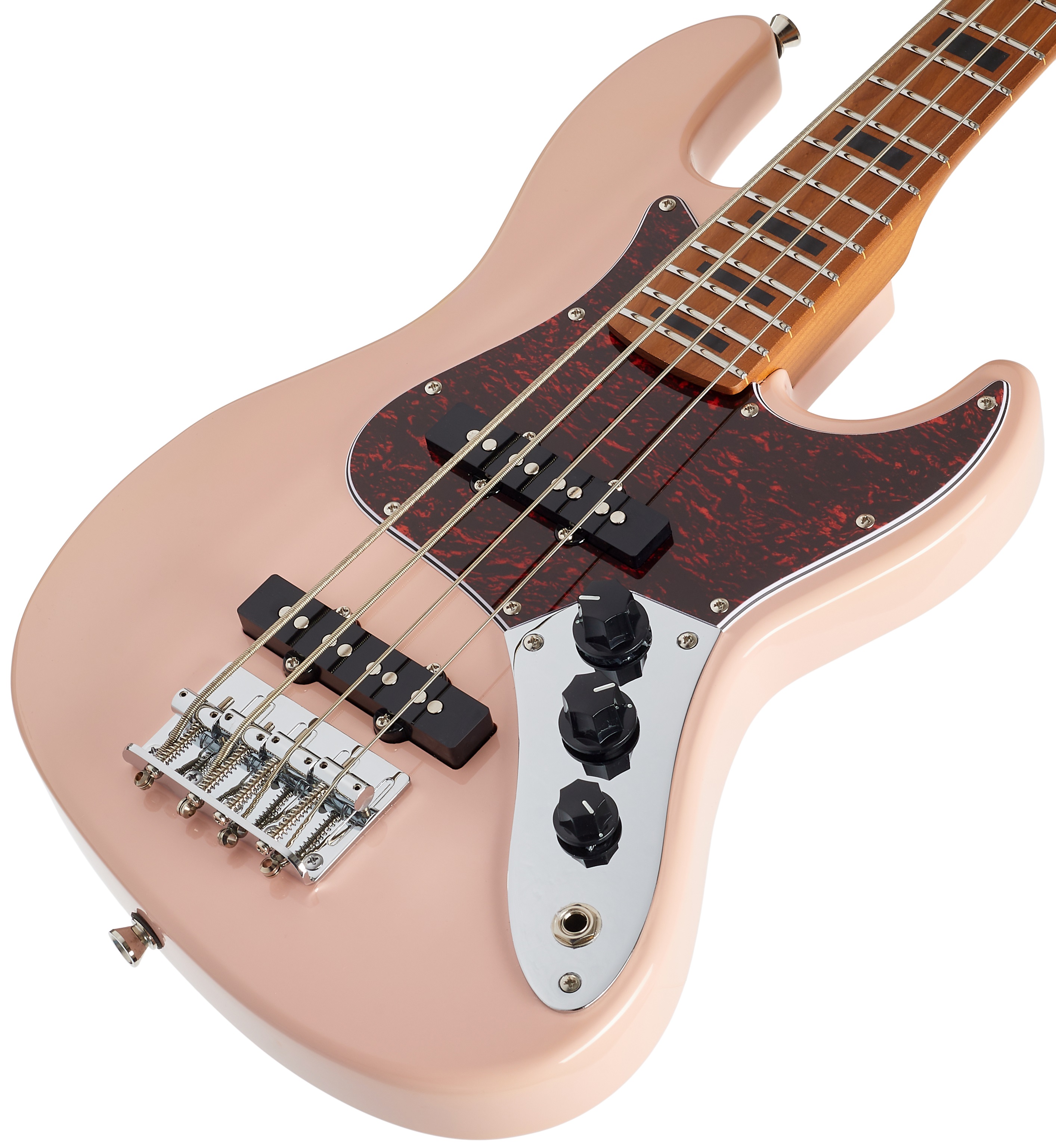 Elektrická basgitara JET JB-300 PK Travel Bass je cenovo dostupná cestovná elektrická basgitara s krátkou menzúrou, ktorú ocenia aj deti vďaka jej rozmerom, ktoré sa hodia skôr k basovým ukulele než k plnohodnotným basgitarám. Topoľové telo zdobí štýlová ružová povrchová úprava. Krk a hmatník sú vyrobené z tepelne upraveného kanadského javora. Krk je vystužený dvojcestnou výstuhou, plocha hmatníka je rozdelená devätnástimi pražcami a polohovými bodkami. Basgitara je vybavená dvoma snímačmi v štýle JB. Chara