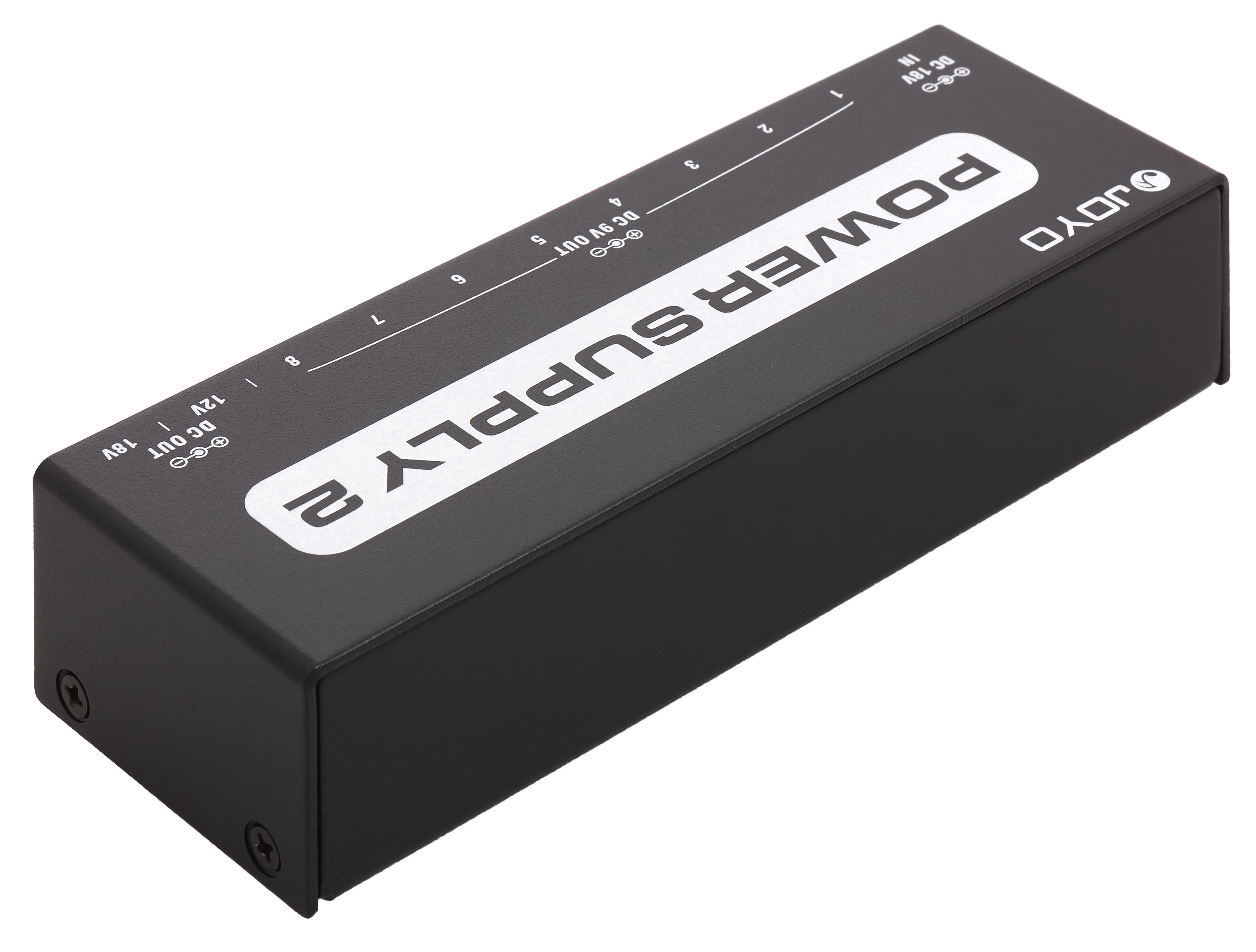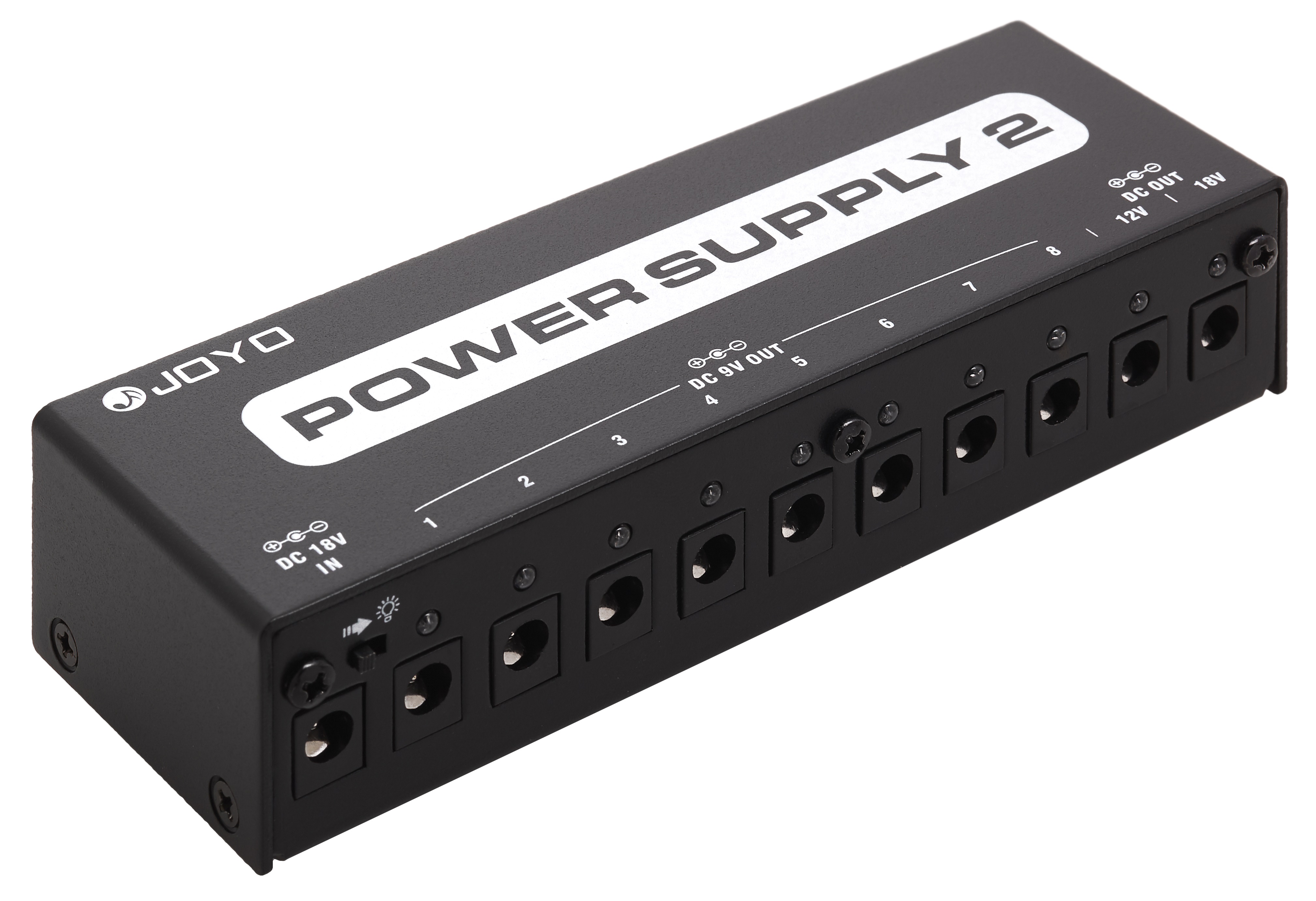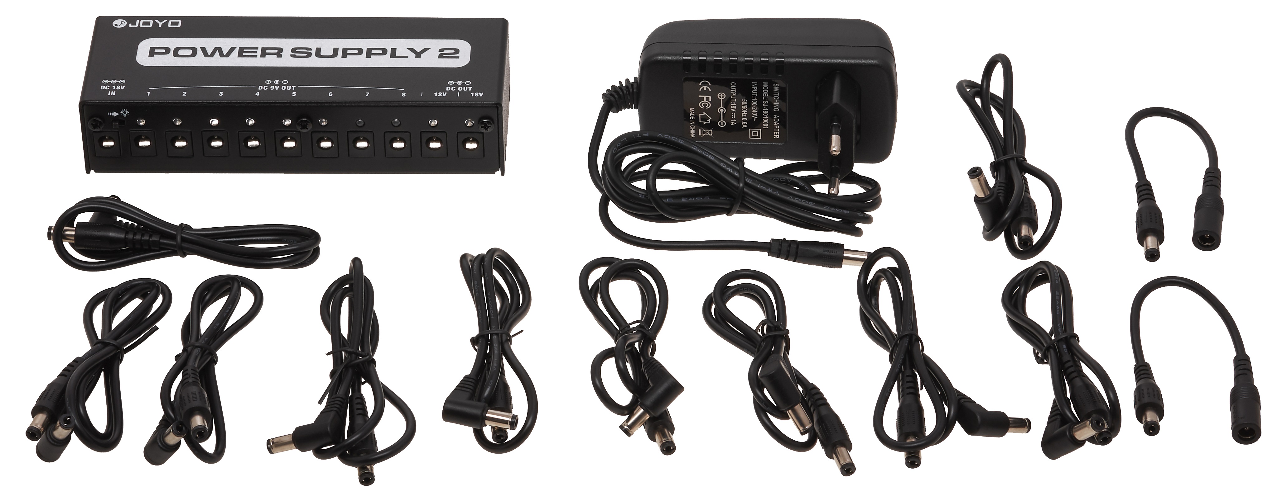 Multiadaptér Multiadaptér Joyo JP-02 ponúka celkom 10 výstupov (7x 9 V DC 100 mA, 1x 9 V DC 500 mA, 1x 12 V DC 100 mA a 1x 18 V DC 100 mA). Má tiež LED indikáciu a ochranu proti skratu alebo prepätiu. Súčasťou dodávky je sieťový adaptér a potrebné pripojovacie káble.