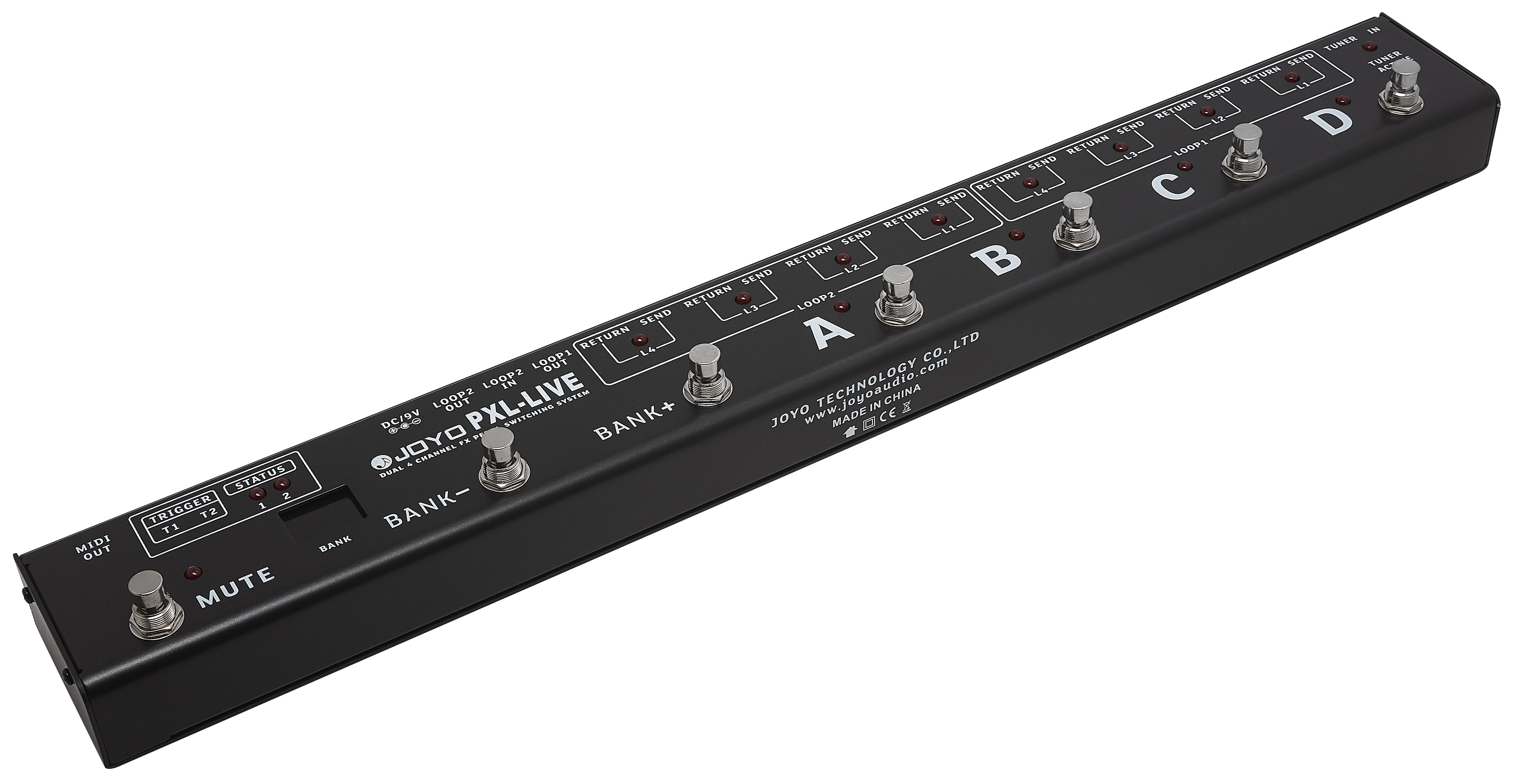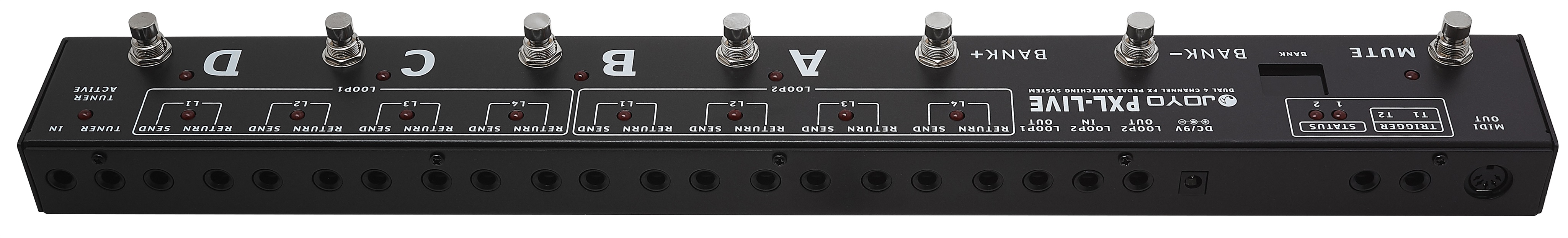 Špeciálny nožný prepínač Prepínač efektov Joyo PXL-Live ponúka praktické riešenie pre váš efektový pedalboard. Navyše s viac ako atraktívnym pomerom cena/výkon. Má osem efektových slučiek, do každej z nich môžete zapojiť jeden alebo viac pedálových efektov. Celkovo si môžete vybrať z tridsiatich dvoch presetov (rôznych kombinácií zapojenia efektových slučiek), ktoré sú umiestnené v ôsmich bankách. Prepínače Bank+ a Bank- slúžia na prepínanie medzi bankami, zatiaľ čo prepínače A, B, C a D slúžia na výber pre