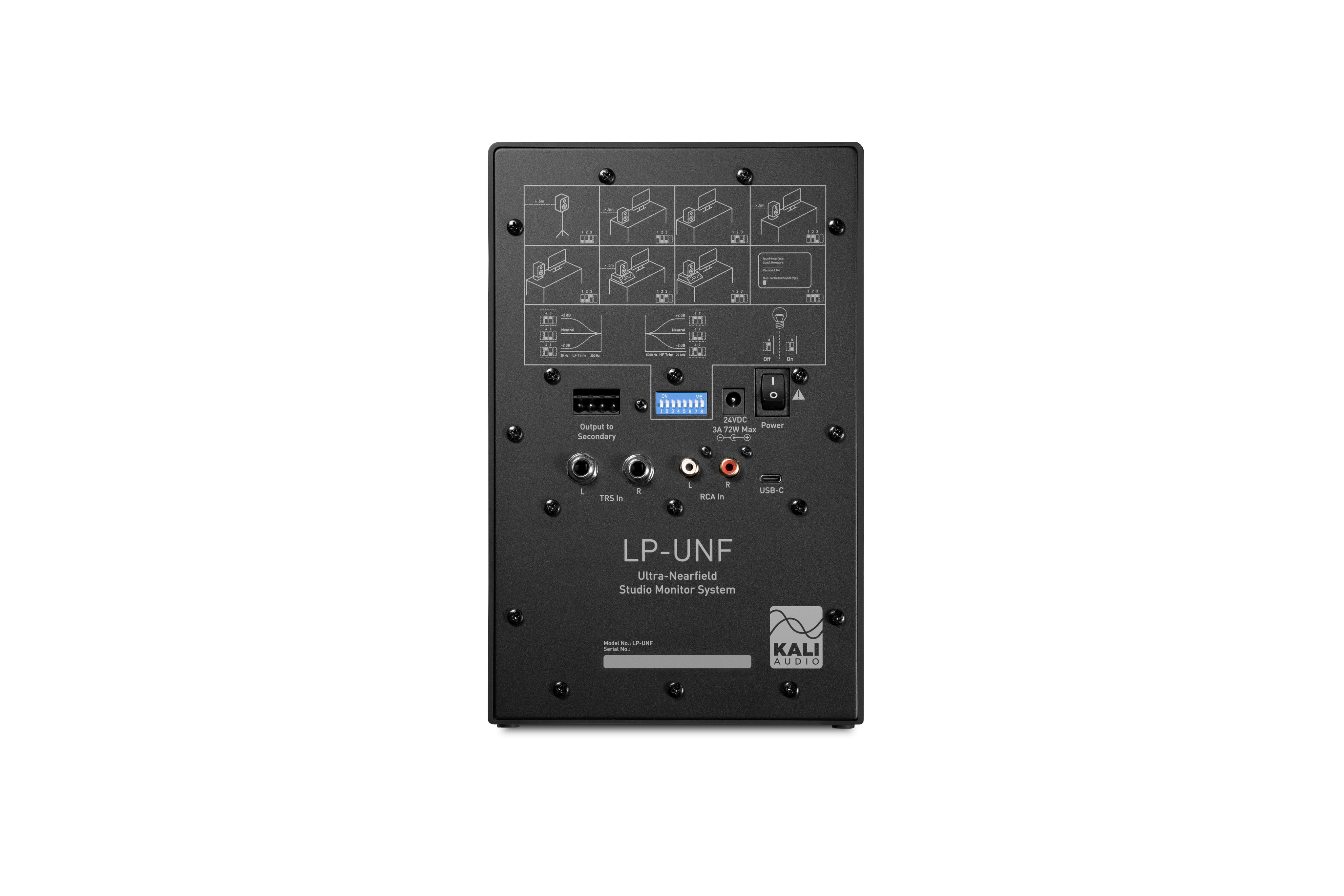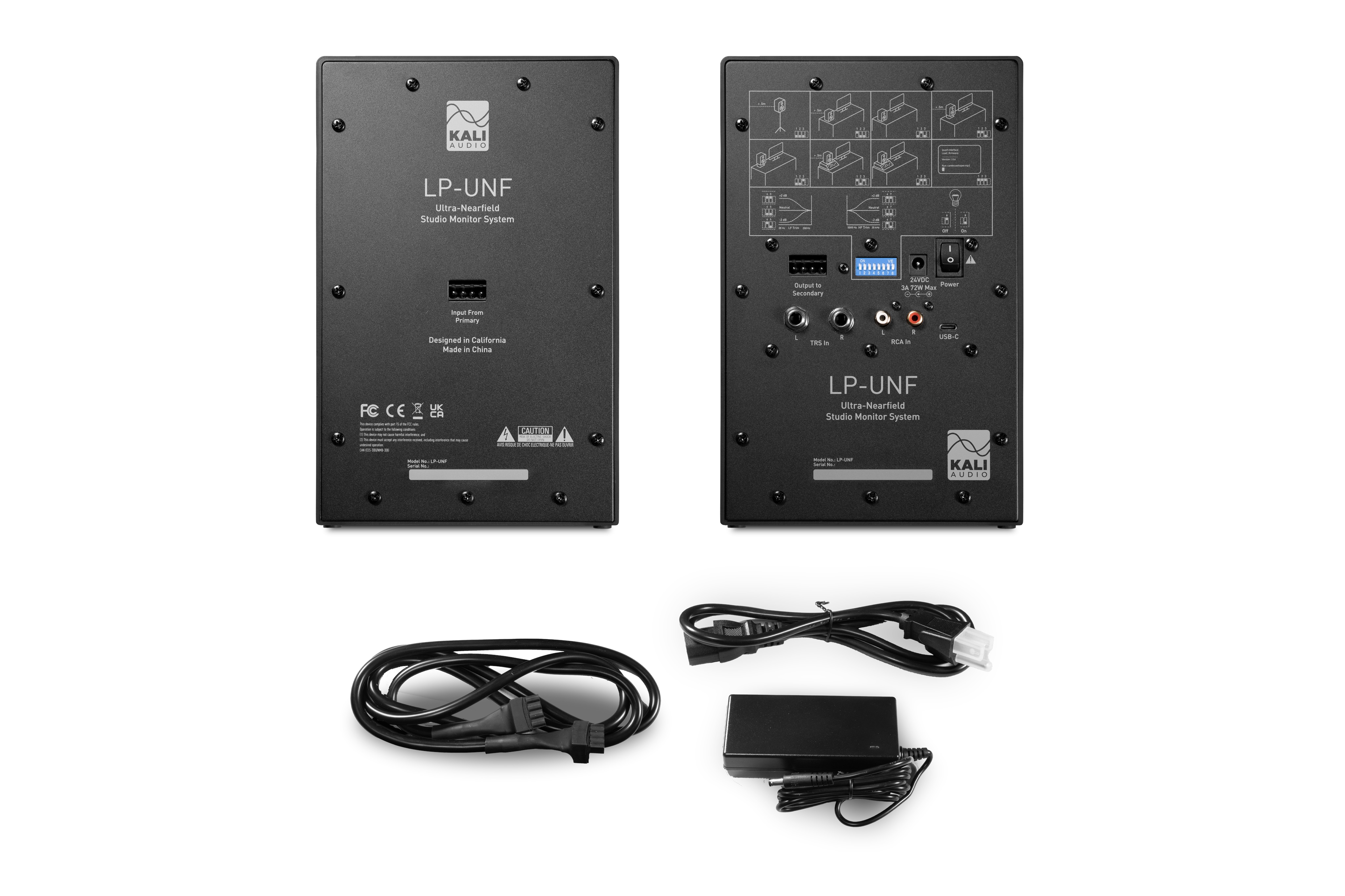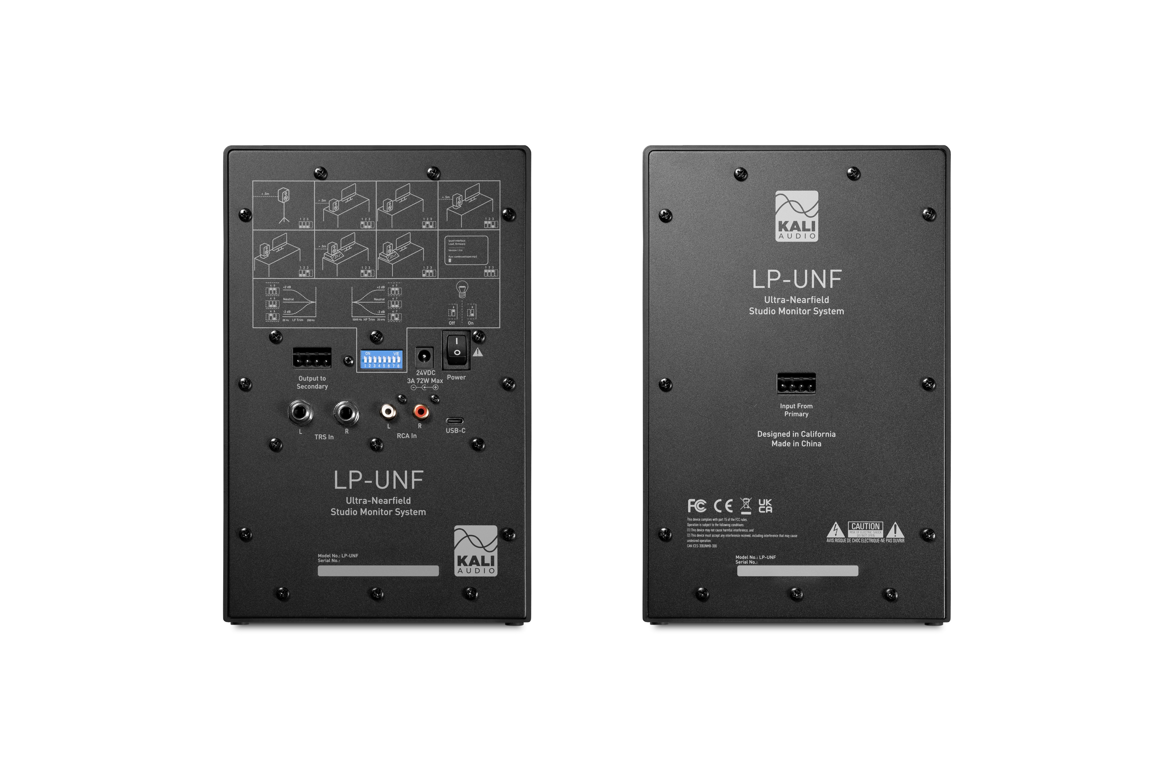 Aktívne štúdiové monitory Kali Audio LP-UNF je pár stolných štúdiových monitorov pre detailné počúvanie. Tento monitorovací systém je špeciálne navrhnutý a testovaný pre použitie v menších priestoroch, kde je počúvanie obmedzené buď zlými akustickými vlastnosťami miestnosti, alebo toleranciou susedov. Systém LP-UNF poskytuje plný rozsah zvuku na referenčnej úrovni pri optimálnej vzdialenosti počúvania 0,8 metra. Každý reproduktor je vybavený dvoma meničmi: 4,5″ baso