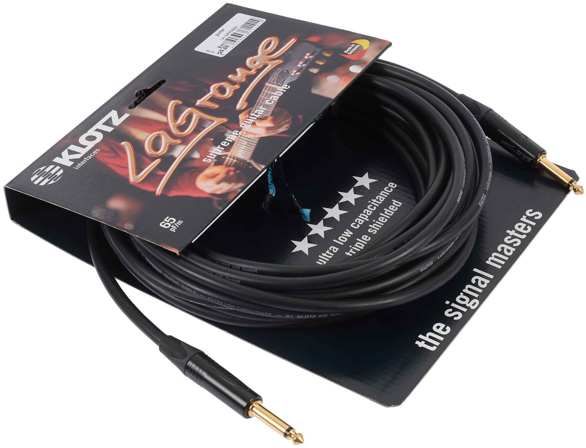 Nástrojový kábel Prístrojové káble Klotz z radu LaGrange sú na trhu od roku 1985 a počas svojej existencie sa tešia veľkej obľube. Ich veľkým lákadlom je bleskurýchla odozva, dynamický zvuk a minimálna kompresia. Mimoriadne nízka kapacita 65 pF/m zaručuje verný prenos zvuku a trojité tienenie poskytuje spoľahlivú ochranu pred šumom a hlukom. Vodič v jadre je vyrobený z kvalitnej medi. Výsledkom je čistý, frekvenčne vyvážený zvuk, ktorý ocenia aj tí najnáročnejší hudobníci.