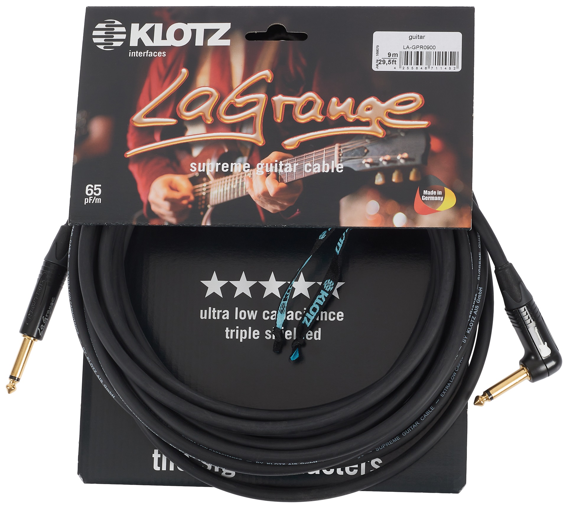 Nástrojový kábel Prístrojové káble Klotz z radu LaGrange sú na trhu od roku 1985 a počas svojej existencie sa tešia veľkej obľube. Ich veľkým lákadlom je bleskurýchla odozva, dynamický zvuk a minimálna kompresia. Mimoriadne nízka kapacita 65 pF/m zaručuje verný prenos zvuku a trojité tienenie poskytuje spoľahlivú ochranu pred šumom a hlukom. Vodič v jadre je vyrobený z kvalitnej medi. Výsledkom je čistý, frekvenčne vyvážený zvuk, ktorý ocenia aj tí najnáročnejší hudobníci.