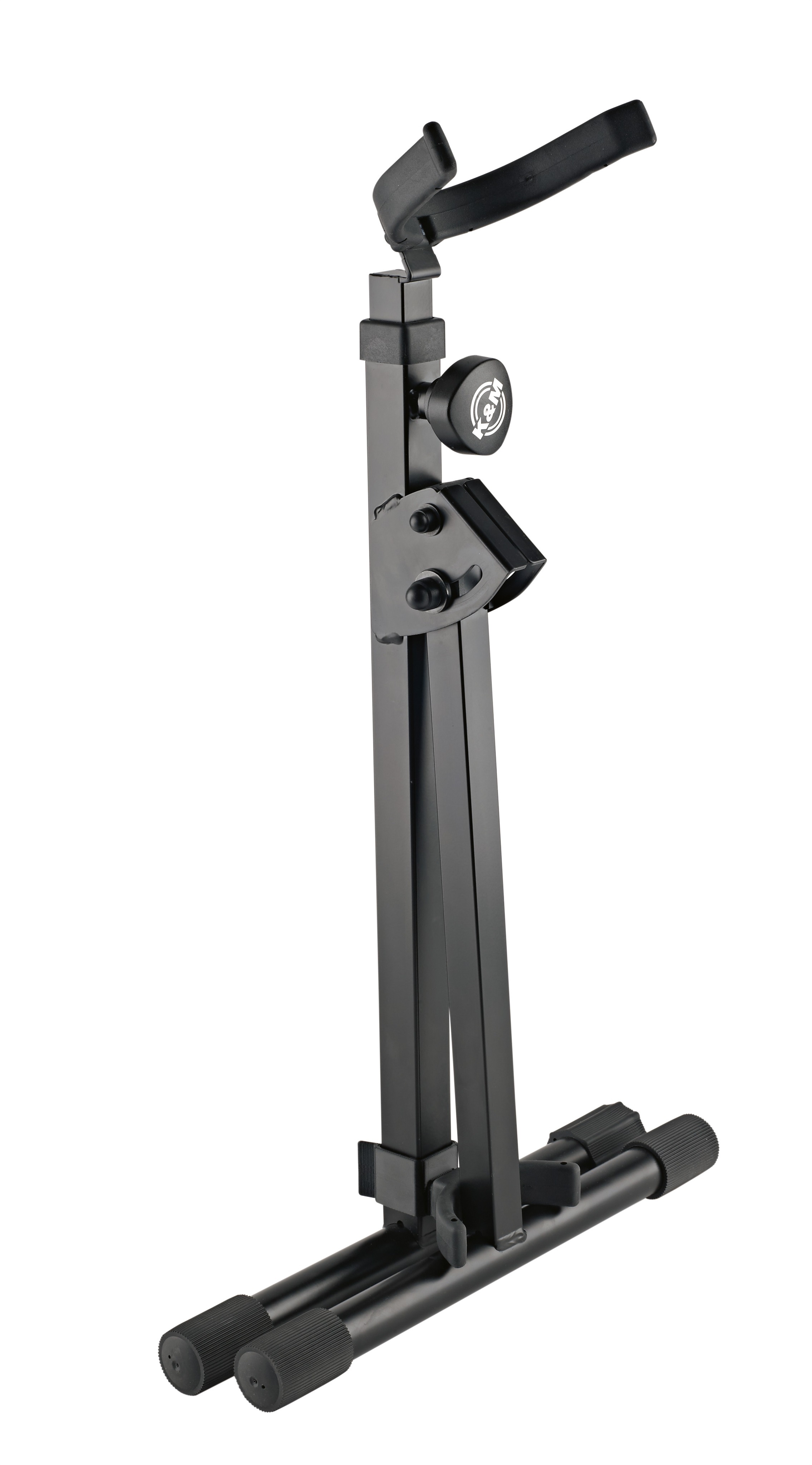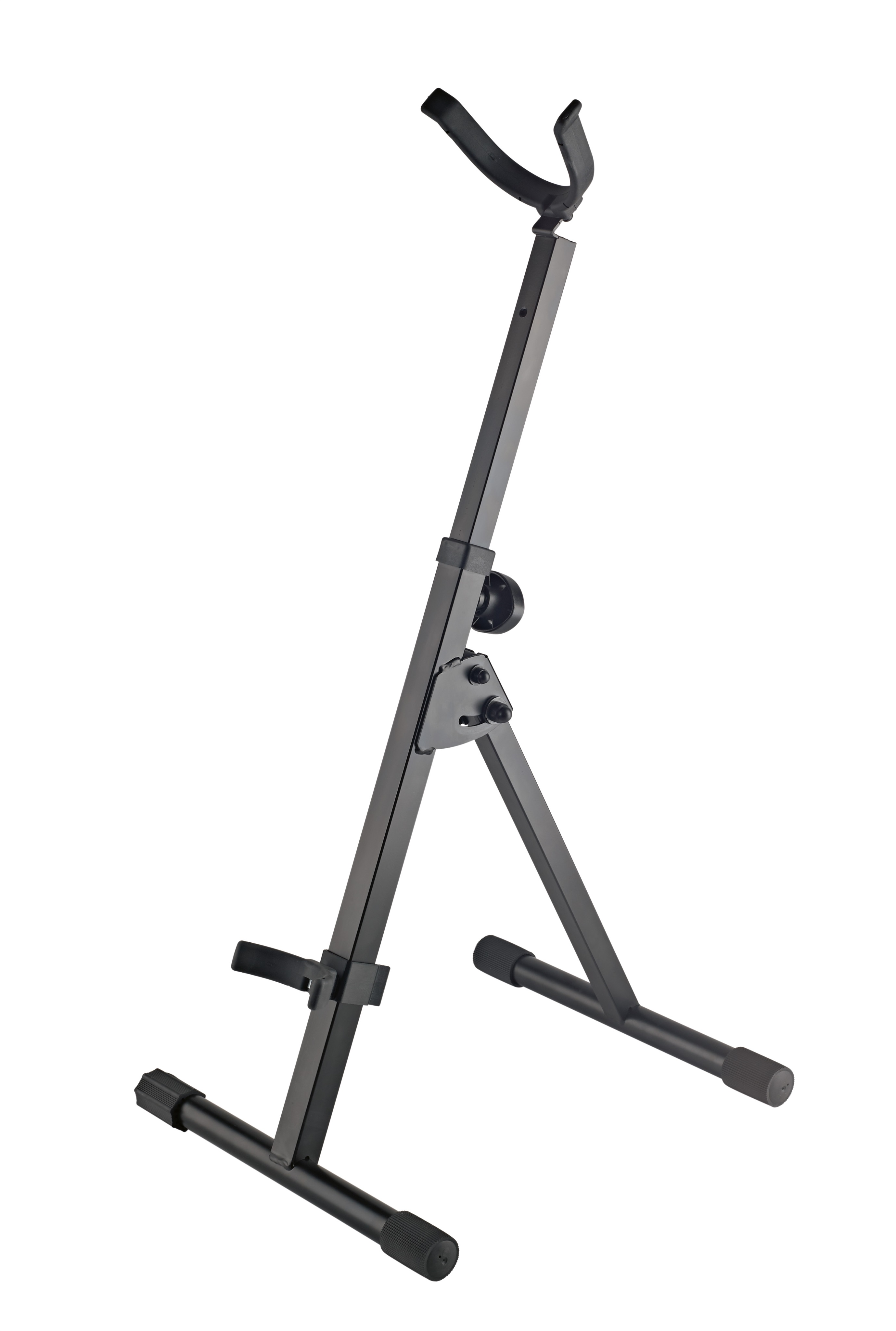 Stojan na saxofón Stabilný, robustný oceľový stojan na barytónový saxofón s dvojdielnou skladacou konštrukciou a nastaviteľnou montážnou výškou od 650 mm do 920 mm. Všetky plochy, ktoré sú v kontakte s nástrojom, sú pokryté pogumovaným materiálom, aby sa zabránilo poškriabaniu nástroja. Technické špecifikácie: – Rozmery základne: 400 x 440 mm. – Rozmery v zloženom stave: 700 x 400 x 120 mm