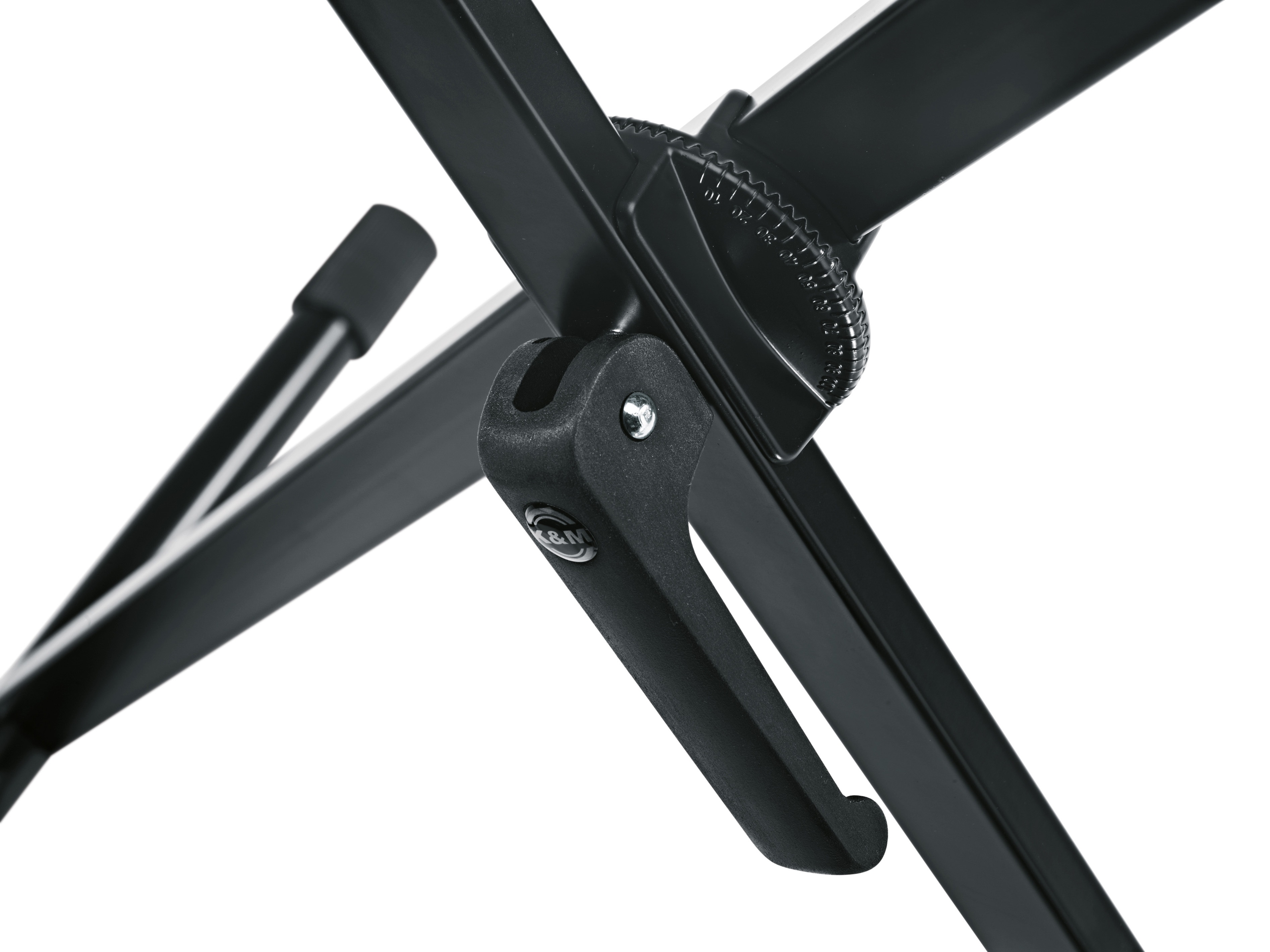 Klávesový stojan Robustný stojan na klávesnicu typu X s uzamykacím systémom na mimoriadne nízke nastavenie. Ergonomická rukoväť umožňuje veľmi rýchle a jednoduché nastavenie výšky a zaručuje maximálnu bezpečnosť vášho nástroja. Konštrukcia je vyrobená z odolnej ocele a všetky konce stojana obsahujú pogumované krytky pre maximálnu stabilitu. Stojan je možné rozšíriť o nadstavec pre druhú klaviatúru.