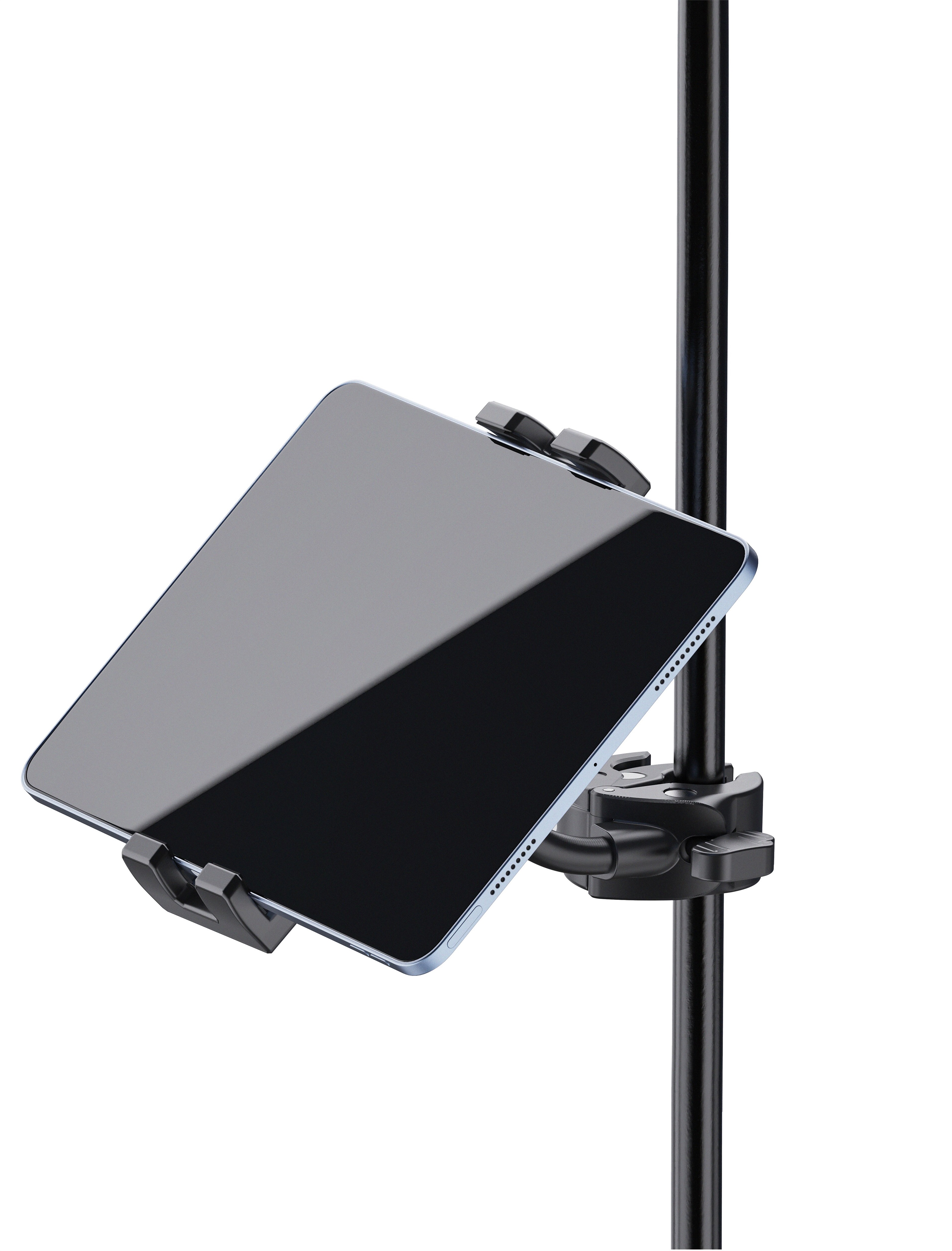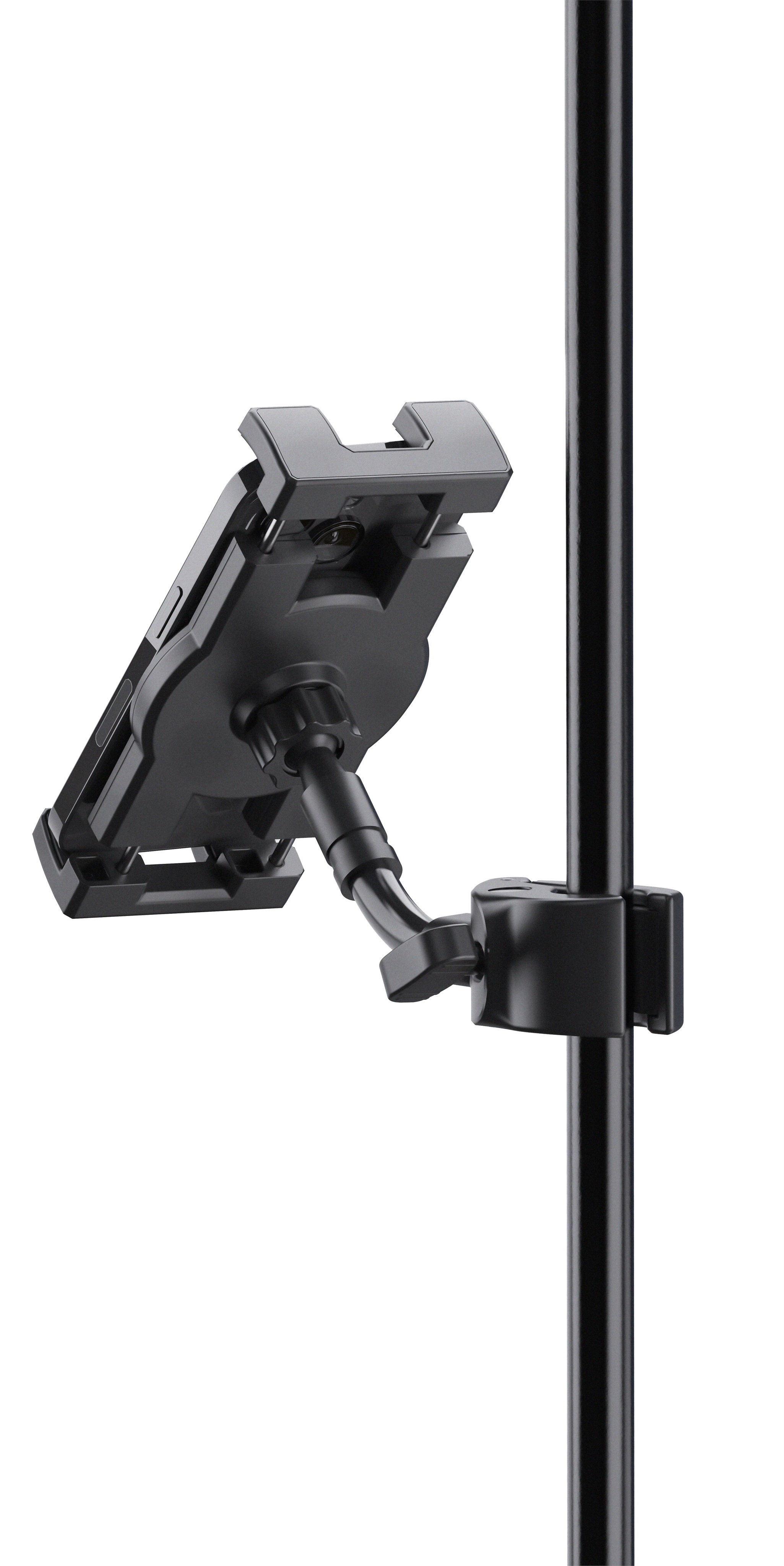 Držiak na tablet König & Meyer 19764 je držiak vhodný pre smartfóny a tablety. Šírku upnutia možno meniť od 120 do 245 mm a vďaka hĺbke 15 mm možno elektronické zariadenia používať s hrubšími krytmi alebo puzdrami. Ovládanie je rýchle a jednoduché. Stačí roztiahnuť gumou chránené upínacie čeľuste a utiahnuť ich silou pružiny. Vďaka guľovému kĺbu možno držiak nakláňať nahor a nadol a otáčať o 360°. Flexibilné montážne rameno umožňuje ďalšie individuálne polohovanie. Robustný upínací prvo