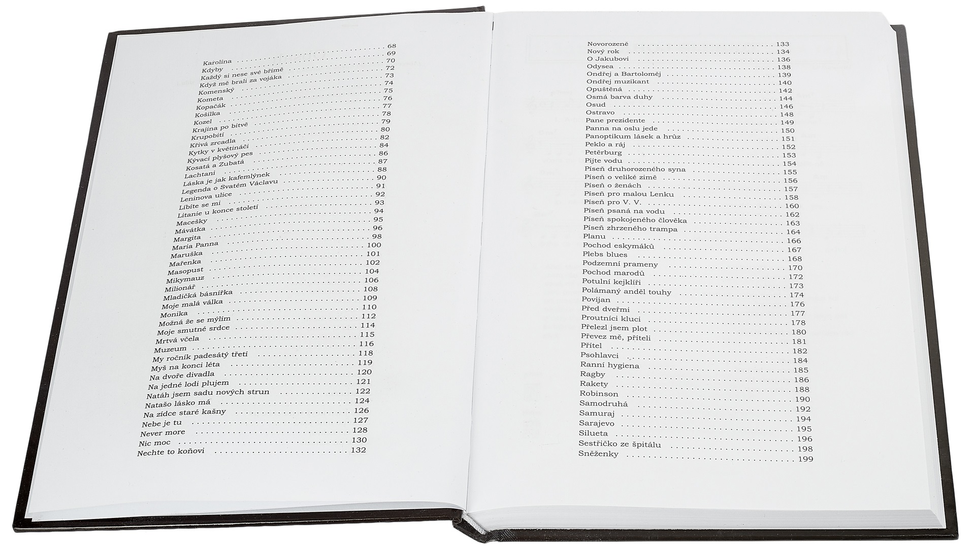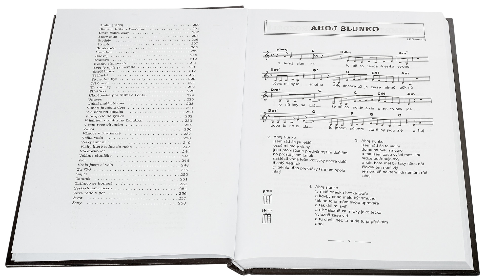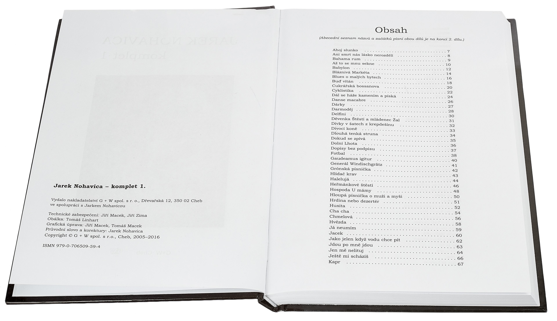 Spevník Spevník populárneho speváka a skladateľa Jareka Nohavicu obsahuje takmer 200 jeho najznámejších piesní. Každá pieseň je doplnená poznámkou o LP, na ktorom bola vydaná. Spevník obsahuje aj notový zápis každej piesne, akordy, texty a slabiky každého verša napísané pod notovou osnovu. Zoznam piesní: 1. Ahoj slunko (Ahoj slnko) 2. Ani smrt nás lásko nerozdělí (Ani smrť nás nerozdelí) 3. Bahama rum (Bahamský rum) 4. Až to se mnu sekne (Keď sa mi to podarí) 5. Babylon 6. Bláznivá Markéta (Bláznivá Markéta
