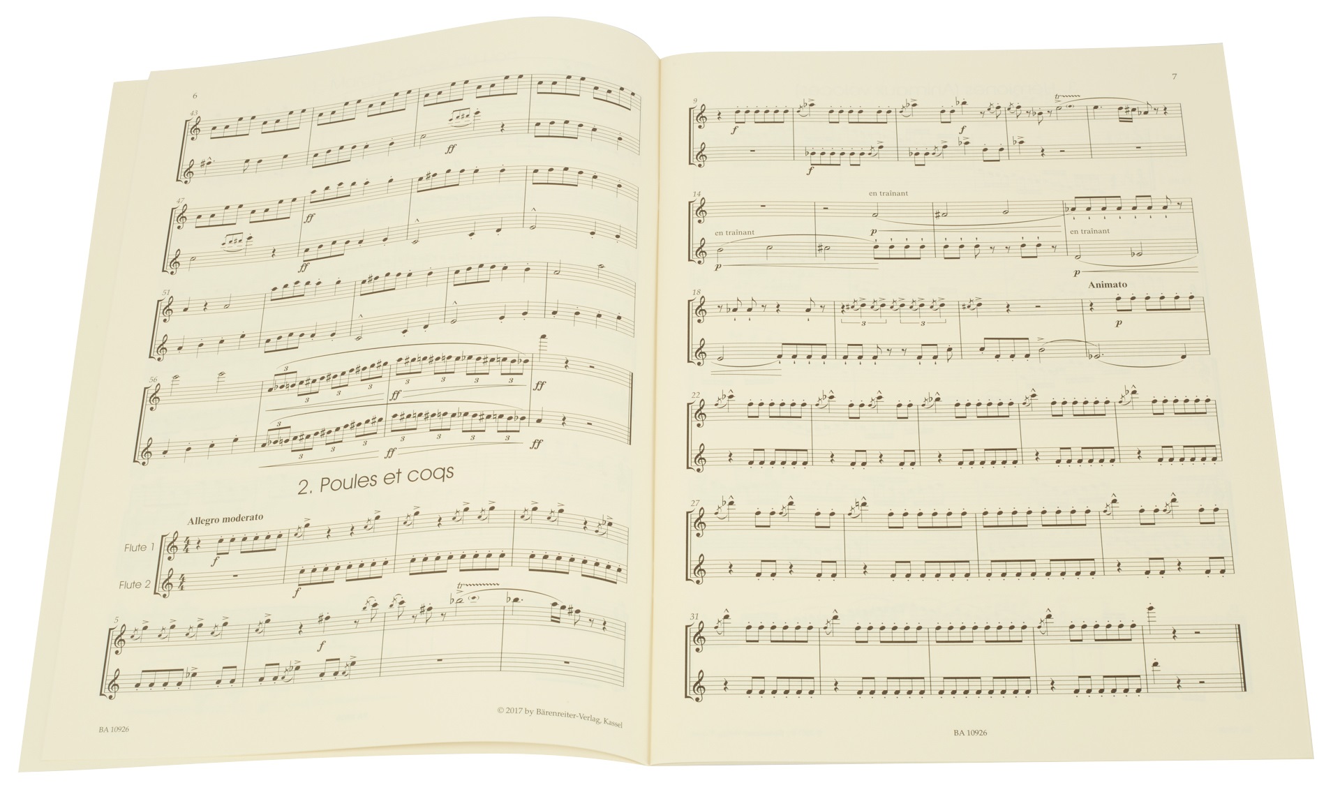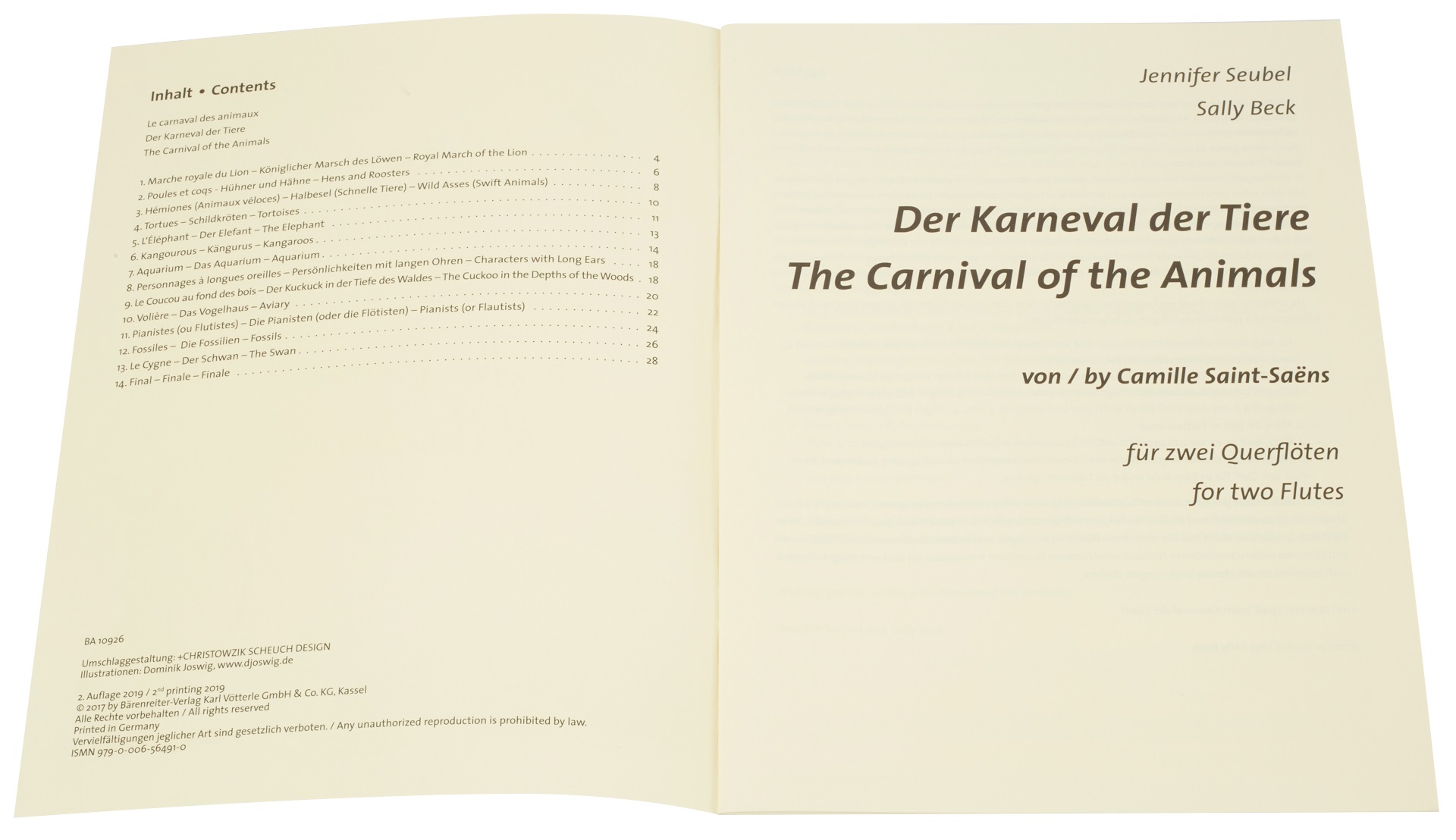 Noty pro dvě příčné flétny Karneval zvierat je bezpochyby jedným z najpopulárnejších diel Camille Saint-Saënsa. Saint-Saëns sa obával, že táto populárna kompozícia poškodí jeho reputáciu vážneho skladateľa, a preto ju počas svojho života odmietol publikovať. Teraz Jennifer a Sally Beck, ktoré tvoria flautové duo „Duo Noble“, upravili toto slávne dielo pre dve priečne flauty. Premena hlavných nástrojov, tónov a melódií z orchestrálnej verzie na len dve časti predstavovala osobitnú výzvu, ktorej výsledkom je