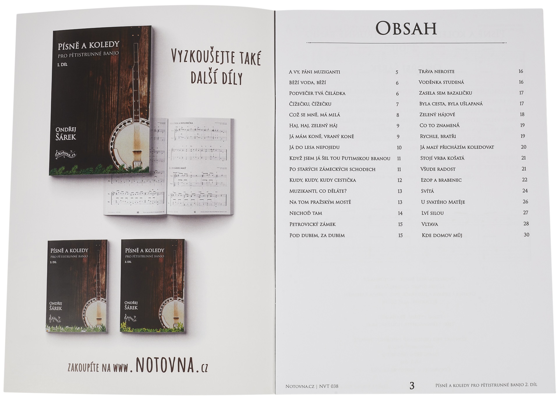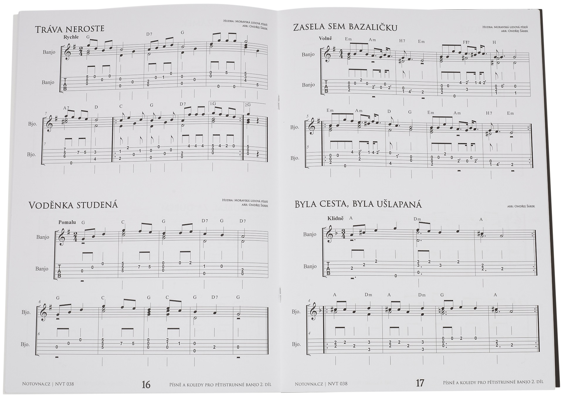 Škola hry na bendže Pre všetkých, ktorí sa zaujímajú o hru na banjo, som upravil 18 ľudových piesní a 6 kolied z Českej republiky. Nájdete tu však aj piesne Jaroslava Ježka, Karla Hašlera a klasiku českej hudby. Skladby sú upravené veľmi jednoducho, väčšinou len melódia a jeden hlas, ktoré určujú harmóniu. Tieto úpravy sú vhodné aj pre začiatočníkov. Akordy sú napísané nad notami, aby vás mohol niekto sprevádzať. Informácie pre hráčov bluegrassu: všetko je aranžované tak, že potrebujete len tri prsty pravej