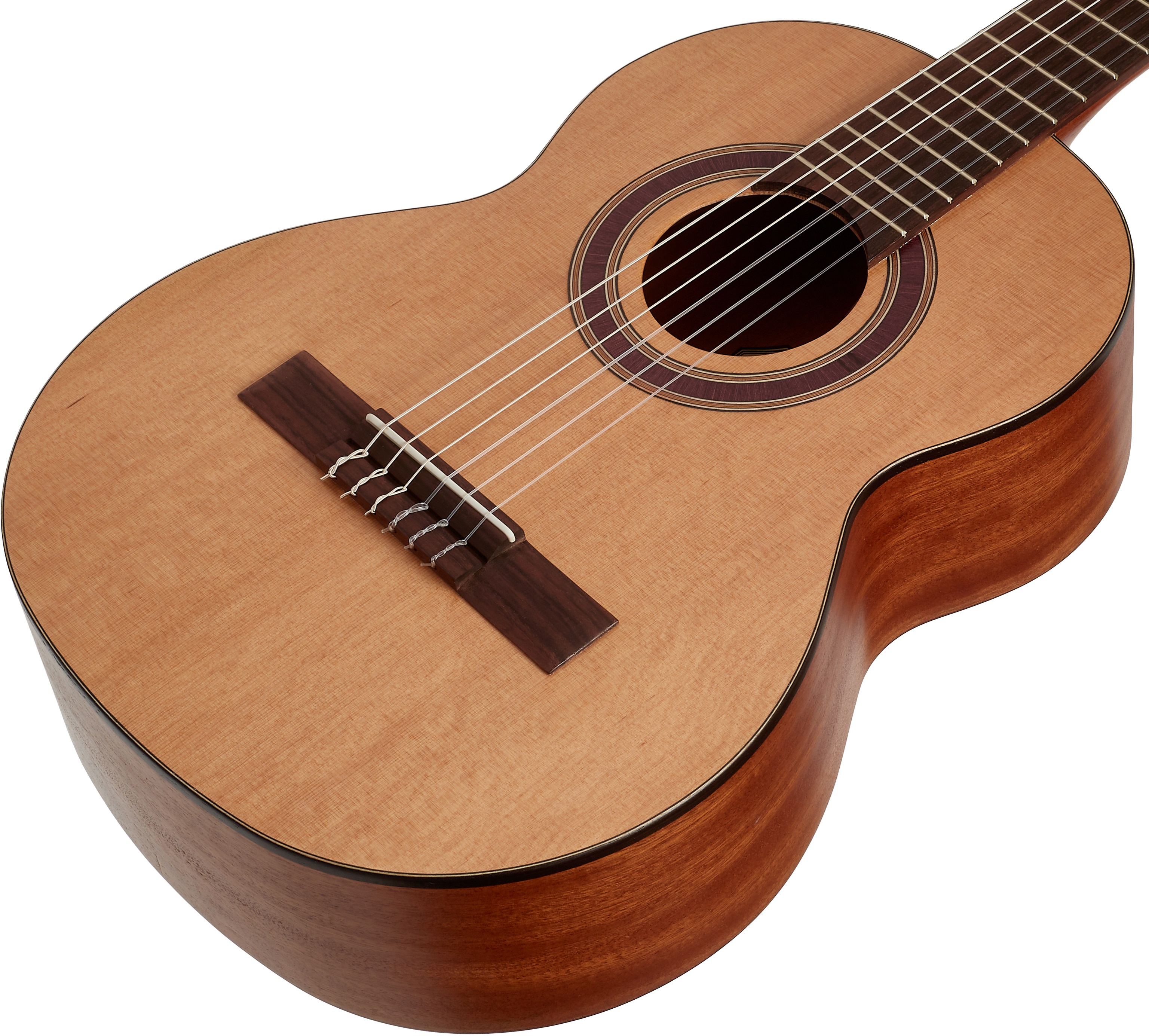 Detská klasická gitara Camellia (1/2) je polotuhá, ručne vyrobená, klasická detská gitara v veľkosti 1/2 z dielní renomovanej európskej značky Kremona. Predná časť gitary je vyrobená z masívneho cédru, zatiaľ čo zadná časť a boky sú vyrobené z laminovaného mahagónu. Otvorená povrchová úprava zdôrazňuje prirodzenú štruktúru dreva. Mahagónový krk má palisandrový hmatník. Struny sú pripevnené k niklovým ladiacim mechanizmom a palisandrovému mostíku prostredníc