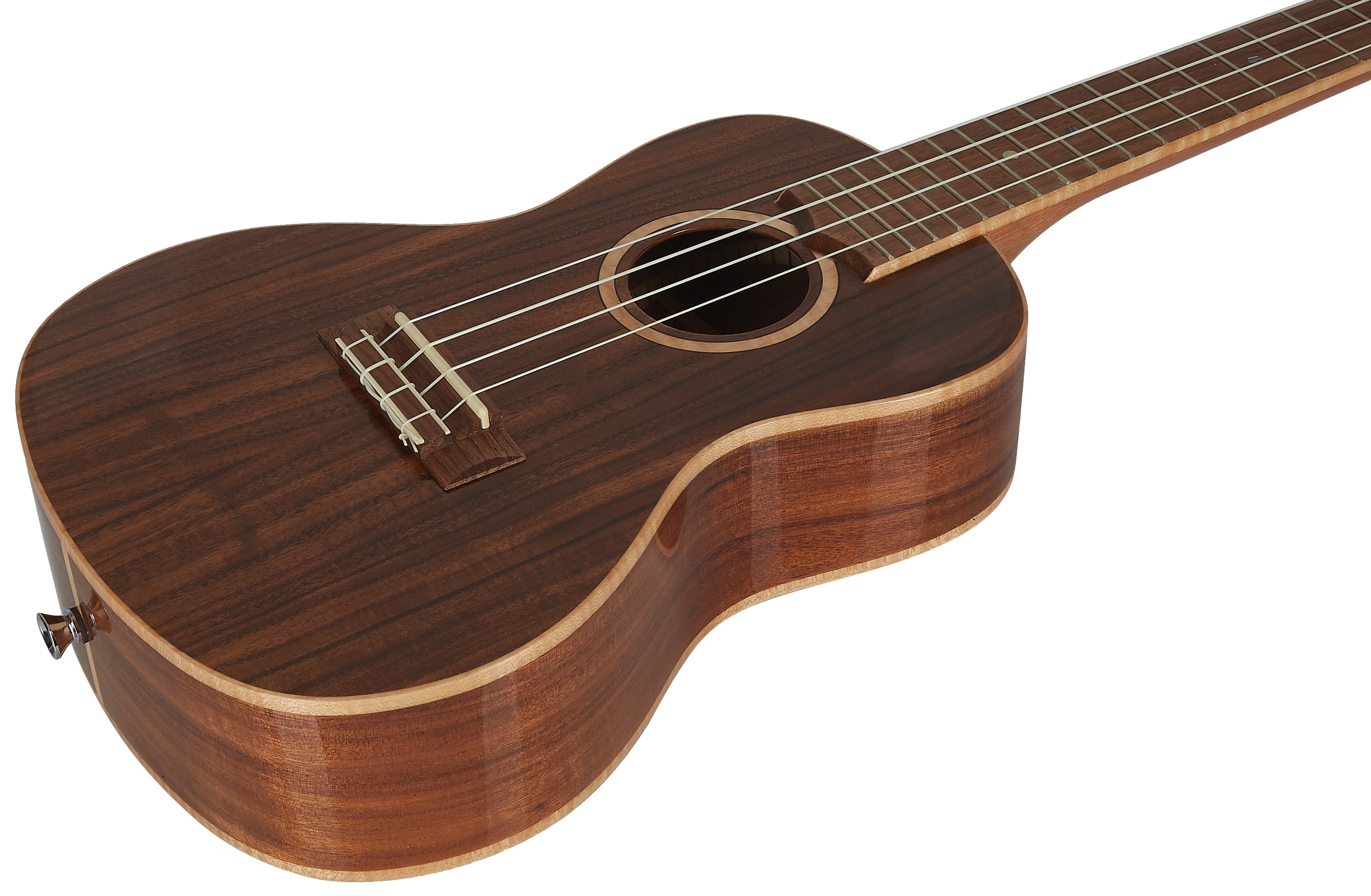 Akustické ukulele Celomasívne telo tohto koncertného ukulele je vyrobené z agátového dreva, ktoré nástroju dodáva vyvážený, teplý tón s dobrou zvukovou projekciou a sustainom. Orechový hmatník je osadený osemnástimi pražcami s polohovými značkami pre ľahšiu orientáciu. Širší krk nástroja a nultý pražec ponúkajú pohodlné uchytenie a pohyb hmatníka, zatiaľ čo sedlo NuBone XB a nultý pražec poskytujú dobrý sustain strún. Stabilitu ladenia zabezpečuje kvalitná Deluxe Grover mechanika s otvoreným kohútom a pochr